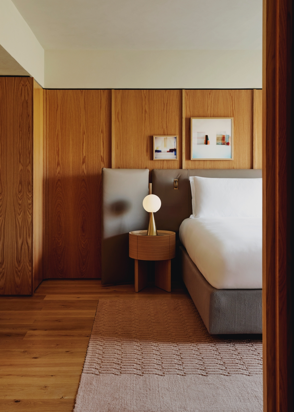 대신 복도에는 모더니즘의 토대를 마련한 바우하우스 부부인 애니와 요제프에게 경의를 표하는 파올로 자니Paolo Zani)의 알버스 러그(Albers rug)로 만든 '러너'가 놓여 있습니다. 전통에서 영감을 받아 현대적으로 재해석한 100% 내화성 울 소재의 특별한 '핸드룸' 버전으로 제작되어 세련되면서도 심플한 분위기를 연출하며, 고급스러움도 신중하게 결정해야 한다는 새로운 기준을 정립하고자 하는 아이디어를 담고 있습니다. 거의 보이지 않는 입구 문이 있는 호텔도 마찬가지입니다. RSHP가 디자인한 '돛 모양의' 구조가 눈에 띄는 이 호텔은 전용 골목 끝에 있는 은밀한 안뜰을 통해 호텔에 들어섭니다.