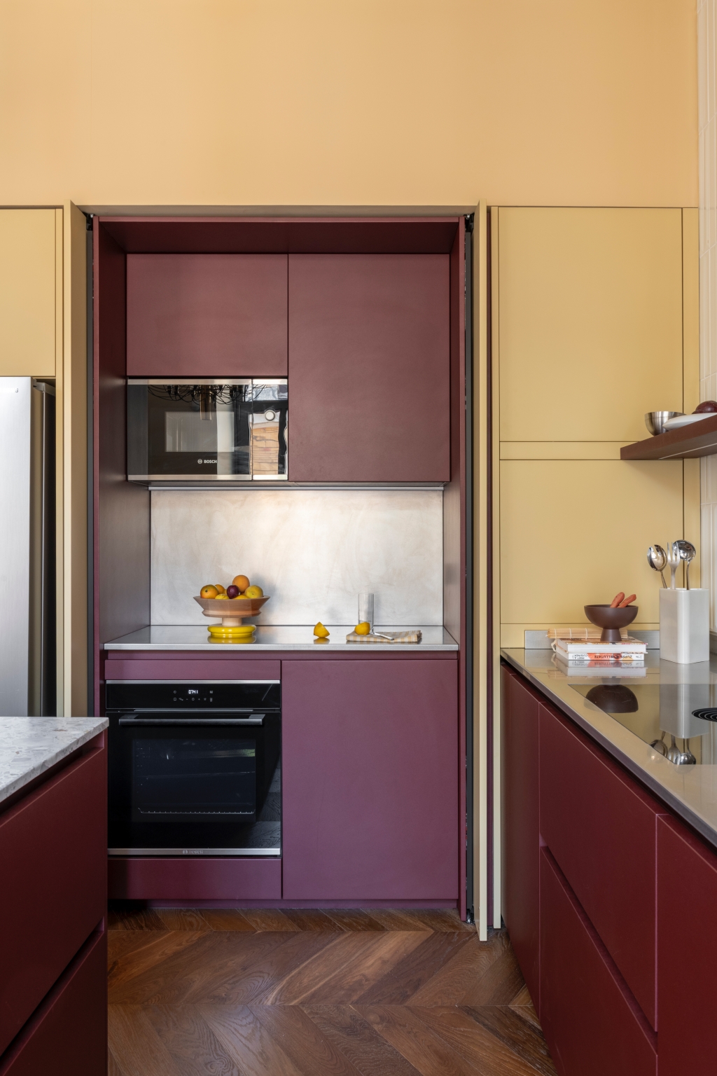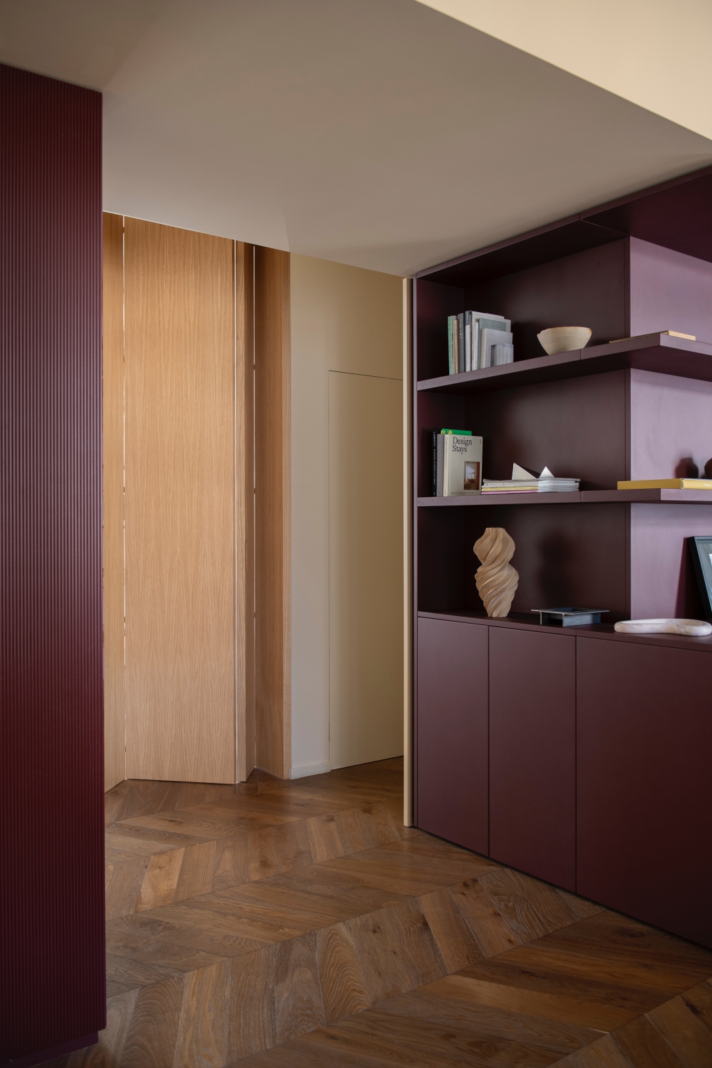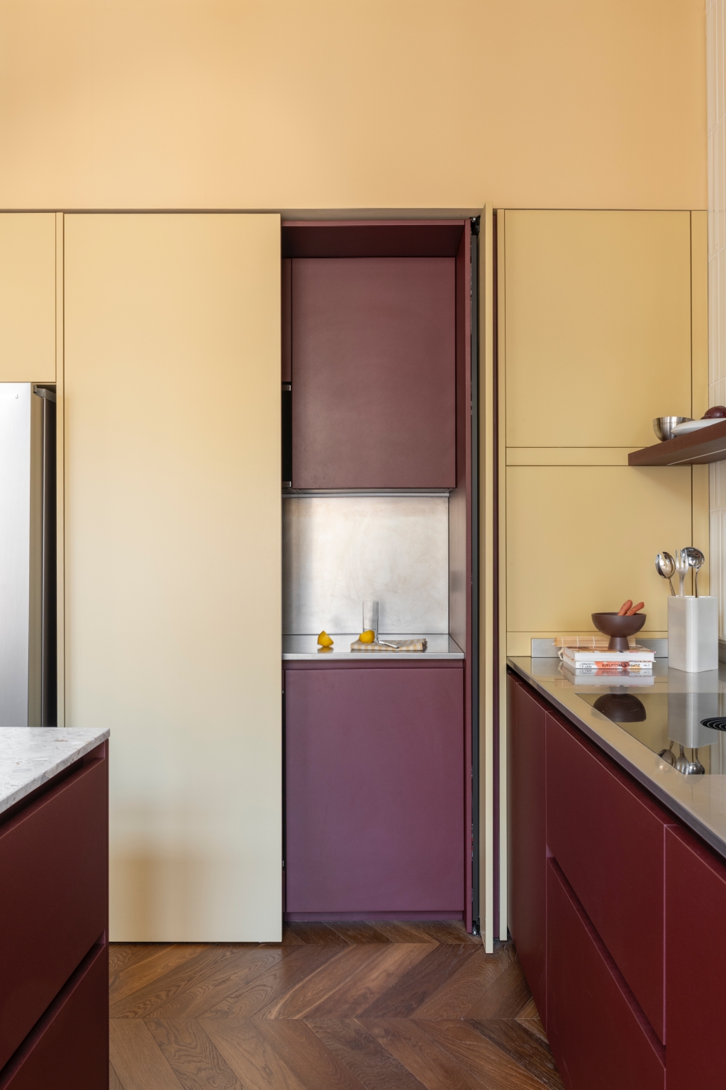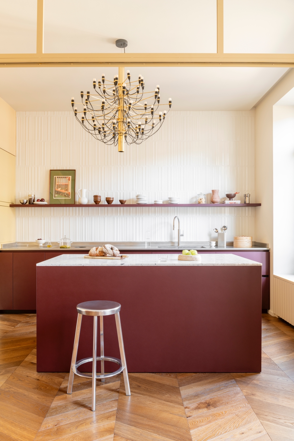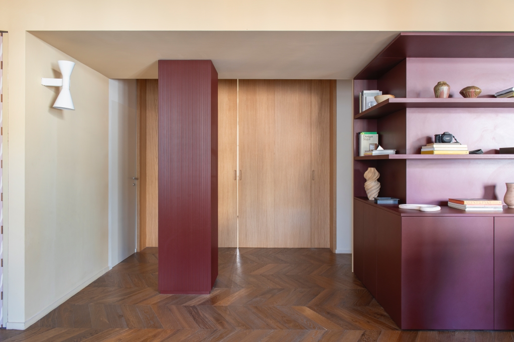 Mo.1950은 공간의 핵심 요소들을 맞춤 제작하며 프로젝트의 정체성을 더욱 선명하게 드러냅니다. 버건디 마감과 테라초 대리석, 손으로 브러싱한 스테인리스가 적용된 Cesar Maxima 2.2 주방은 브랜드 특유의 섬세한 마감 기술을 보여주는 대표적 예입니다. 테라초 상판을 얹은 아일랜드는 주방의 중심점으로 작동하고, 기하학적 돌출을 더한 유광 화이트 타일 벽면은 시각적 깊이를 부여합니다. 투명한 유리 파티션은 거실과 주방을 분리하면서도 유기적 연결을 유지해, 변화하는 생활 패턴에 유연하게 대응합니다