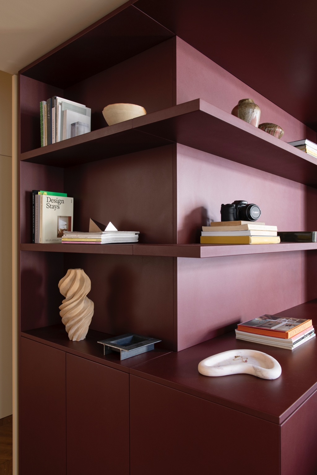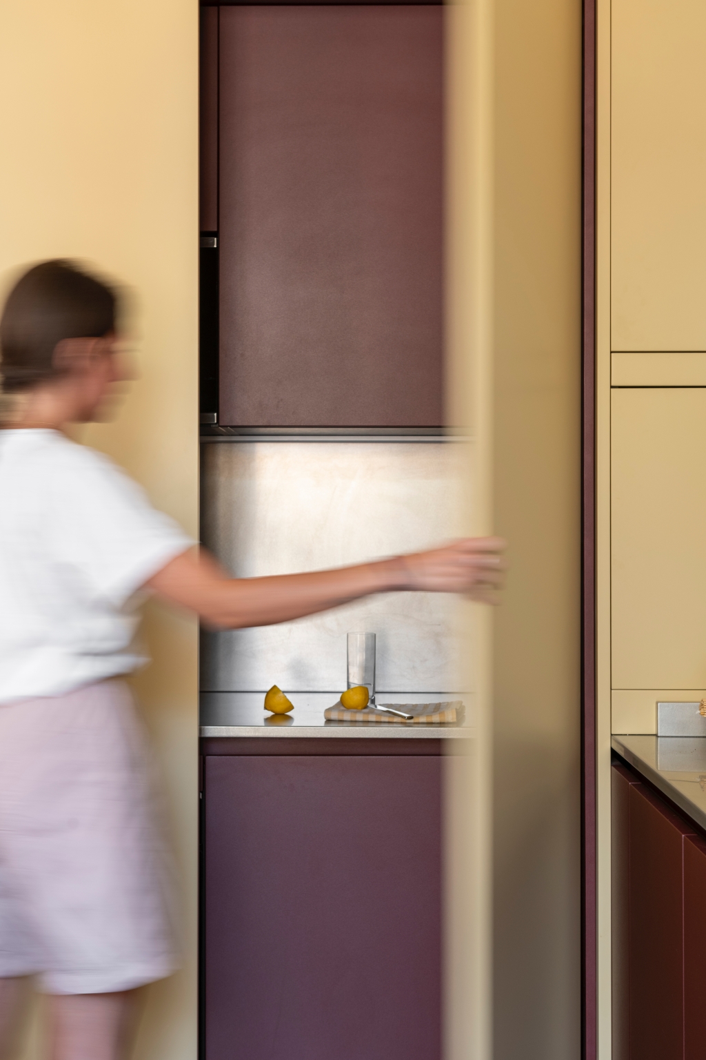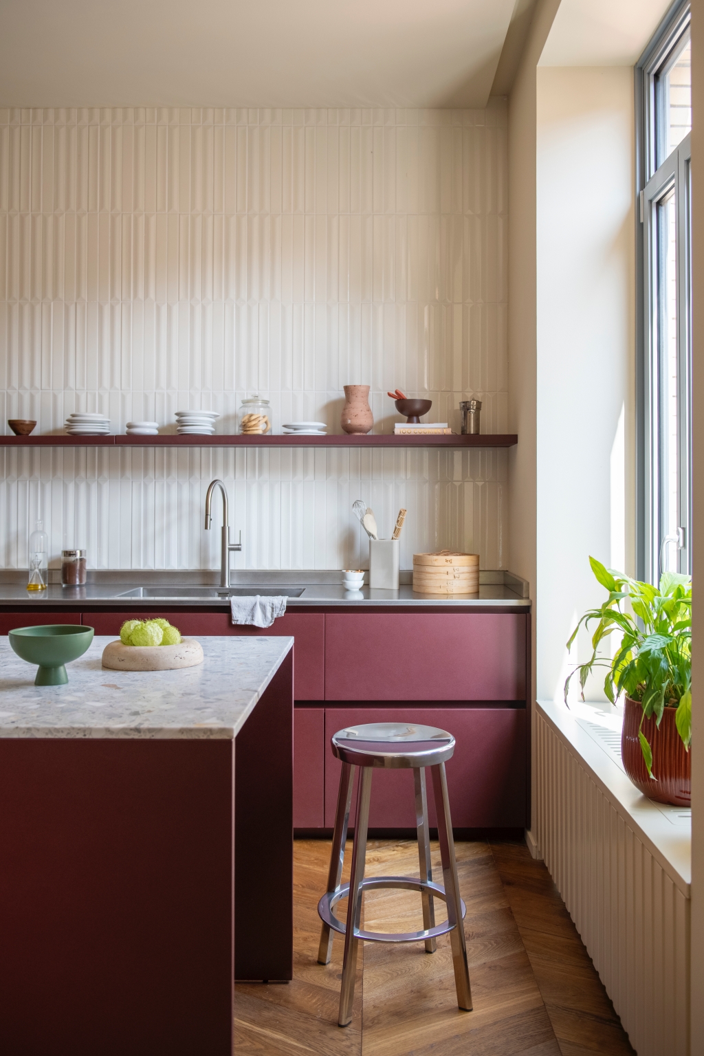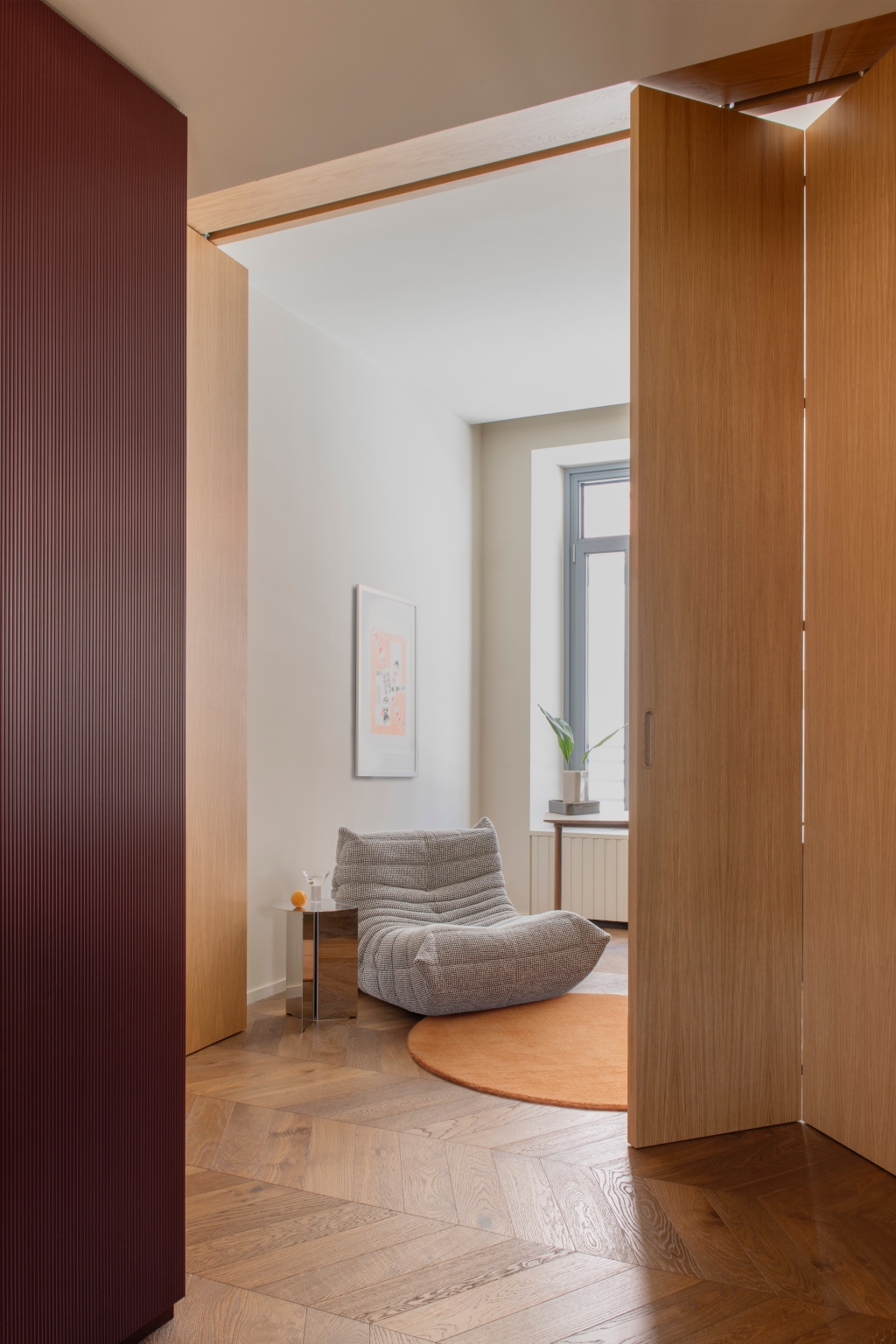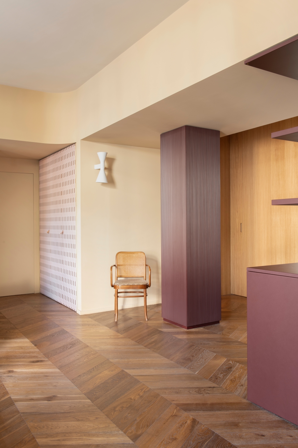 Mo.1950은 공간의 핵심 요소들을 맞춤 제작하며 프로젝트의 정체성을 더욱 선명하게 드러냅니다. 버건디 마감과 테라초 대리석, 손으로 브러싱한 스테인리스가 적용된 Cesar Maxima 2.2 주방은 브랜드 특유의 섬세한 마감 기술을 보여주는 대표적 예입니다. 테라초 상판을 얹은 아일랜드는 주방의 중심점으로 작동하고, 기하학적 돌출을 더한 유광 화이트 타일 벽면은 시각적 깊이를 부여합니다. 투명한 유리 파티션은 거실과 주방을 분리하면서도 유기적 연결을 유지해, 변화하는 생활 패턴에 유연하게 대응합니다