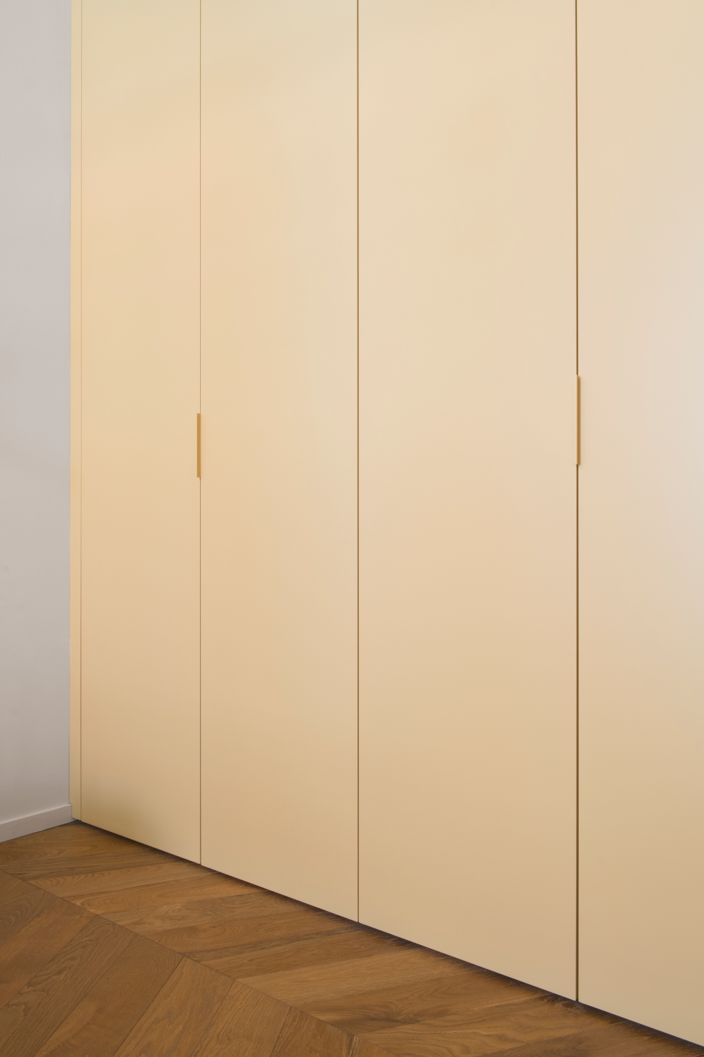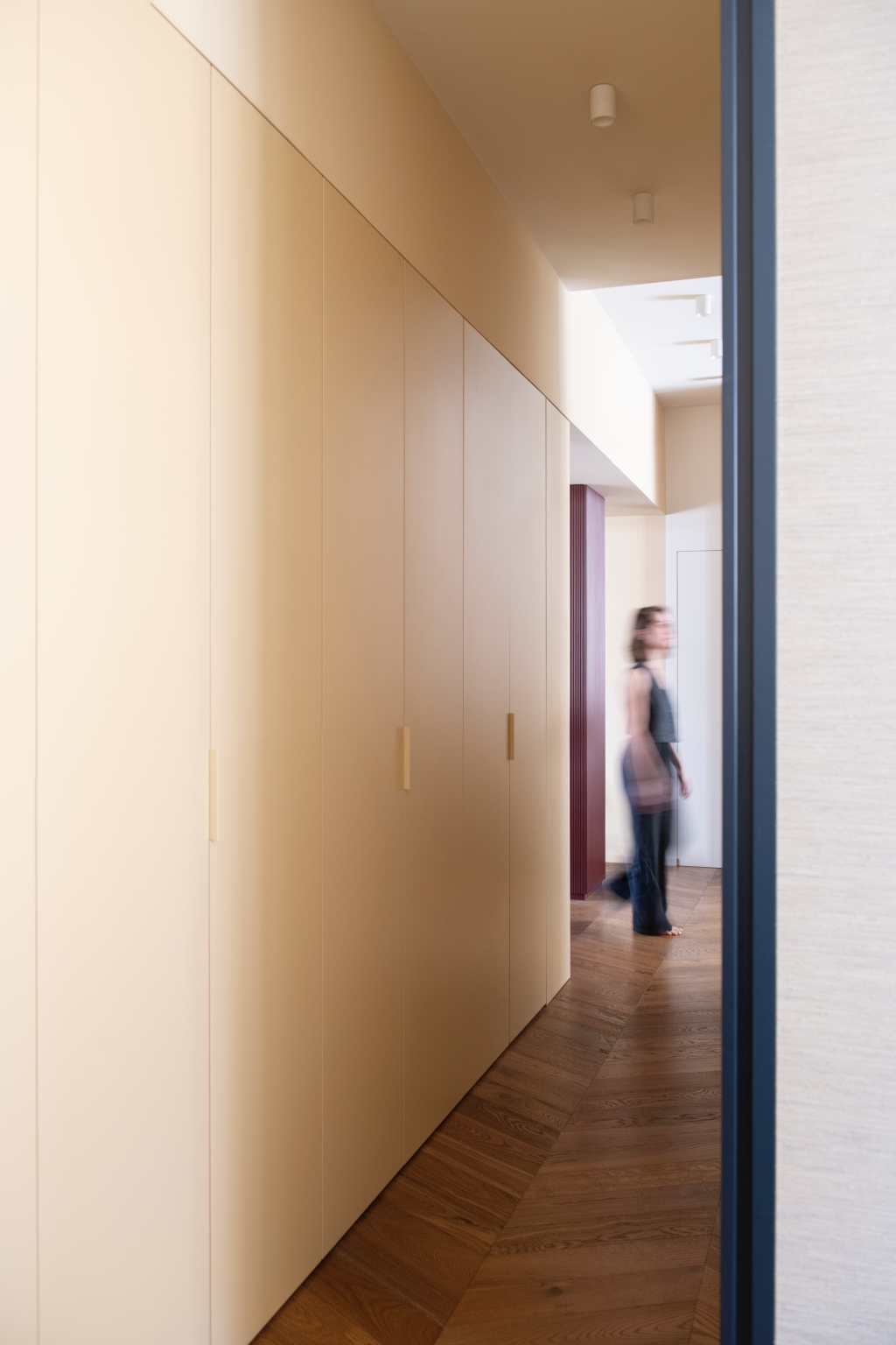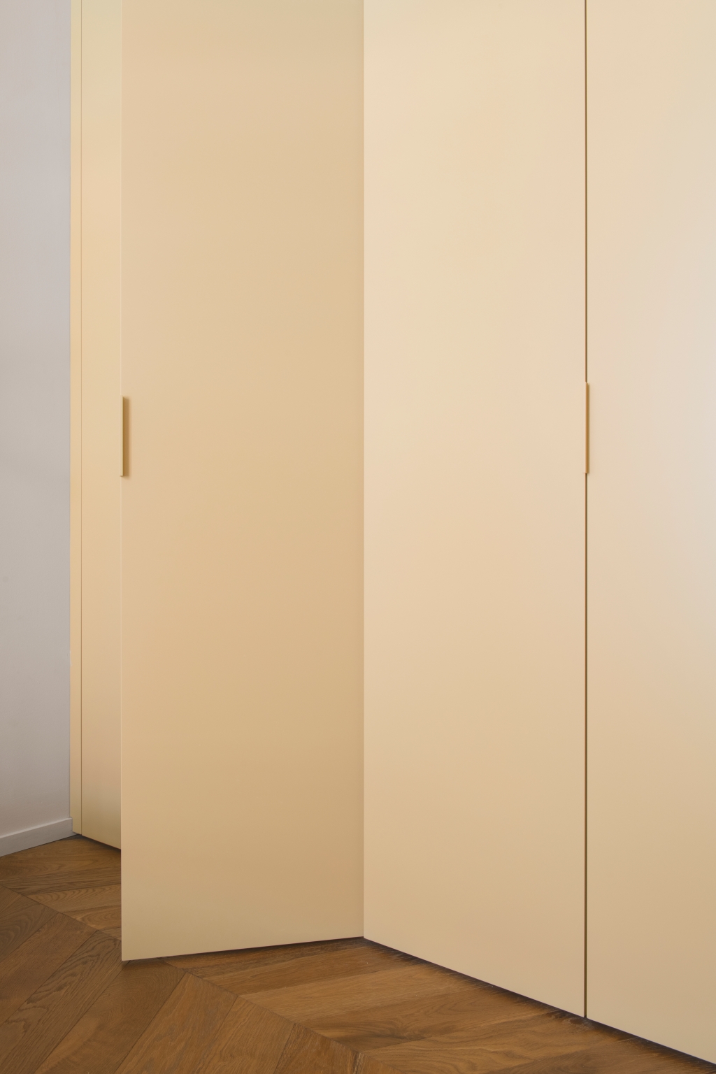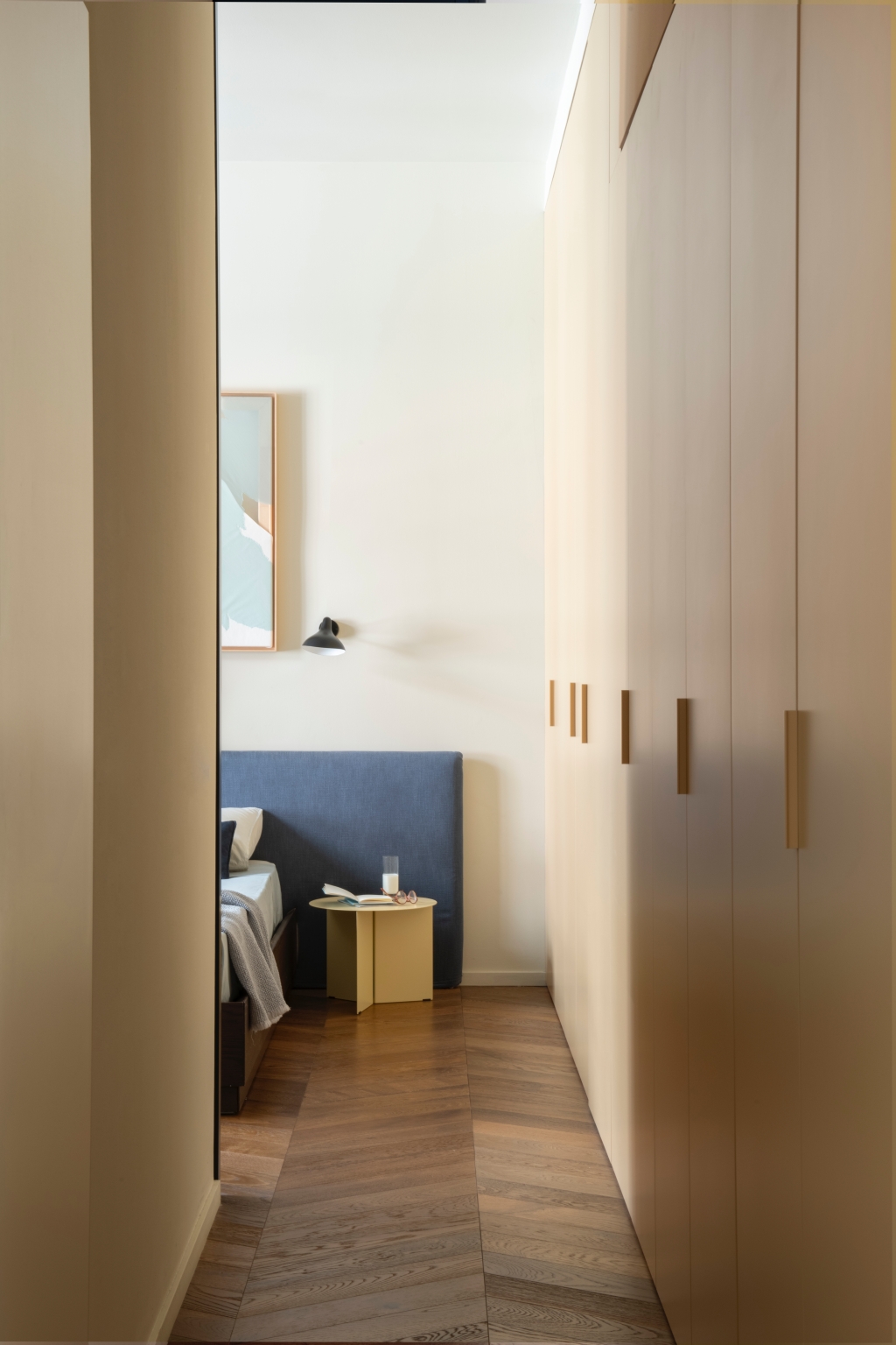 침실과 현관에서도 맞춤 설계의 정교함은 이어집니다. 메인 스위트에는 매트 래커 마감과 센서 조명을 갖춘 Caccaro Freedhome 옷장이 설치되어 기능성과 미감을 동시에 충족합니다. 현관에서는 가죽 손잡이를 더한 기하학 패턴의 벽지 문 뒤에 수납을 숨겨 공간의 흐름을 깔끔하게 정돈했습니다. 프라이빗 욕실은 우드 파켓과 네이비 레진이 자연스럽게 이어지며 욕조 영역을 감싸고, 블루 인서트가 들어간 테라초 샤워 공간과 머스타드 컬러의 독립형 세라믹 세면대가 예상 밖의 조화를 이루며 강렬한 인상을 남깁니다.