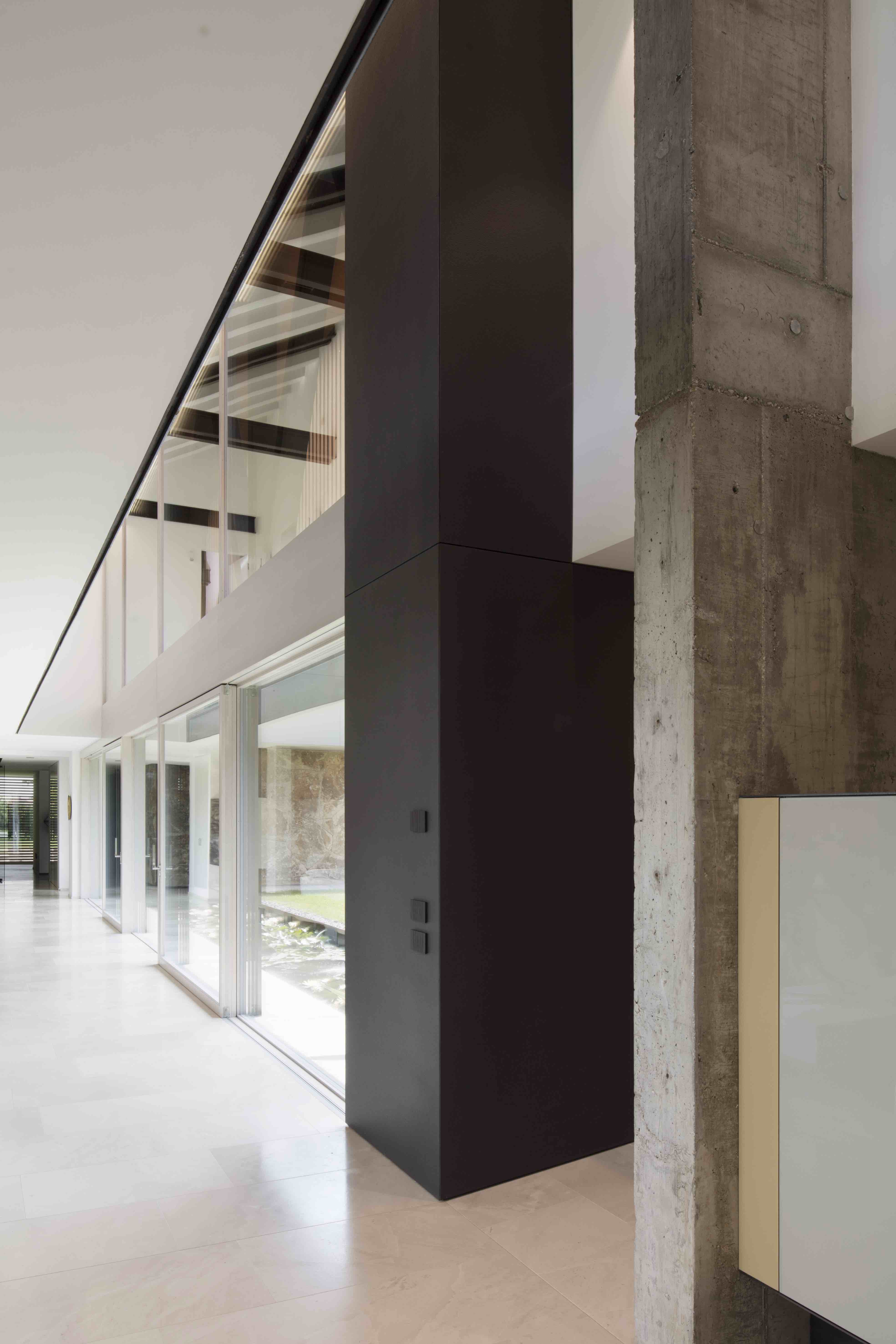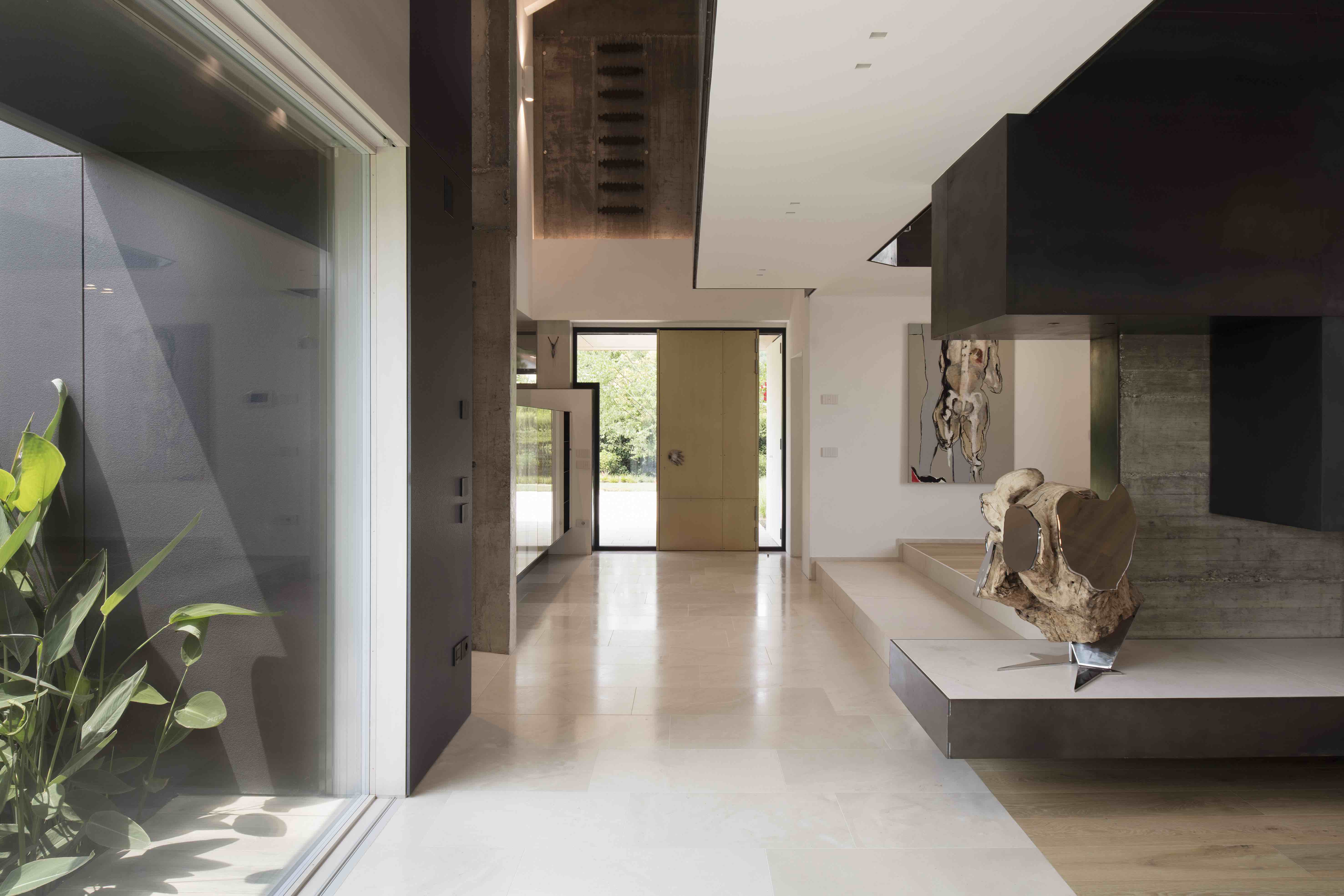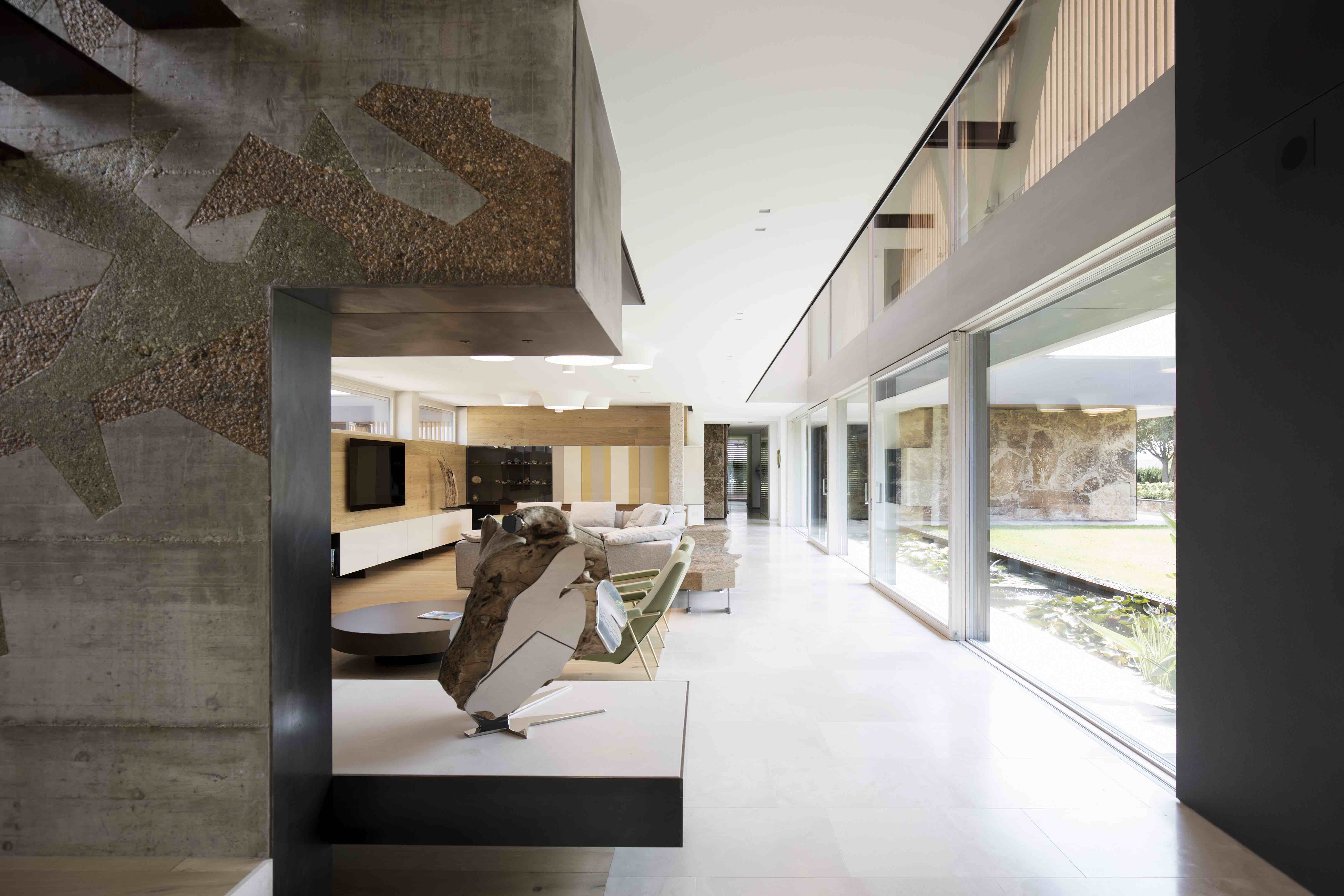 5,000 평방미터의 넓은 공원에 위치한 이곳에는 오솔길과 건물의 조각적인 형태가 조화롭게 배치되어 있으며, 넓은 창문과 문을 통해 정원이 내려다보이는 거실을 배치하고, 식당과 주방은 그늘이 있는 부분에 배치해 효율성을 높였습니다. 층계는 격자 트러스로 만들어 긴 갤러리로 이어지며, 끝쪽에는 침실공간이 구성되어 있습니다. 야외 수영장쪽으로 오픈되어 있는, 웰빙 구역에는 사우나, 터키식 목욕탕, 자쿠지 등이 있으며, 창문을 넣어 외부 공간과 자연을 직접 경험할 수 있도록 만들어줍니다.