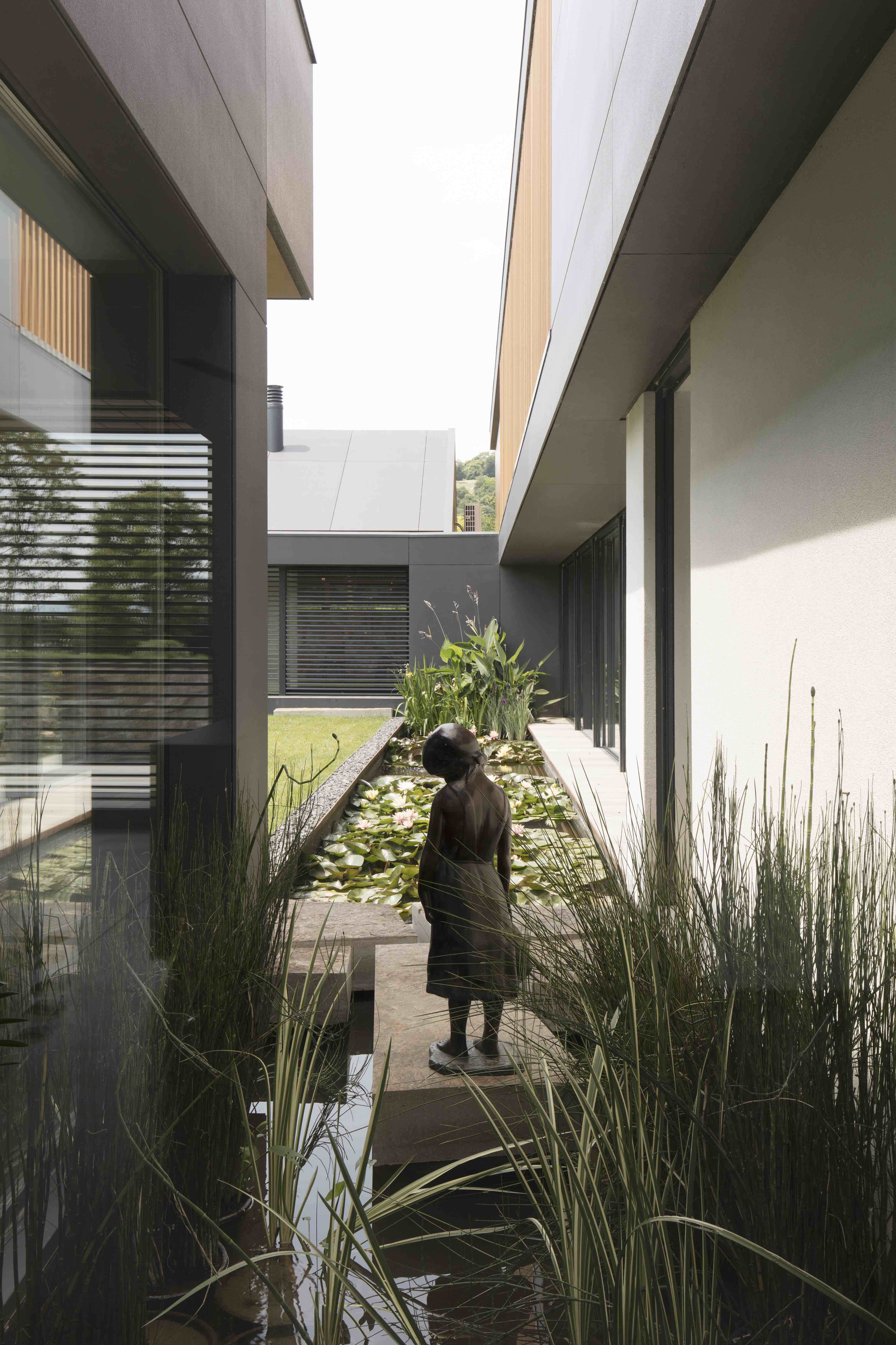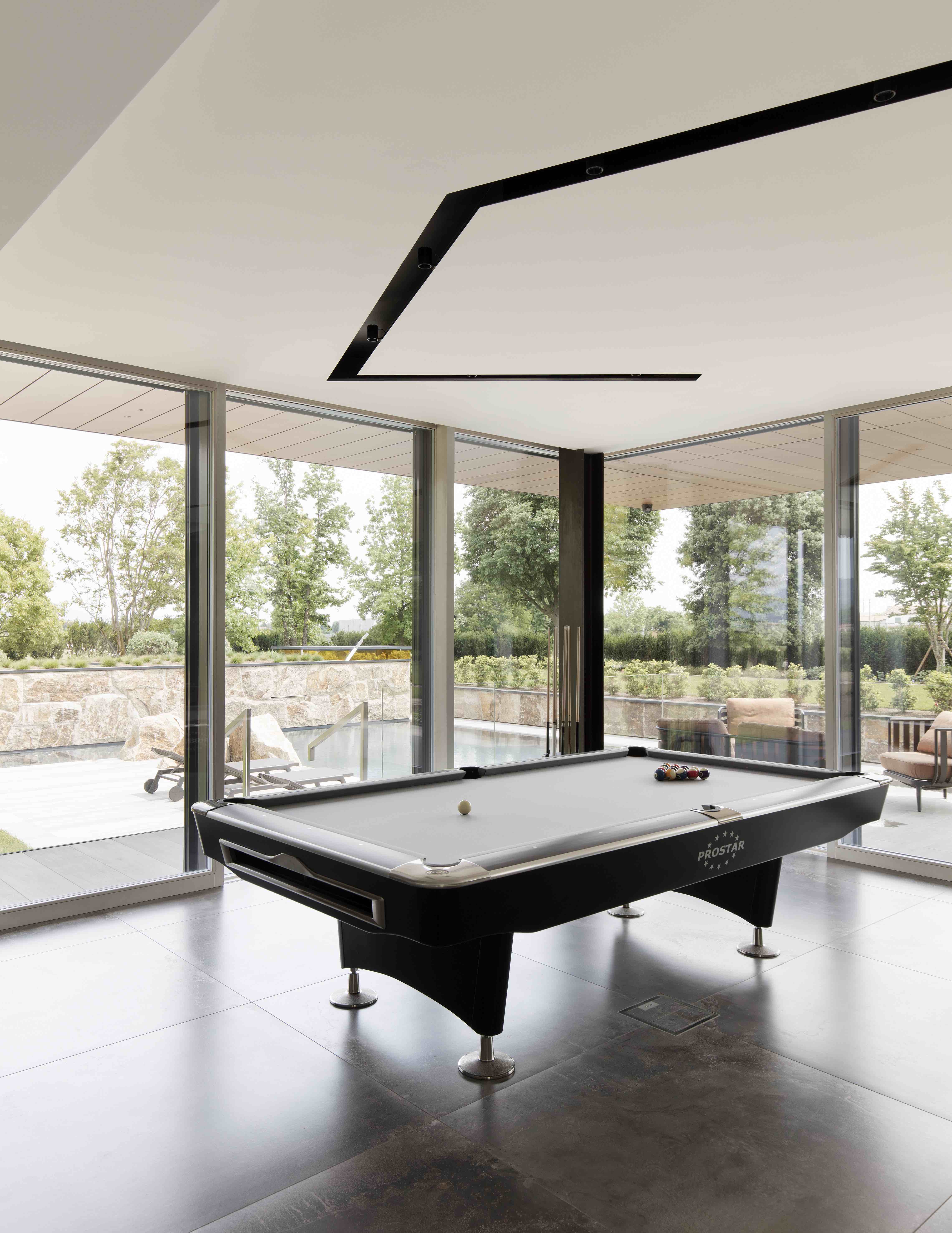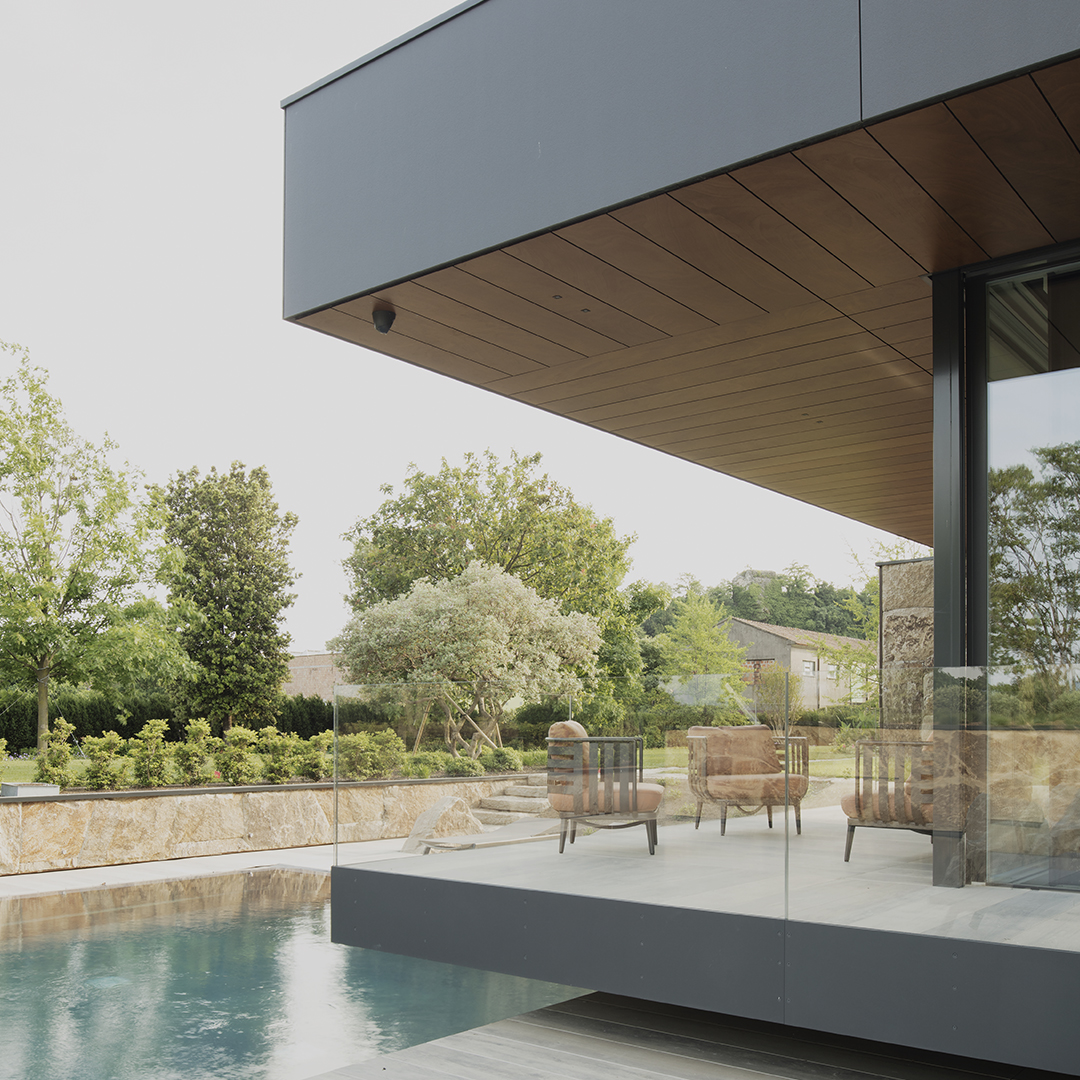 5,000 평방미터의 넓은 공원에 위치한 이곳에는 오솔길과 건물의 조각적인 형태가 조화롭게 배치되어 있으며, 넓은 창문과 문을 통해 정원이 내려다보이는 거실을 배치하고, 식당과 주방은 그늘이 있는 부분에 배치해 효율성을 높였습니다. 층계는 격자 트러스로 만들어 긴 갤러리로 이어지며, 끝쪽에는 침실공간이 구성되어 있습니다. 야외 수영장쪽으로 오픈되어 있는, 웰빙 구역에는 사우나, 터키식 목욕탕, 자쿠지 등이 있으며, 창문을 넣어 외부 공간과 자연을 직접 경험할 수 있도록 만들어줍니다.