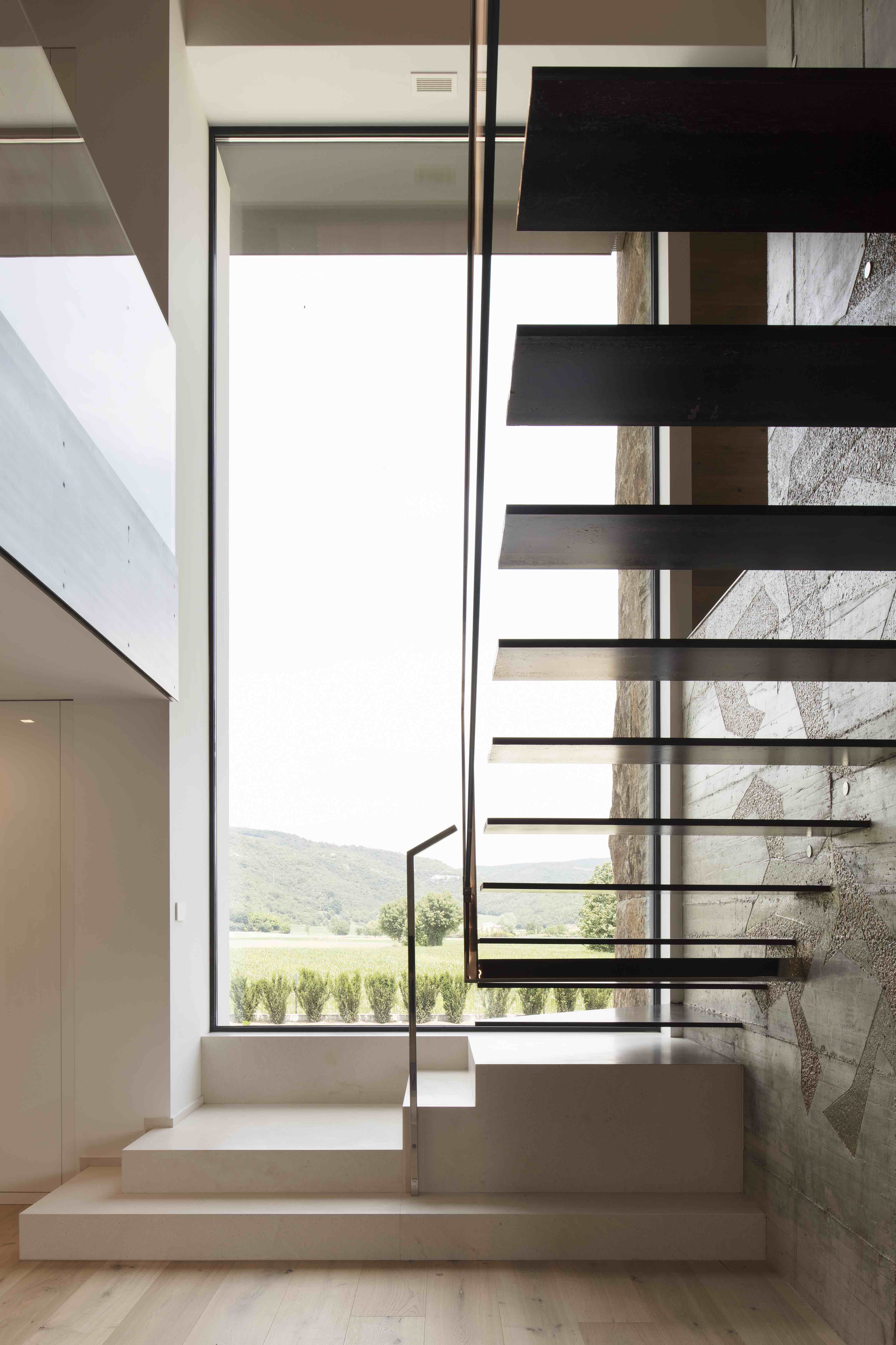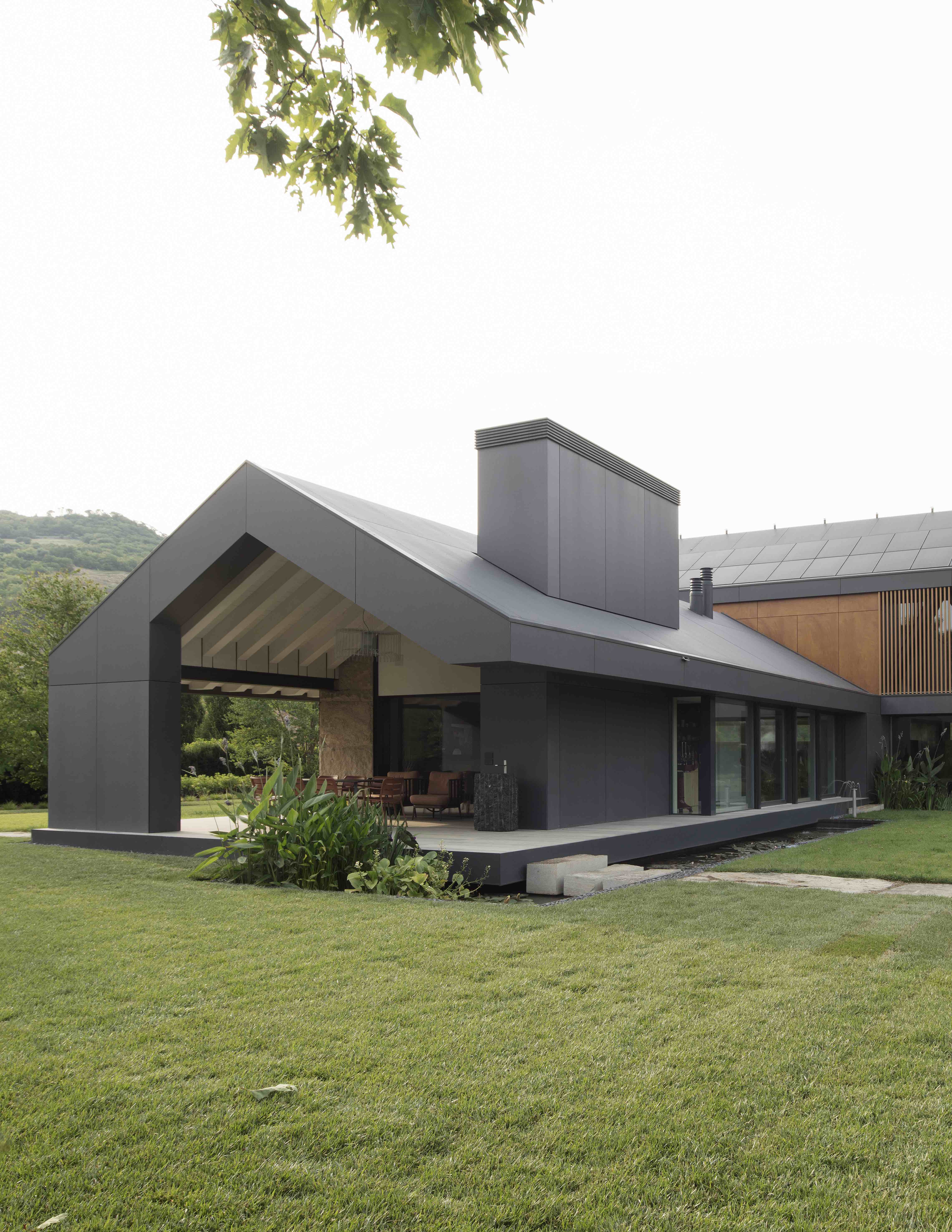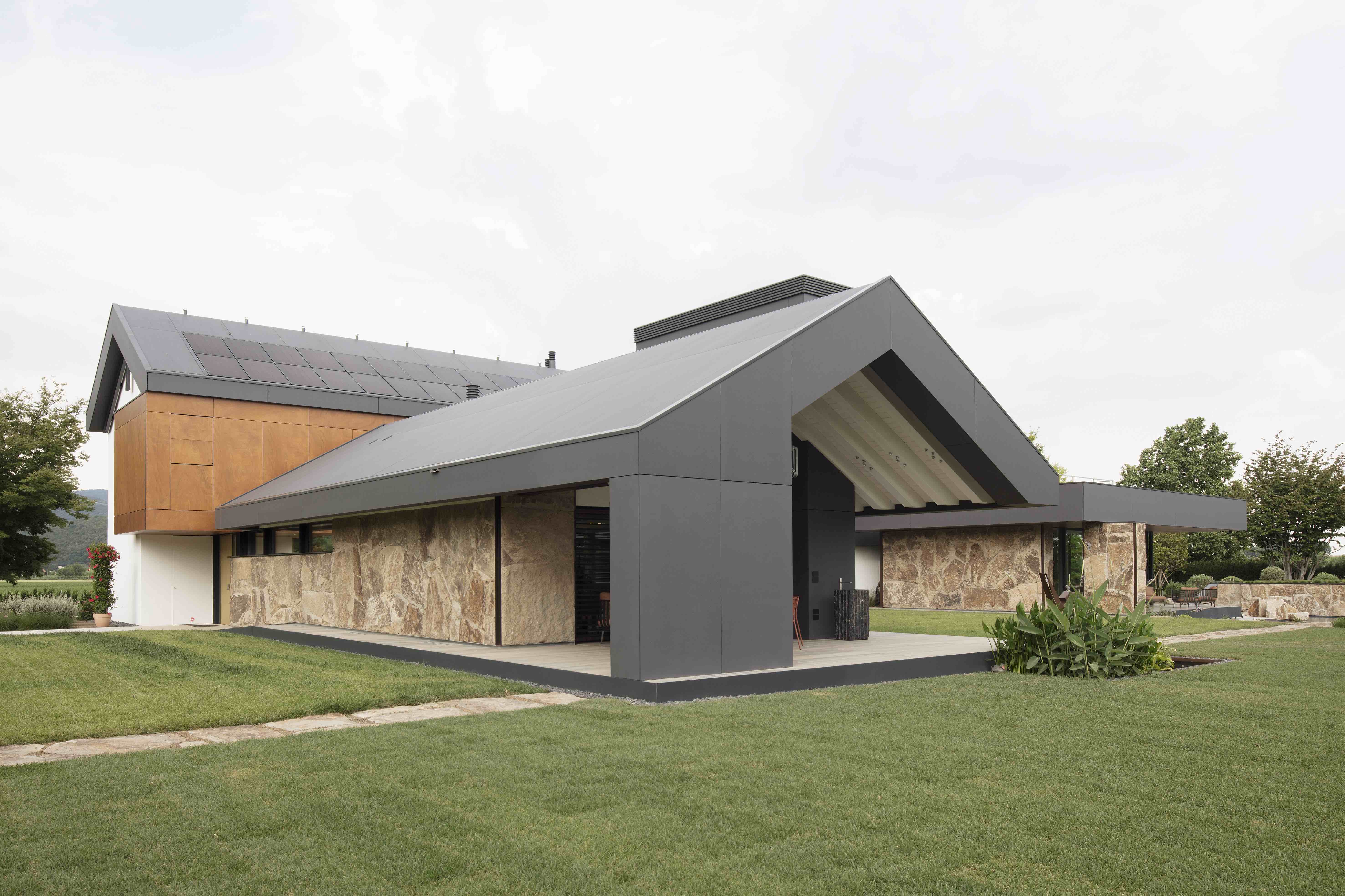 그는 이 지역의 전형적인 건축 요소를 참고해 기초적인 형태와 디자인을 진행했으며, 여기에 추가적으로 L자 모양의 구조물을 더했습니다. 총 표면적은 약 920 평방미터에 달하며, 1층의 외관은 완전히 화산암의 일종인 트라키테(trachyte)로 구성되어 있습니다. 트라키테는 이 지역에서 흔히 볼 수 있는 소재로 전체적으로 따뜻하고 감성적인 터치를 더해줍니다. 여기에 Lapitec사의 Nero Antracite를 사용해 좀더 감각적인 악센트를 더한 것이 특징입니다.