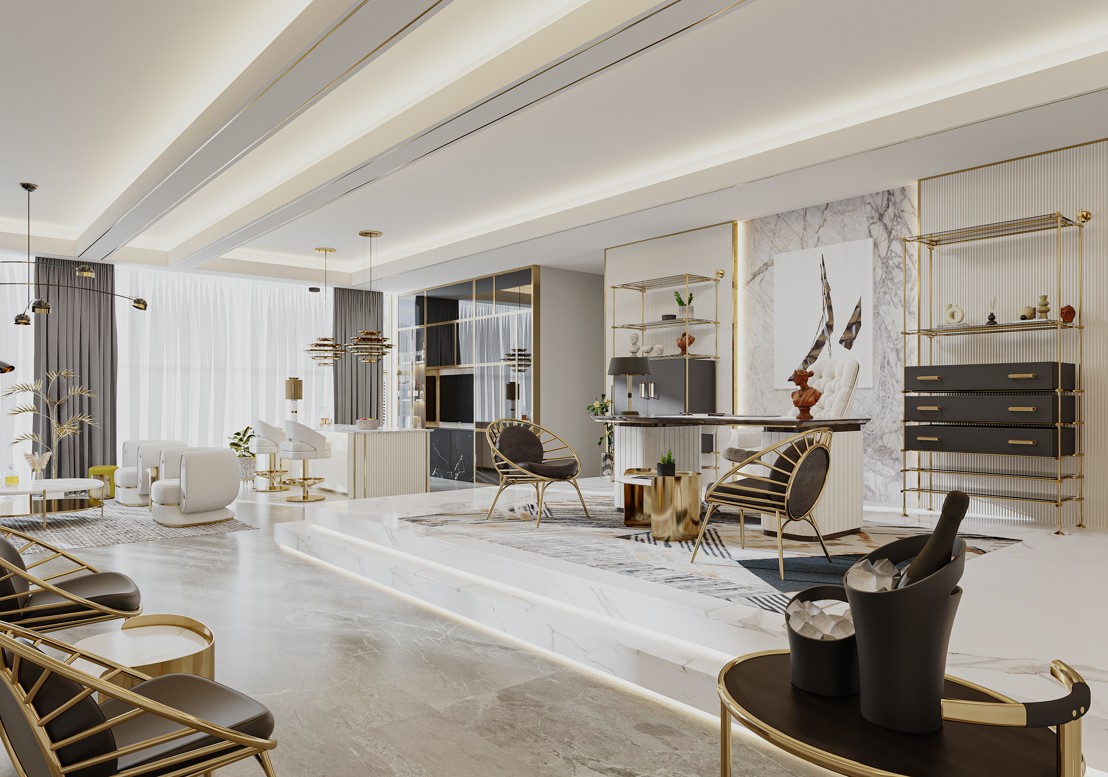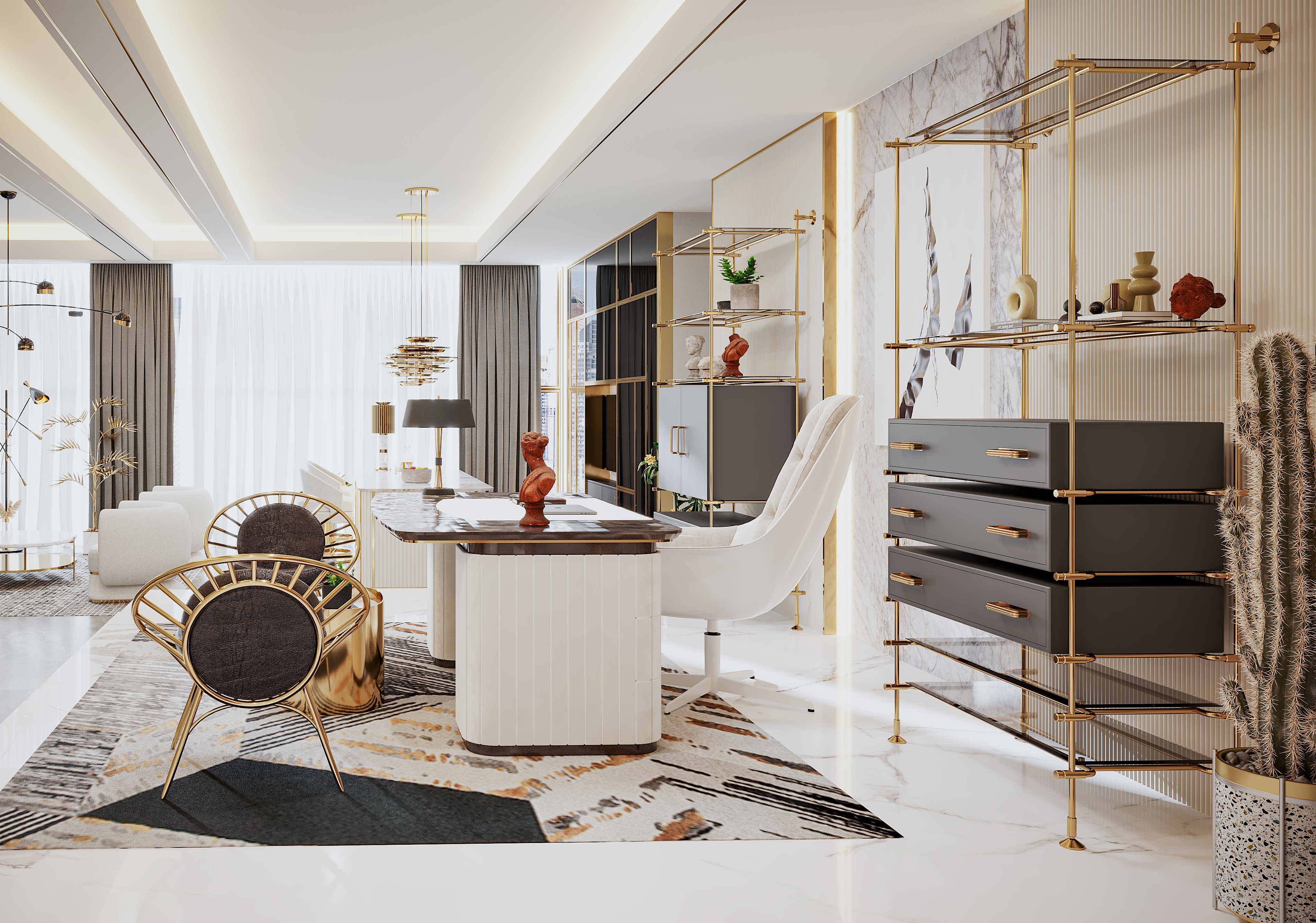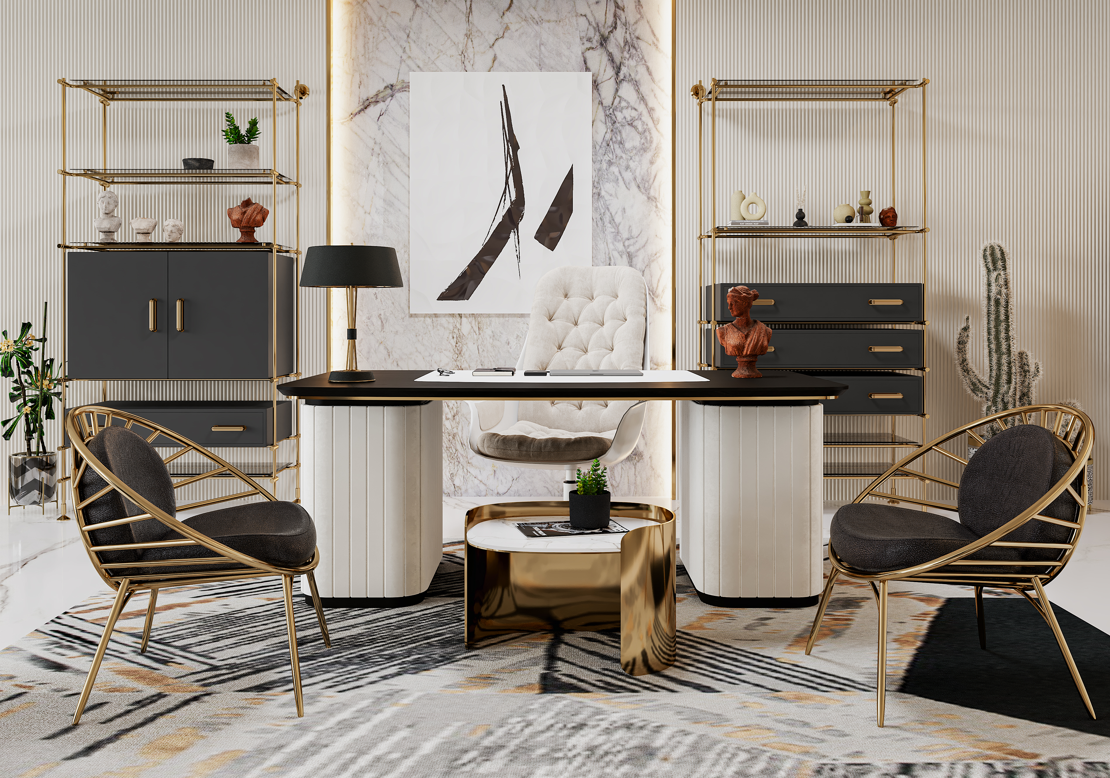 먼저 미팅 존은 보다 전문성이 높은 분야로 중요하고 심각한 사안이 논의되는 공간인 만큼 우아하면서도 세련되고 정중한 디자인으로 완성되었습니다. 이러한 분위기를 완성하기 위해 멋진 책상을 구성했는데, 바로 에센셜 홈(Essential Home)의 에디스 (Edith) 책상이 그 역할을 톡톡히 하고 있습니다. 아름다운 벨벳을 입힌 책상으로 세련되고 유니크한 느낌을 주는 것이 특징입니다. 무엇보다 곡선이 더해진 부드러운 형태는 우아함과 고급스러움이 더해진 고전적인 아름다움은 물론 현대적인 분위기까지 느낄 수 있습니다. 또한 책상과 함께 놓여진 리브스 (Reeves)의자는 매우 모던하고 미래적인 디자인을 지녀 트렌디하고 시크한 감각을 더해줍니다. 이 공간의 책장은 금도금한 놋쇠 틀을 중심으로 광택을 지닌 복고풍 디자인의 매우 아름다운 제품으로 공간을 완성해줍니다.