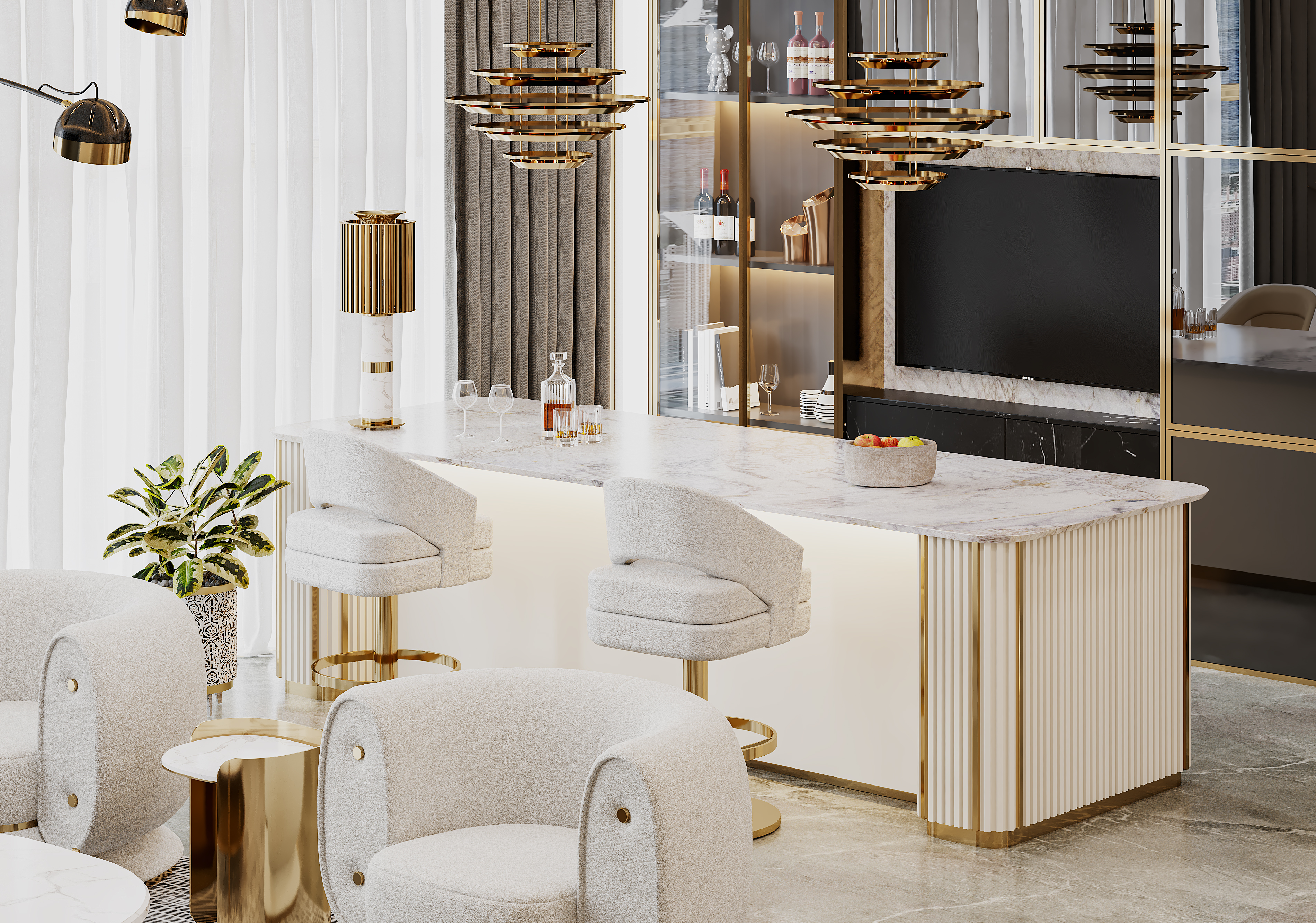 미팅 존과 함께 회의 전후에 음료를 즐길 수 있는 휴식을 취할 수 있는 라운지 공간에도 많은 공을 들였습니다. 밝은 톤의 환상적인 대리석 카운터가 구성되어 있으며, 에센셜 홈의 러셀(Russel) 바 의자가 함께 구성되어 세련된 디자인은 물론 마치 우주공간을 찾은 듯한 공간감을 느낄 수 있습니다. 무엇보다 타의 추종을 불허하는 편안함을 선사하는 공간으로 완벽하게 마감과 형태까지 조율되어 있습니다.