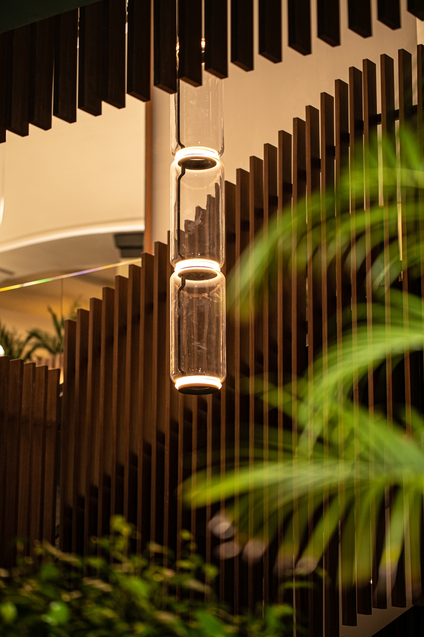 야외와 실내 공간이 시각적으로 융합될 수 있도록 만들기 위해 디자이너들은 천연 소재를 사용하고 식물을 대거 추가해 색감을 부여하였으며, 마치 자연 속의 오아시스와 같은 분위기를 연출했습니다. ALPI Xilo 2.0 월넛 스트라이프는 실내 정원의 푸르른 녹색을 배경으로 각기 다른 공간이 조화롭게 나뉘어 내외부의 연속성을 강조하기에 안성맞춤인 소재라는 것을 다시한번 증명했습니다.