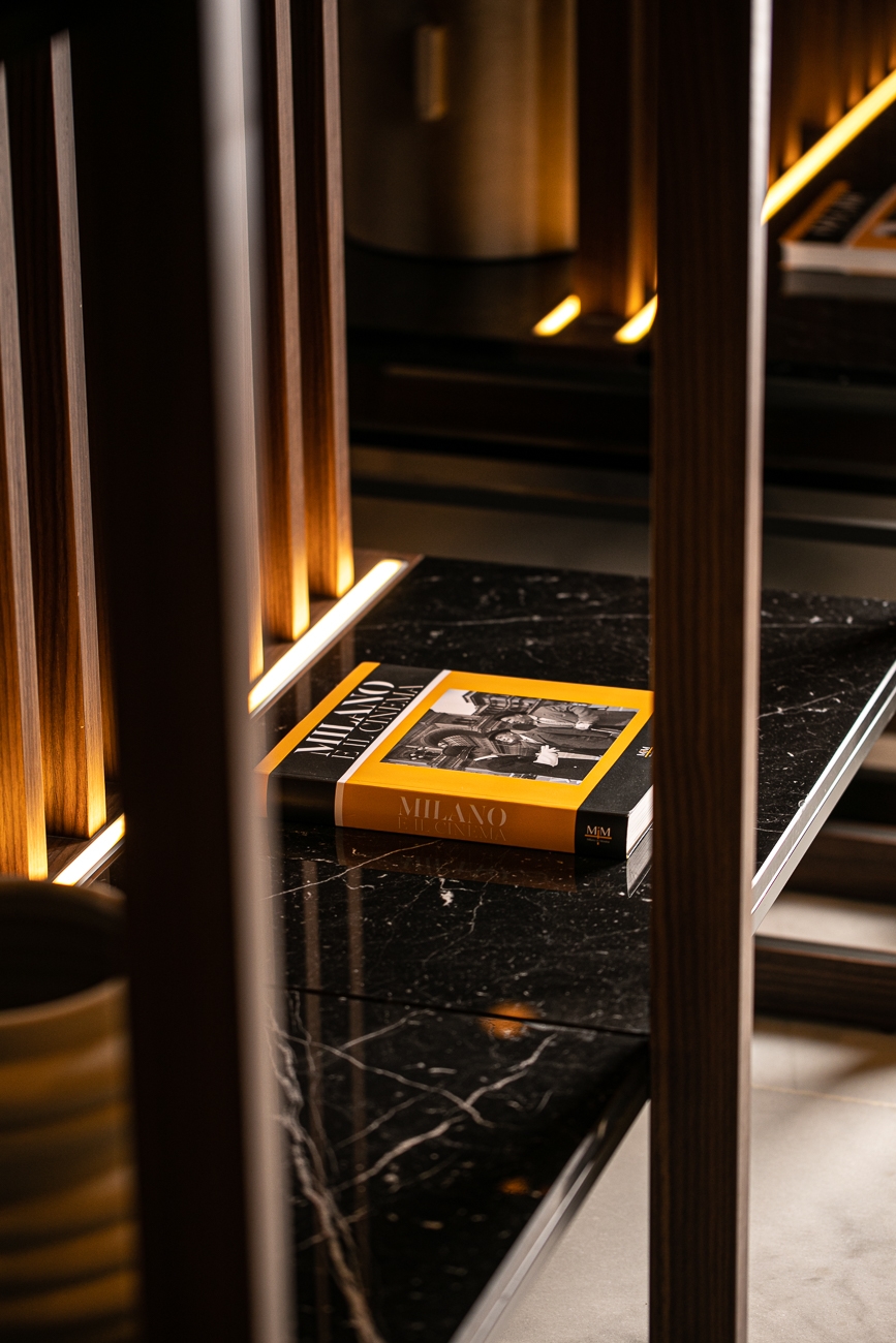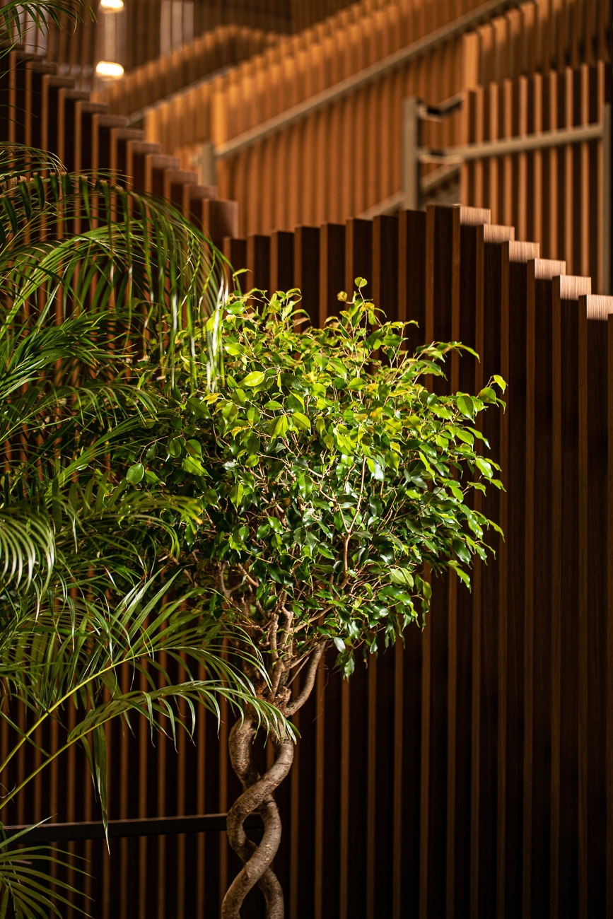 디자이너들은 ALPI사의 Xilo 2.0 Walnut Stripe를 마감재로 선택하여 벽, 기둥, 중앙 계단과 로비를 내려다보는 메자닌 가장자리를 덮었습니다.