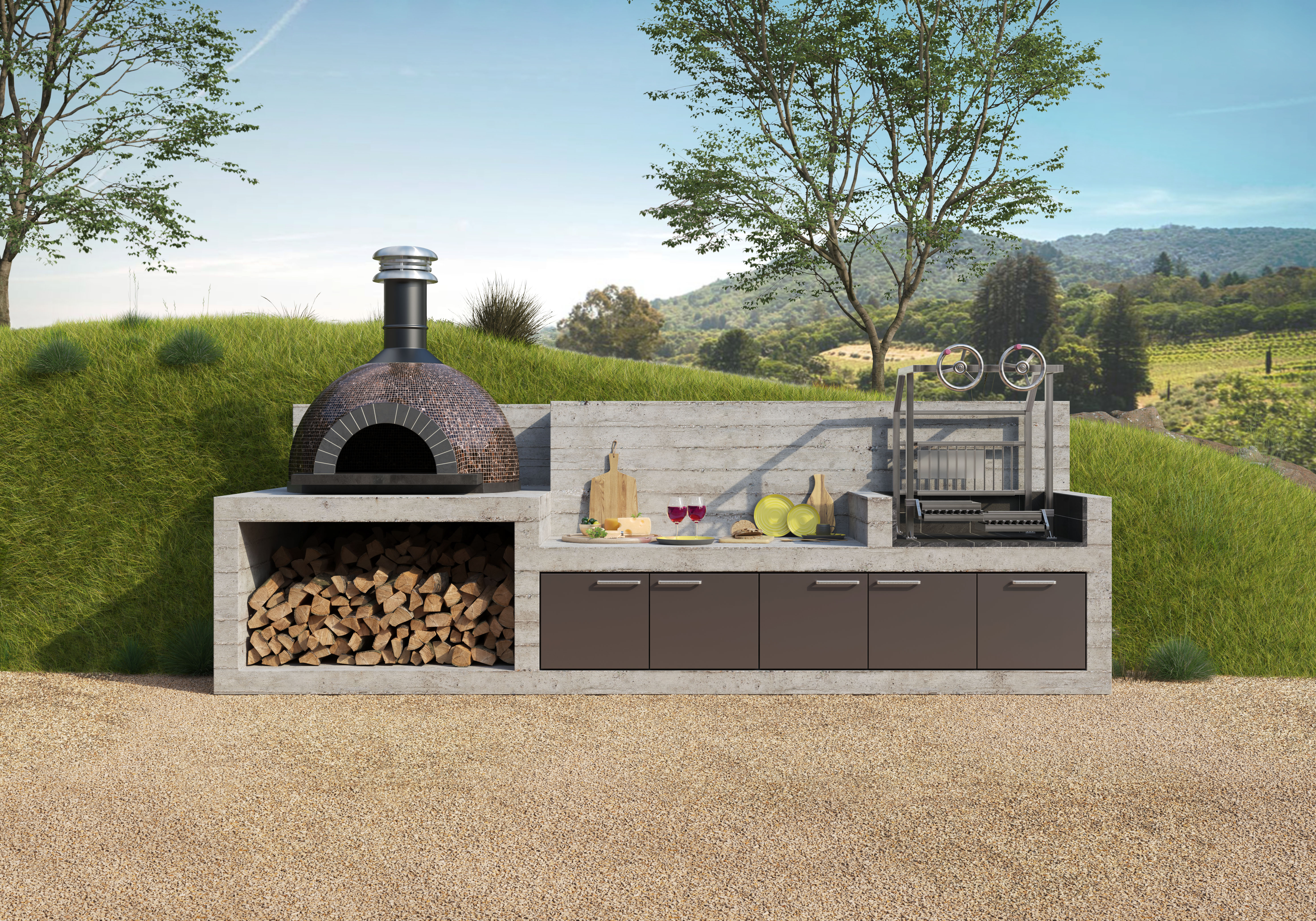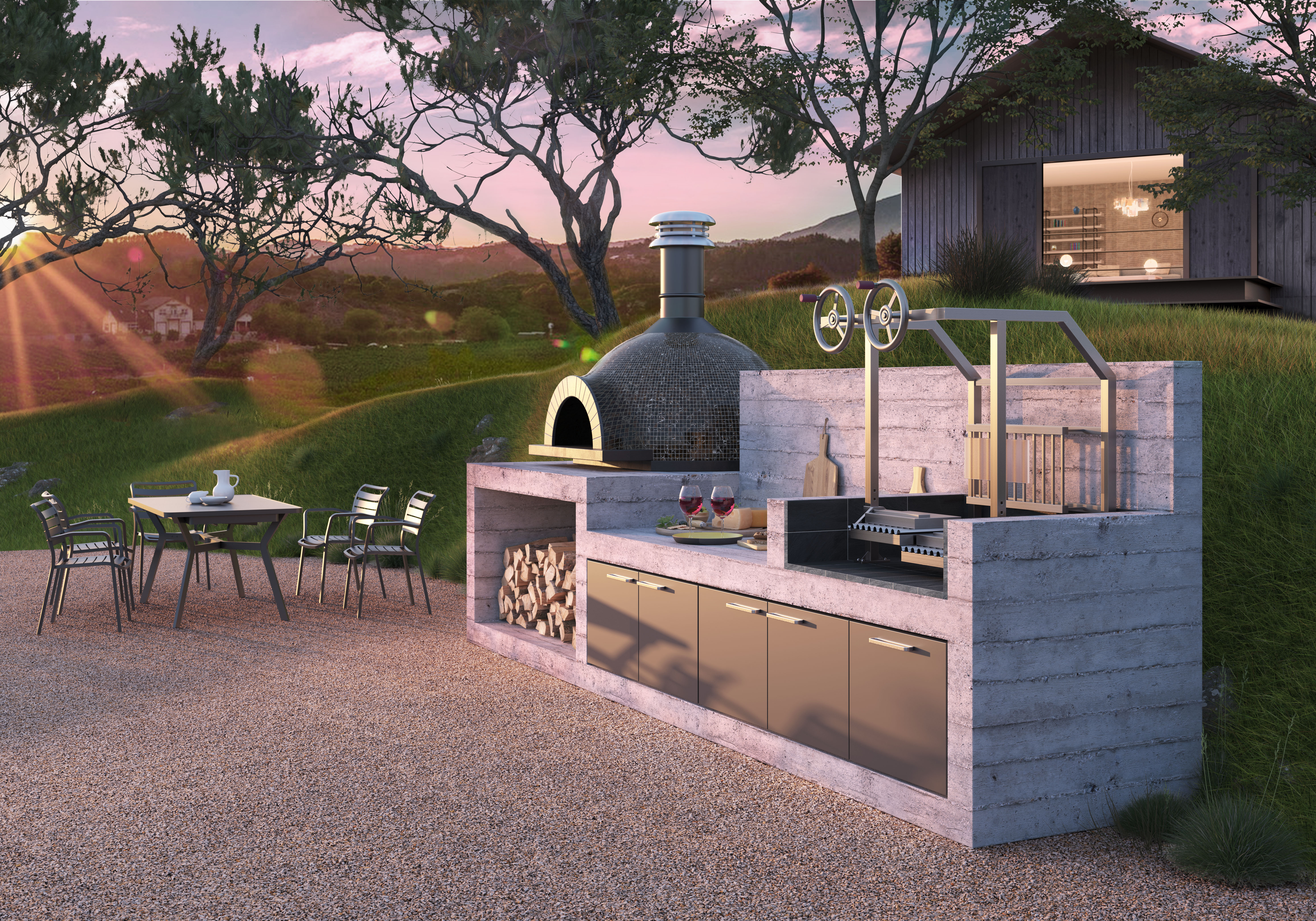 콘크리트로 만들어진 주방은 최고의 미국 요리 전통을 반영하는 그릴과 바비큐 시설을 갖추고 있으며 Atelier 컬렉션의 전형적인 사각형 디자인을 반영하는 깔끔한 건축 양식, 필수적이고 엄격한 라인을 선보입니다. 실용적인 조리대는 두 가지 요리 모드를 분리하고, 주방의 하부는 나무를 보관할 수 있는 넉넉한 개방 공간과 무연탄 마감 도어와 대형 인체공학적 손잡이가 있는 Abimis의 AISI 304 스틸 수납칸으로 완성됩니다.