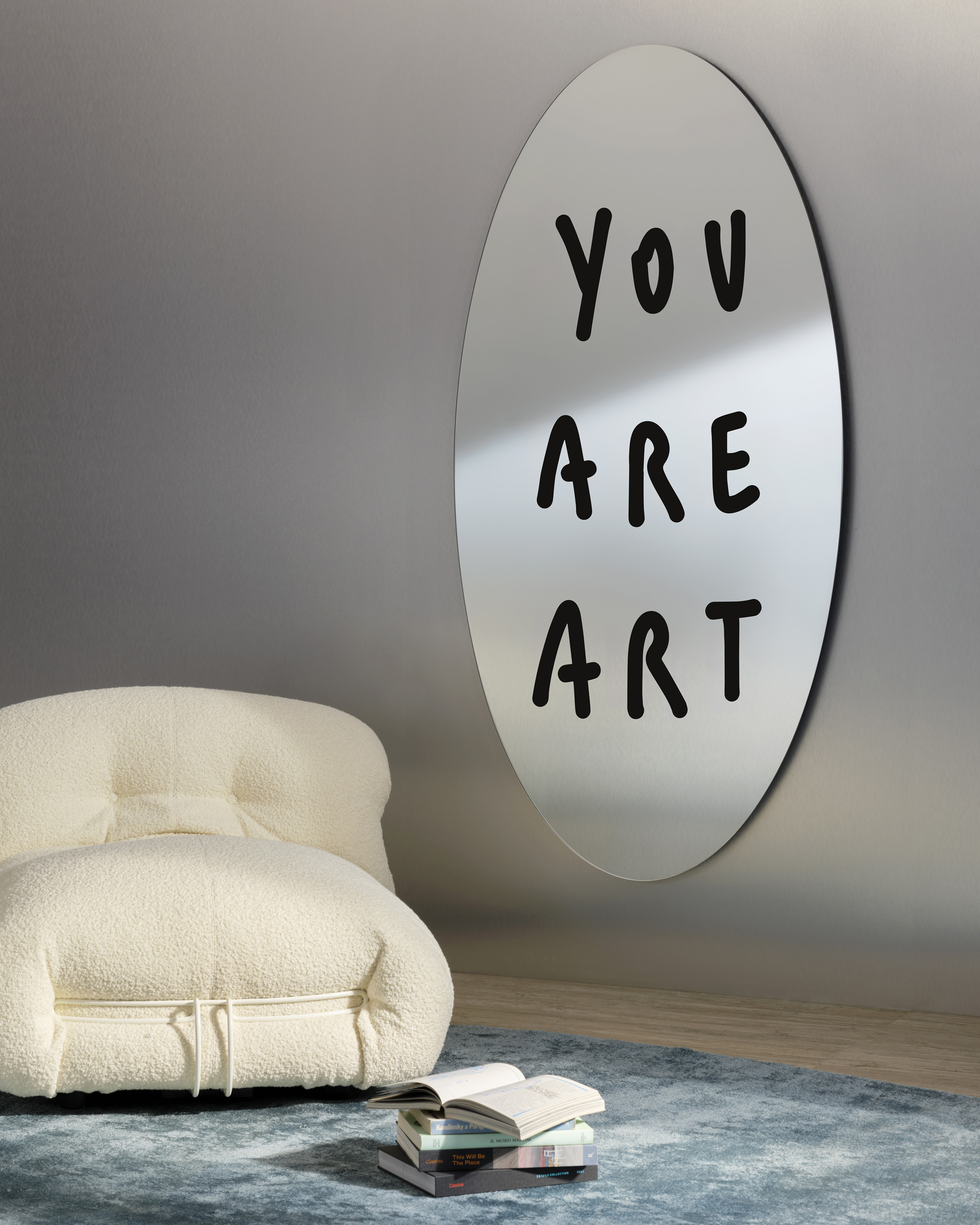 테르치니는 굵은 수기 텍스트로 관객과 직접적인 대화를 시도하는 팝 아트적 접근을 통해, 우리 시대의 감정과 정체성을 날카롭게 짚어내는 것으로 잘 알려져 있습니다. 그의 문장은 단순한 문구를 넘어, 정서적 깊이 대신 장소와 이미지로 관계를 대체하는 현대적 감각을 풍자적으로 드러냅니다. 마이애미라는 도시는 그에게 있어 쾌락과 지위의 상징이며, 이 문구는 사랑의 자리를 도시가 대신하는 시대적 단면을 섬세하게 전달합니다. 이번 전시와 함께 공개된 ME FROM OUTSIDE 컬렉션은 거울이라는 오브제가 지닌 상징성과 소통 가능성을 극대화한 작업으로, 스크린 프린팅된 대문자 메시지를 통해 사용자가 자신의 모습과 사회의 시선을 재해석하도록 유도합니다. 테르치니는 밀라노 디자인 위크에서 첫선을 보인 두 가지 리미티드 에디션의 성공에 이어, 마이애미 전시를 위해 “You are art”와 “No risk no story”라는 새로운 두 메시지를 추가했습니다. 각각의 메시지는 인간의 자의식, 아름다움, 용기라는 주제를 감각적으로 풀어내며, 총 100점 한정으로 제작되었습니다. 동시에 기존 모델인 “We see what we want to see” 역시 함께 전시되며, 거울을 통해 드러나는 ‘선택적 인식’이라는 현대적 개념을 다시 한 번 상기시킵니다.