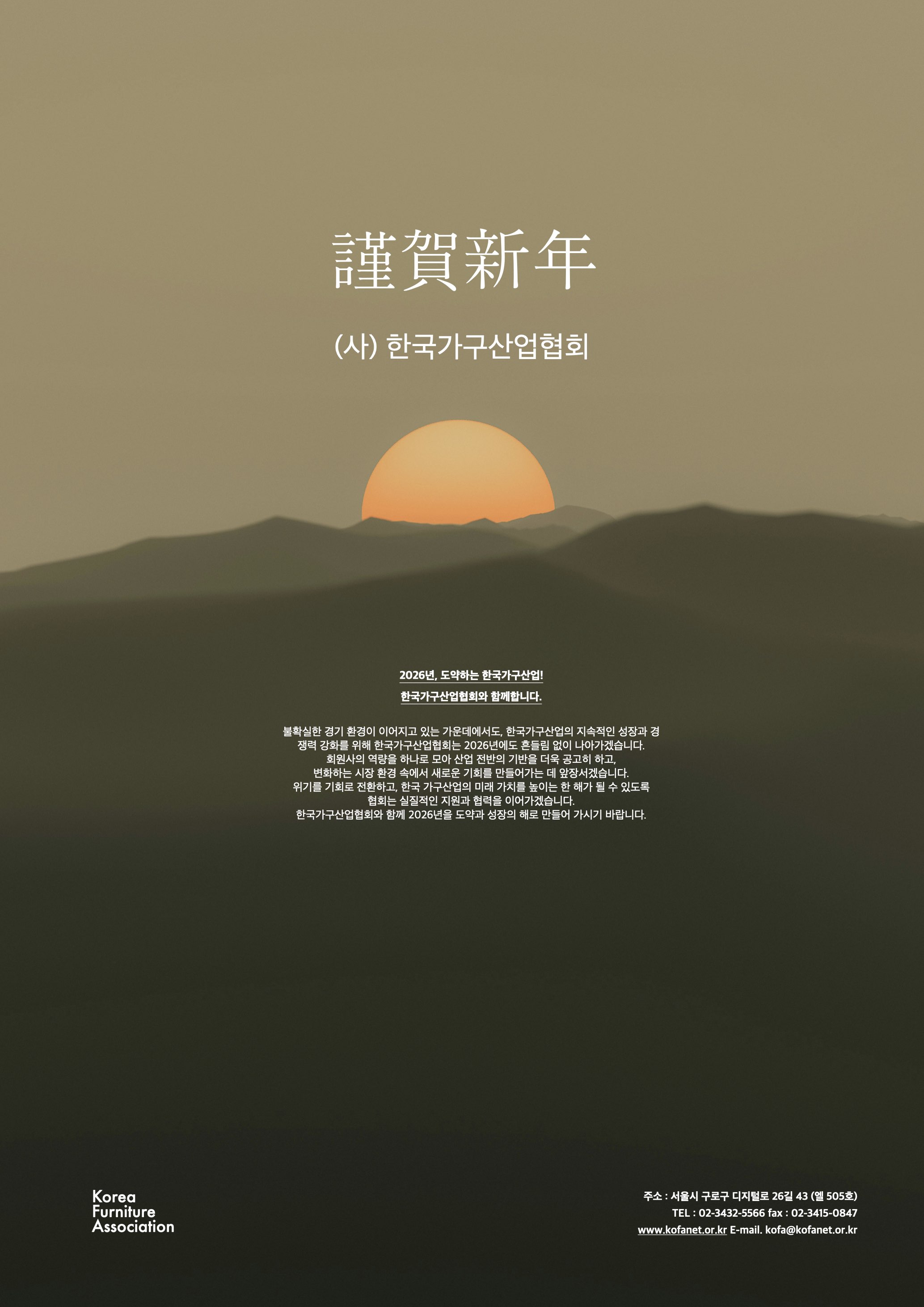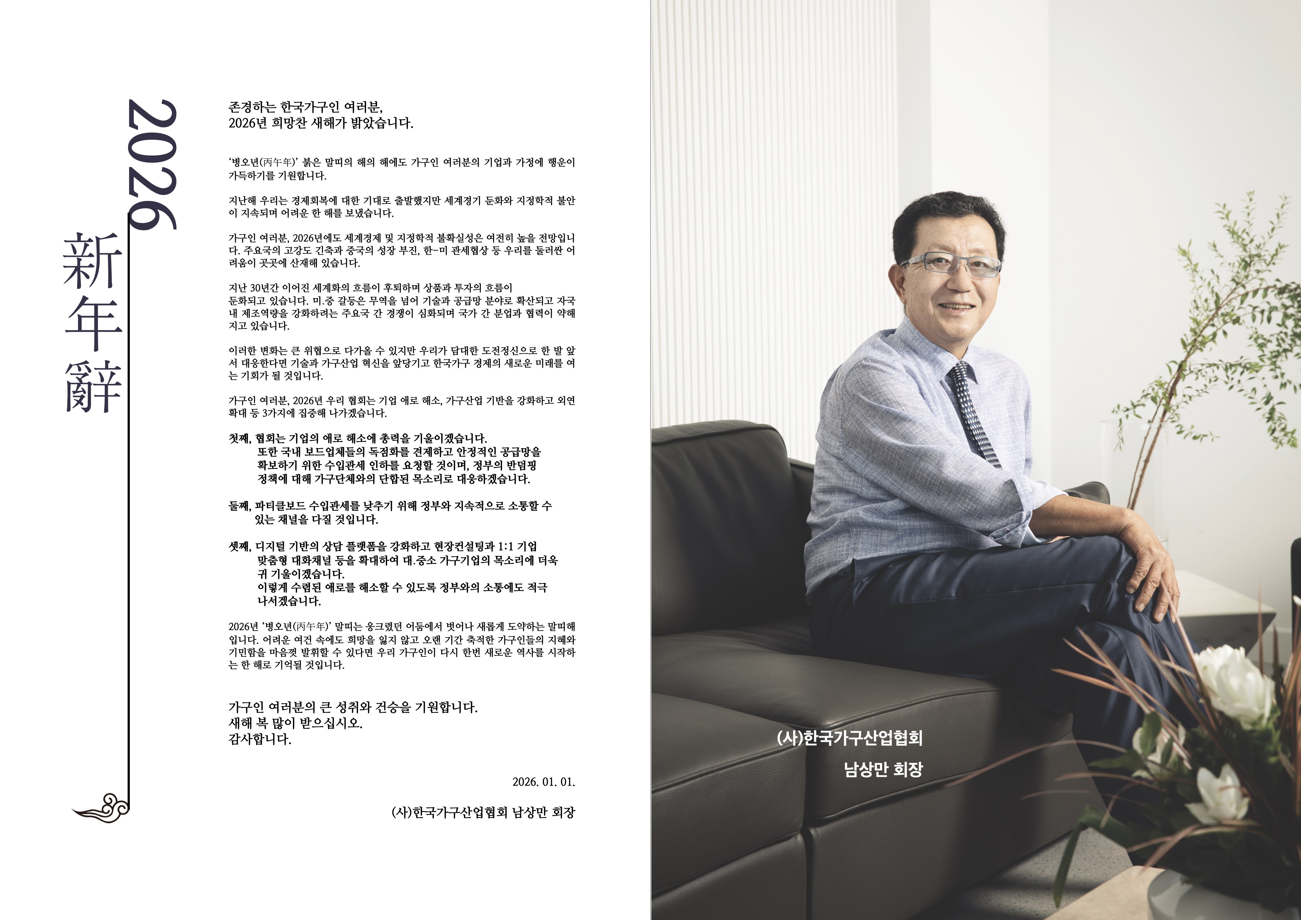 가구인 여러분, 2026년 우리 협회는 기업 애로 해소, 가구산업 기반을 강화하고 외연 확대 등 3가지에 집중해 나가겠습니다.