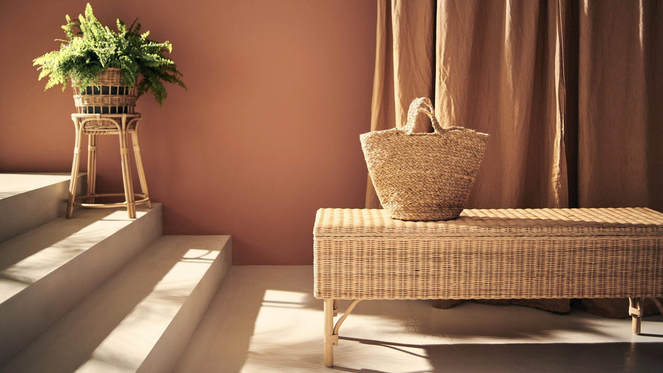 차분한 거실 인테리어를 위해서는 숨기고 싶은 물건을 적절히 수납하는 것이 중요하다. 시원한 촉감의 라탄 소재로 제작된 수납 솔루션을 사용하면 계절감까지 살릴 수 있다. 톨크닝(TOLKNING) 수납벤치는 전통적인 스칸디나비안 스타일로 견고하게 짜인 라탄 소재가 공간에 포인트가 되고, 평소 의자로 사용할 수 있어 유용하다. 같은 시리즈의 걸이식 바구니나 화분스탠드를 함께 배치하면 자연스러운 매력이 배가된다.