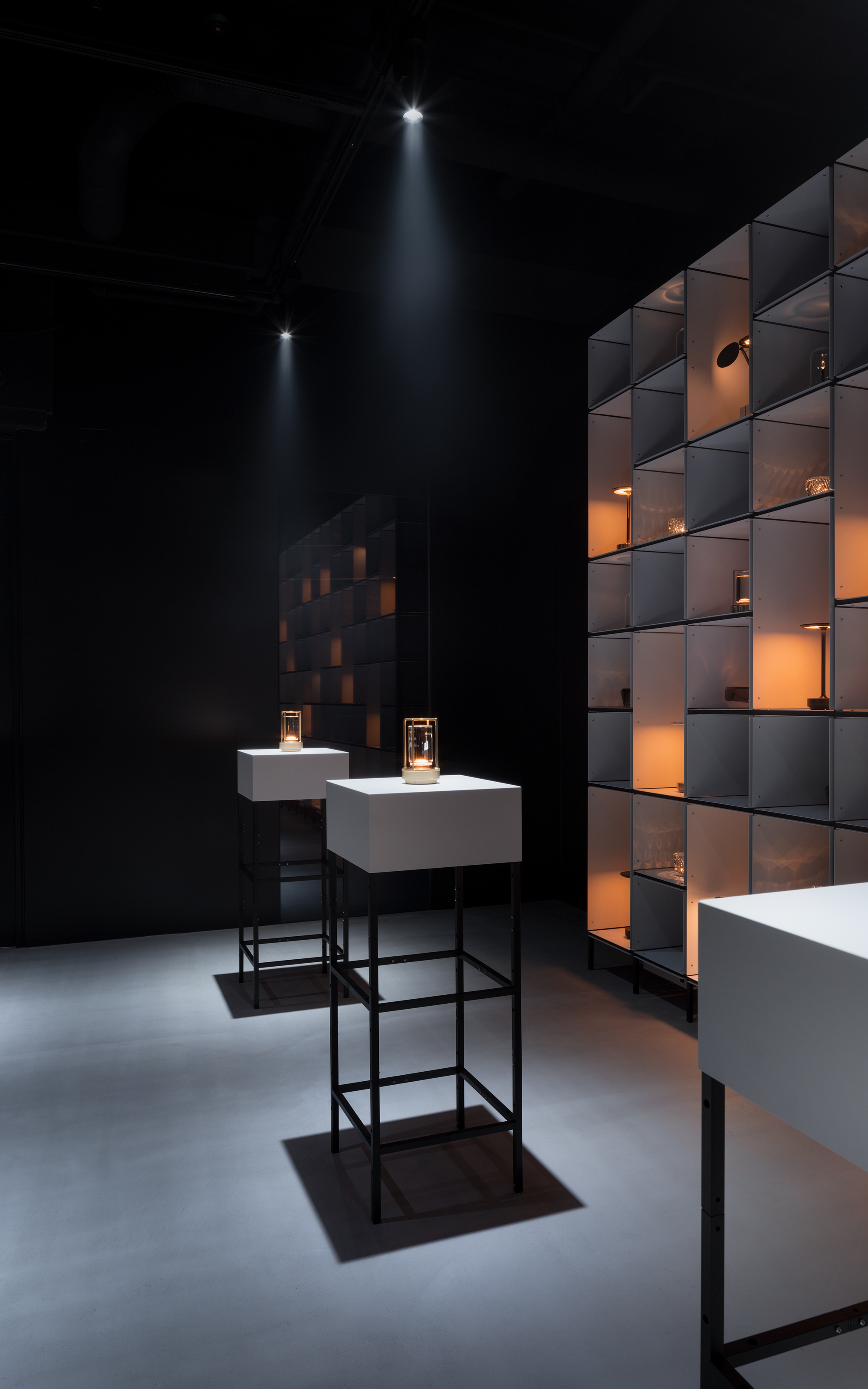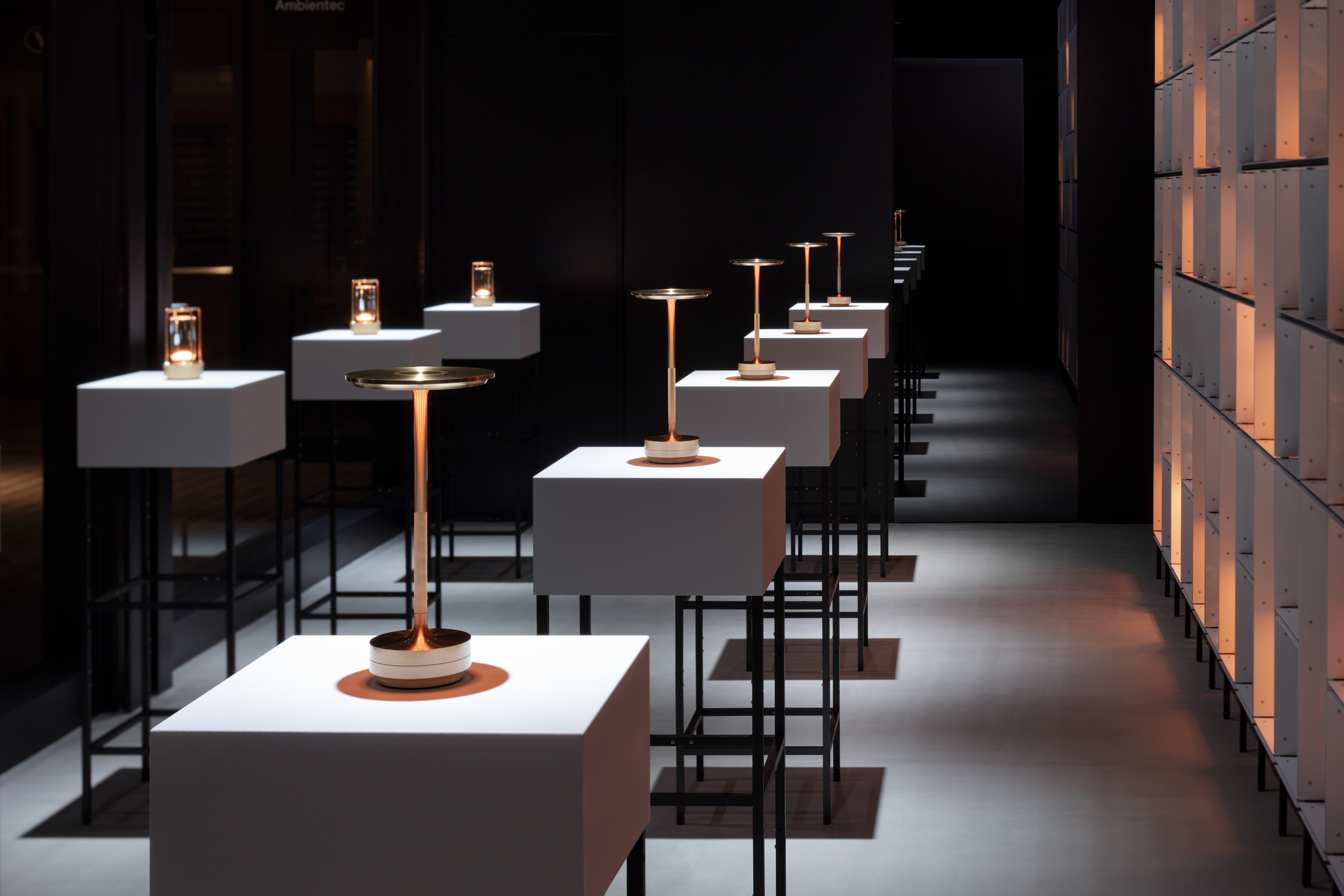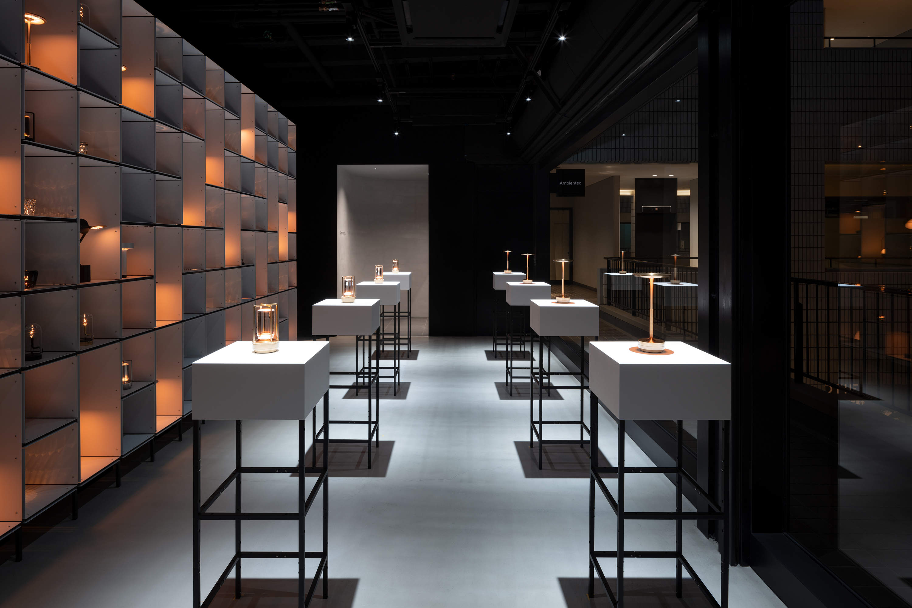 앰비언텍 갤러리는 형식적인 엄격함과 함께 앰비언텍의 모든 컬렉션을 담아낼 수 있도록 특별히 고안된 모듈형 요소 덕분에 마치 진정한 미술 갤러리처럼 시각적으로 뛰어난 공간을 구현합니다. 메인 전시 공간 뒤편에는 석고, 목재, 그리고 다양한 질감의 소재로 섬세하게 마감된 두 개의 더욱 아늑하고 친밀한 공간이 마련되어 방문객들에게 부드러운 감각적 경험을 전달하도록 디자인되었습니다. 또한, 높은 카운터와 원형의 다이닝 스타일 테이블은 따뜻하고 환영하는 분위기를 조성하며, 방문객들이 앰비언텍 제품을 몰입적이고 실질적으로 경험할 수 있는 기회를 제공합니다. 이러한 공간 구성은 고객과의 소통을 중시하는 앰비언텍의 철학을 반영합니다.