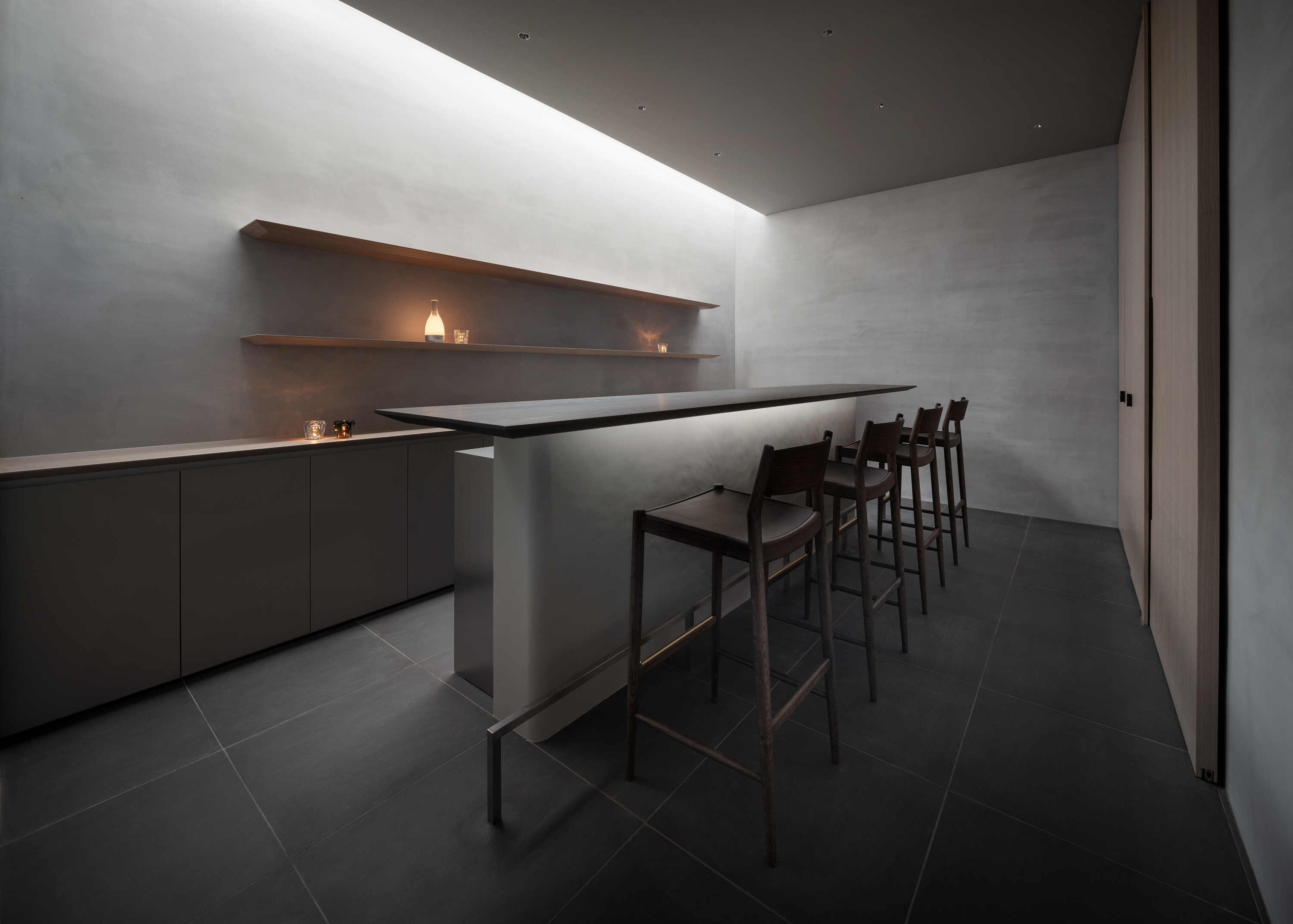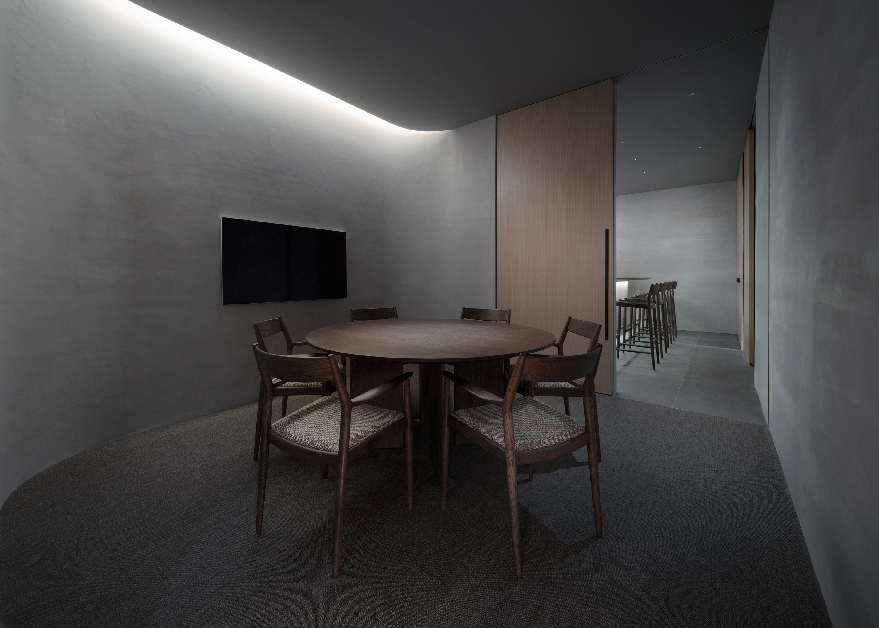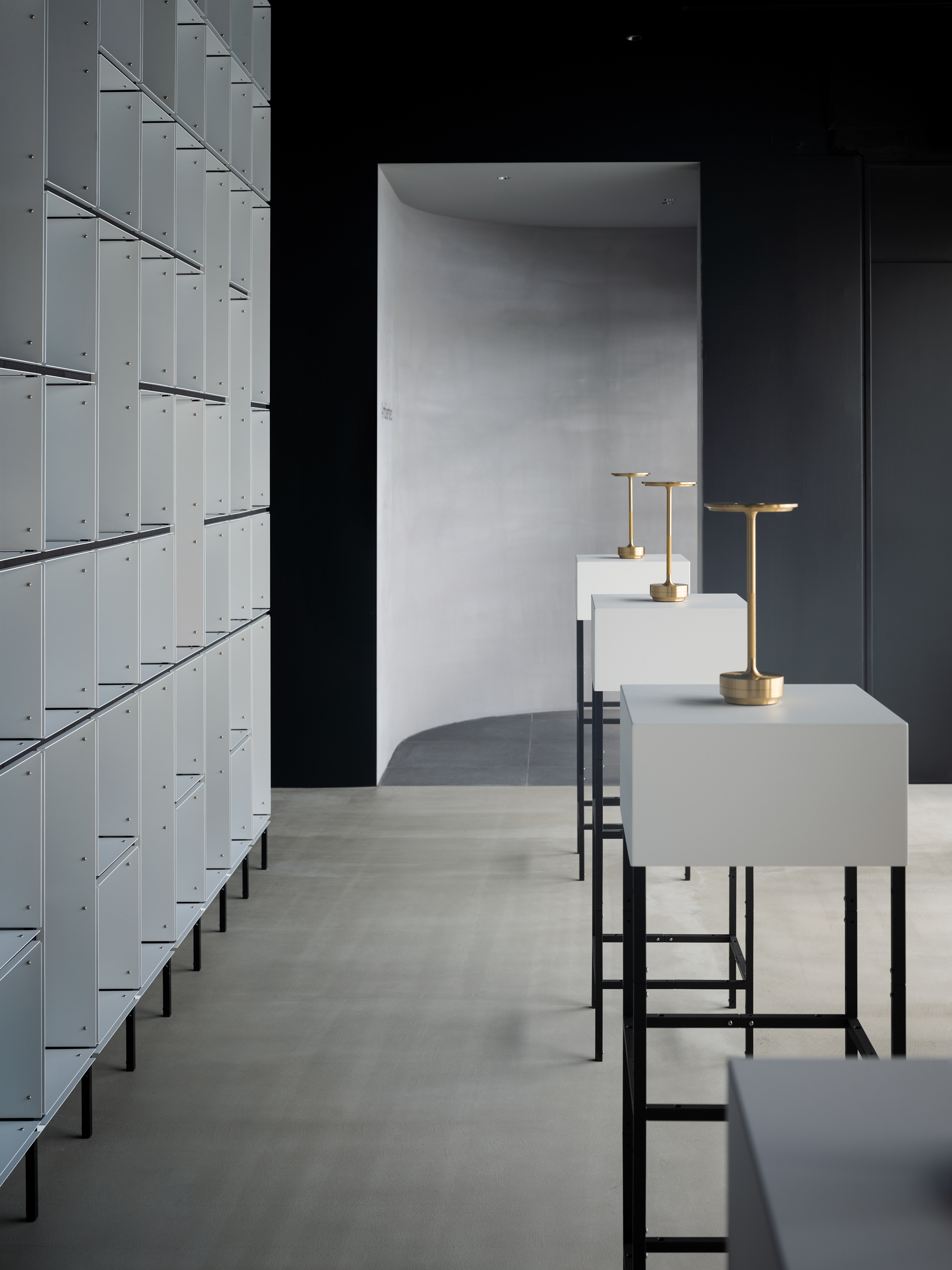 앰비언텍 갤러리는 형식적인 엄격함과 함께 앰비언텍의 모든 컬렉션을 담아낼 수 있도록 특별히 고안된 모듈형 요소 덕분에 마치 진정한 미술 갤러리처럼 시각적으로 뛰어난 공간을 구현합니다. 메인 전시 공간 뒤편에는 석고, 목재, 그리고 다양한 질감의 소재로 섬세하게 마감된 두 개의 더욱 아늑하고 친밀한 공간이 마련되어 방문객들에게 부드러운 감각적 경험을 전달하도록 디자인되었습니다. 또한, 높은 카운터와 원형의 다이닝 스타일 테이블은 따뜻하고 환영하는 분위기를 조성하며, 방문객들이 앰비언텍 제품을 몰입적이고 실질적으로 경험할 수 있는 기회를 제공합니다. 이러한 공간 구성은 고객과의 소통을 중시하는 앰비언텍의 철학을 반영합니다.