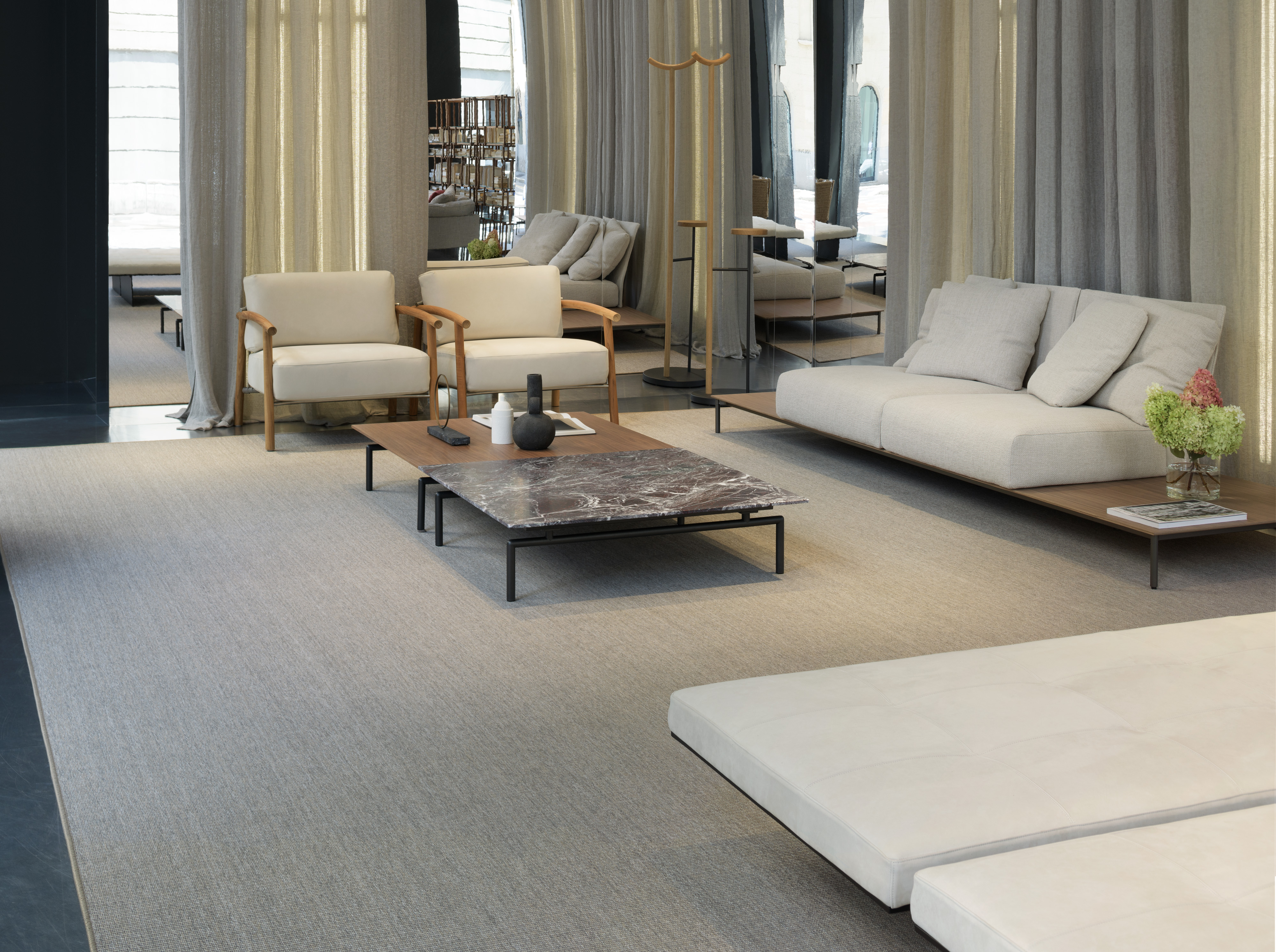 코르소 몬포르테 건너편에는 리빙 디바니의 국내 비전을 완벽하게 표현하는 두 개의 세팅이 유니콤으로 서로 이어져 있습니다. 첫 번째 영역 인 Echoo에서는 마치 소파 전체를 포함하는 것처럼 쉘이 소파 전체를 감싸는 Piero Lissoni의 디자인이 같은 디자이너의 Balestro 24와 대화하고 있으며,이 버전에서는 날씬하고 가벼운베이스가 부드러운 쿠션으로 덮여있는 구성 요소의 단순성에 기반한 개념으로 셀룰로오스 로프 팔걸이로 둘러싸인이 버전에서 대화하고 있습니다. 대신 두 번째 공간에는 밝은 색상의 패브릭으로 덮개를 씌운 버전으로 등받이가 있는 Balestro 24가 전시되며, 나무 구조 덕분에 가볍고 자연스러운 느낌을 전달할 수 있는 Mist-o가 디자인한 Kasumi 안락 의자와 결합되어 수수하지만 독특한 개성을 드러냅니다.