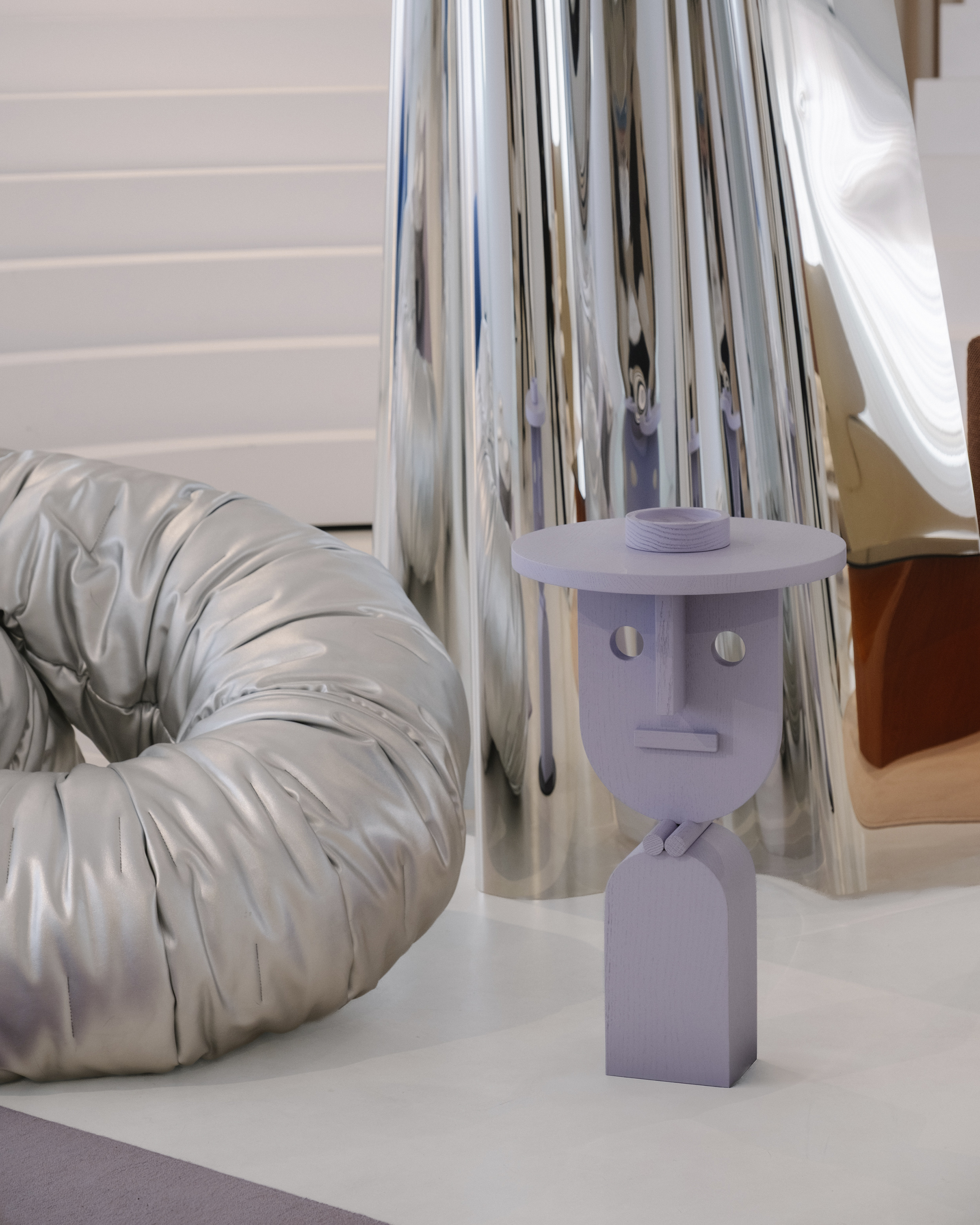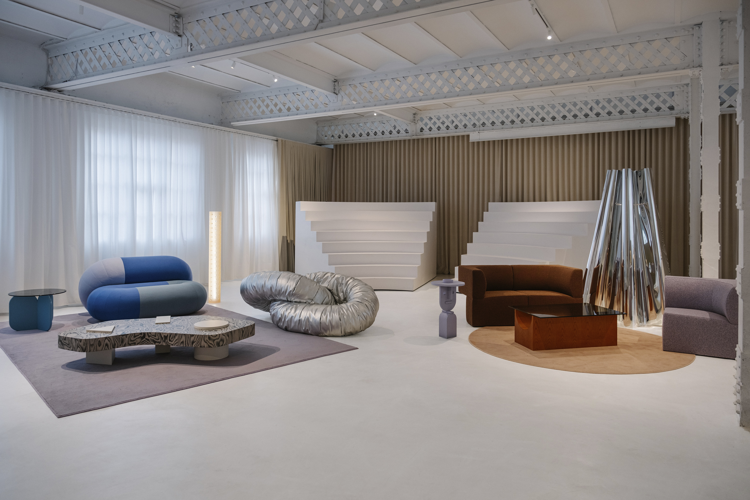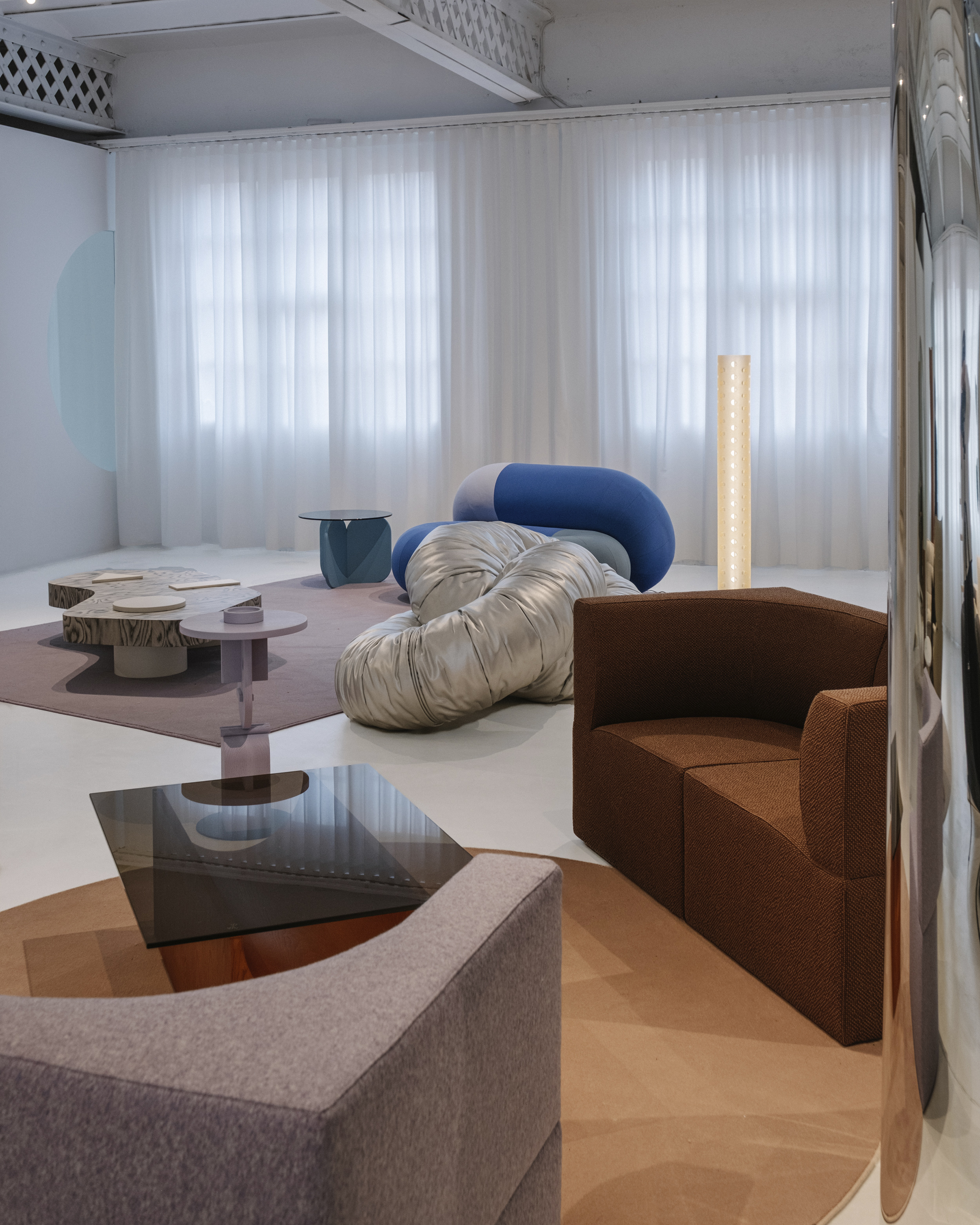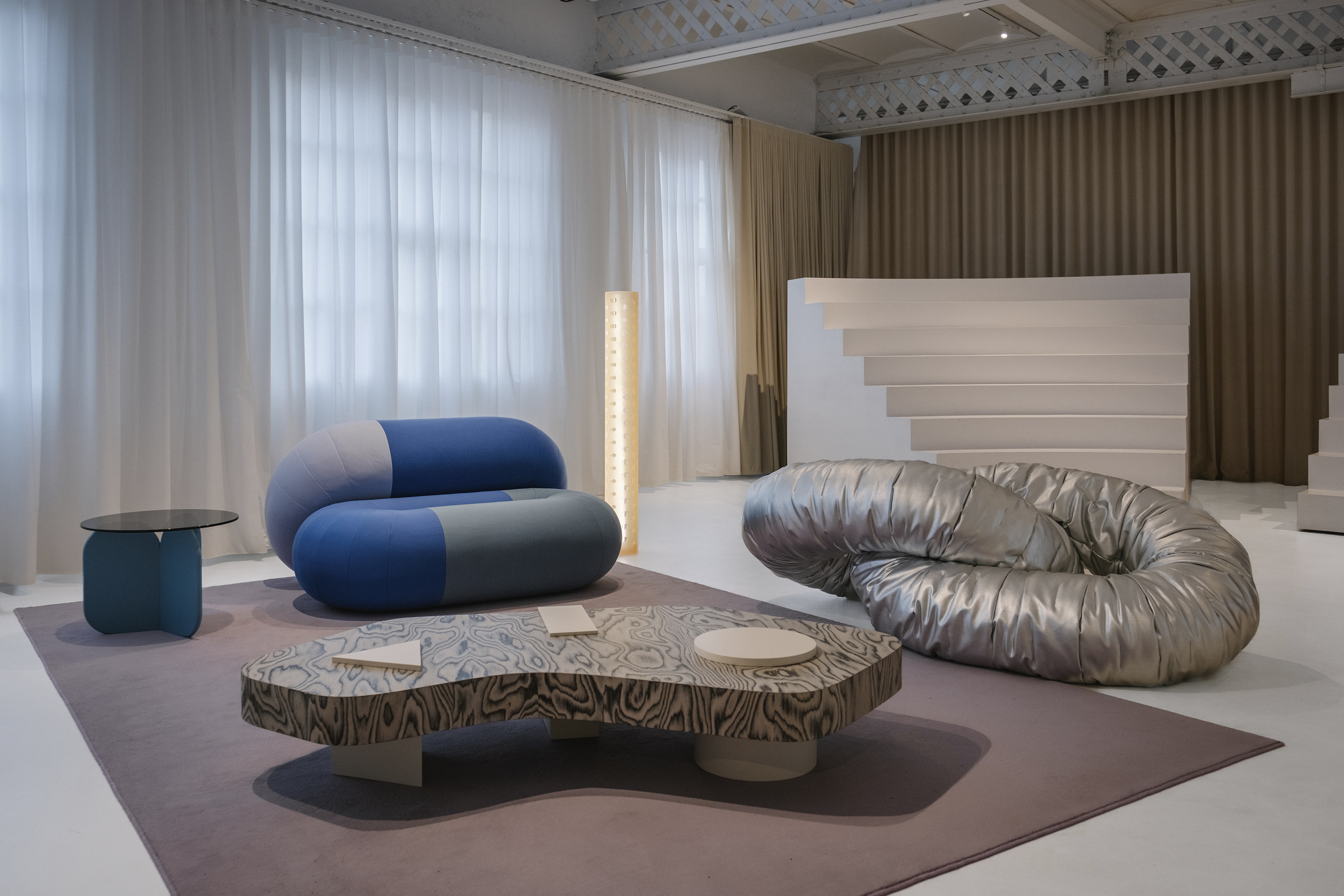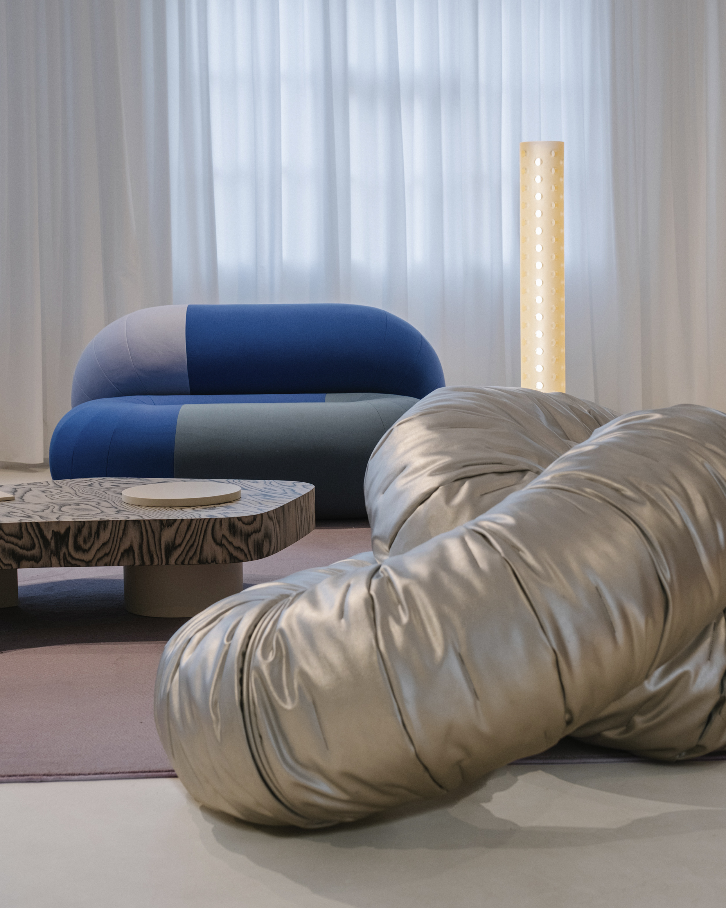 시원한 파란색, 검은색, 눈처럼 하얀색의 Noche(밤) Island는 두 개의 기하학적 러그를 겹쳐 놓았습니다. Bold 사이드 테이블, Duo Maxi 소파, Remnant 안락의자, Magnum 라운지 의자의 조각적 형태는 Forever Studio의 Mesh 선반 장치와 일치합니다. 같은 색조의 대형 러그로 정의된 Mauve Island는 Sancal의 "디자이너 에디션" 작품을 선보입니다. Blue Mix의 Loop 소파, Bio Silver 마감의 Wrinkled Link 시트, Sottsass 베니어의 Bold XL 테이블은 컬렉션에서 가장 예술적인 요소로 돋보이며, 대담하고 장난기 있는 구성으로 색상, 모양, 패턴을 혼합합니다. 자연광이 창문을 통해 스며들어 가구의 물질성을 강조하는 반면, 그림자의 변화하는 놀이는 하루 종일 분위기를 변화시킵니다. 이 공간의 마법은 사진작가 클레멘테 베르가라가 포착했습니다. 그는 이세른 스튜디오와 함께 독특한 스타일로 이 장소의 본질을 포착했습니다. 건축과 시각적 구성을 전문으로 하는 베르가라는 그림자, 선, 색상으로 놀면서 몰입감 넘치는 이미지를 만들어 시청자를 설치물의 심장부로 데려갑니다. 공간과 형태에 대한 그의 독특한 접근 방식을 통해 이세른이 만든 분위기와 함께 Sancal의 작품이 뛰어난 방식으로 살아나 예술과 디자인의 교차점을 강조하는 시각적 서사를 만들어냅니다.