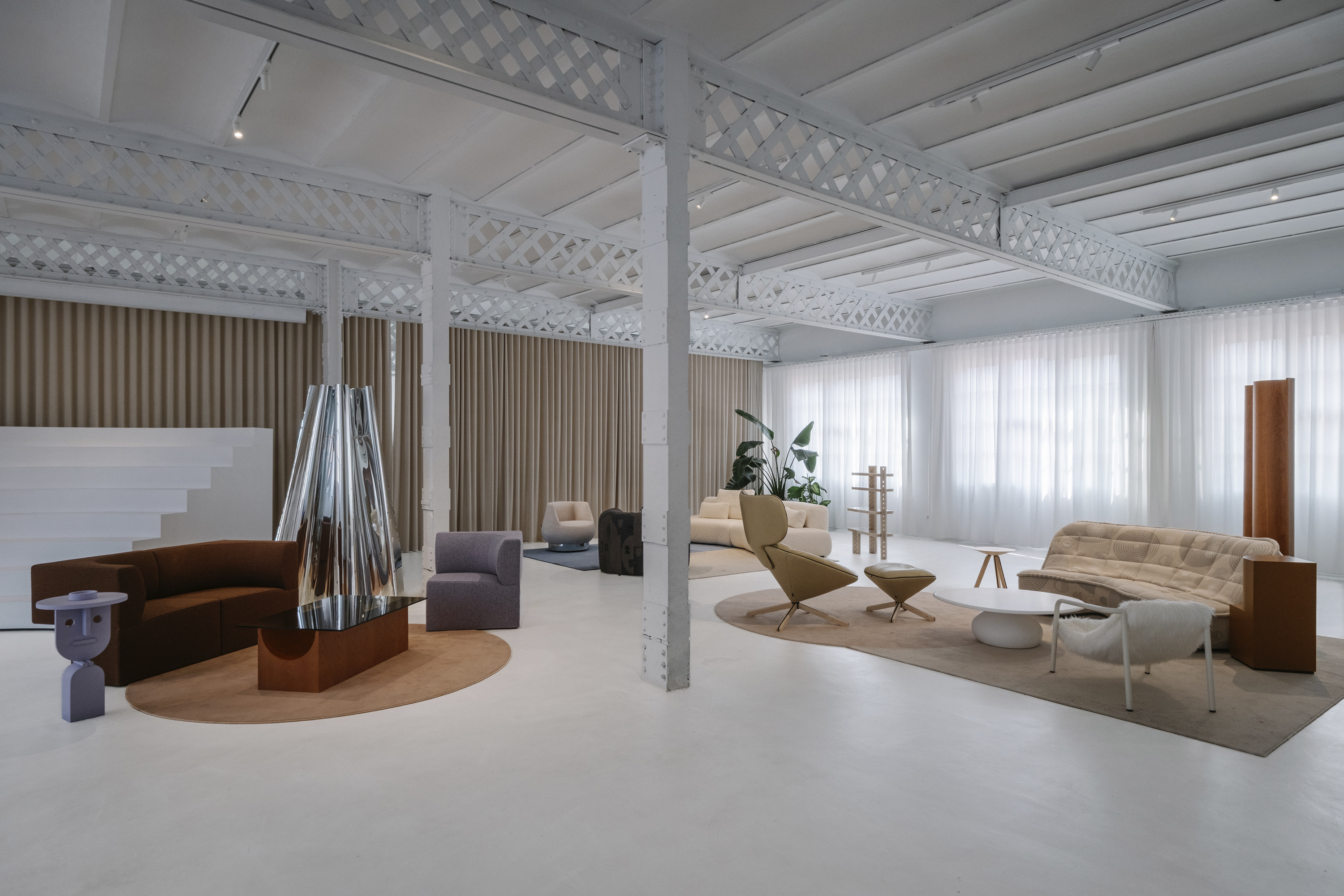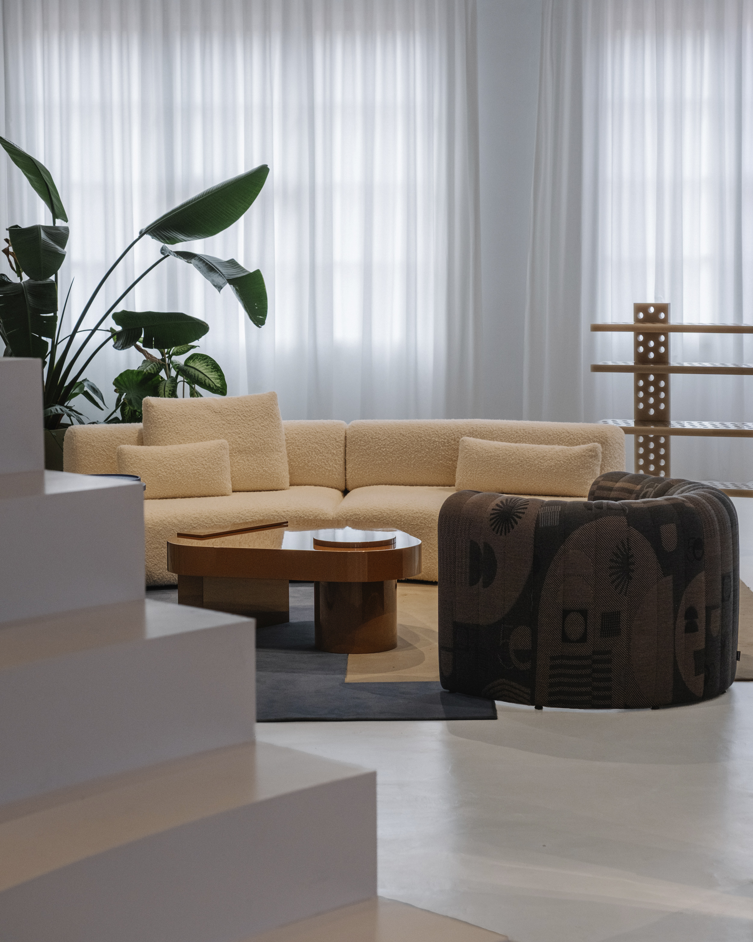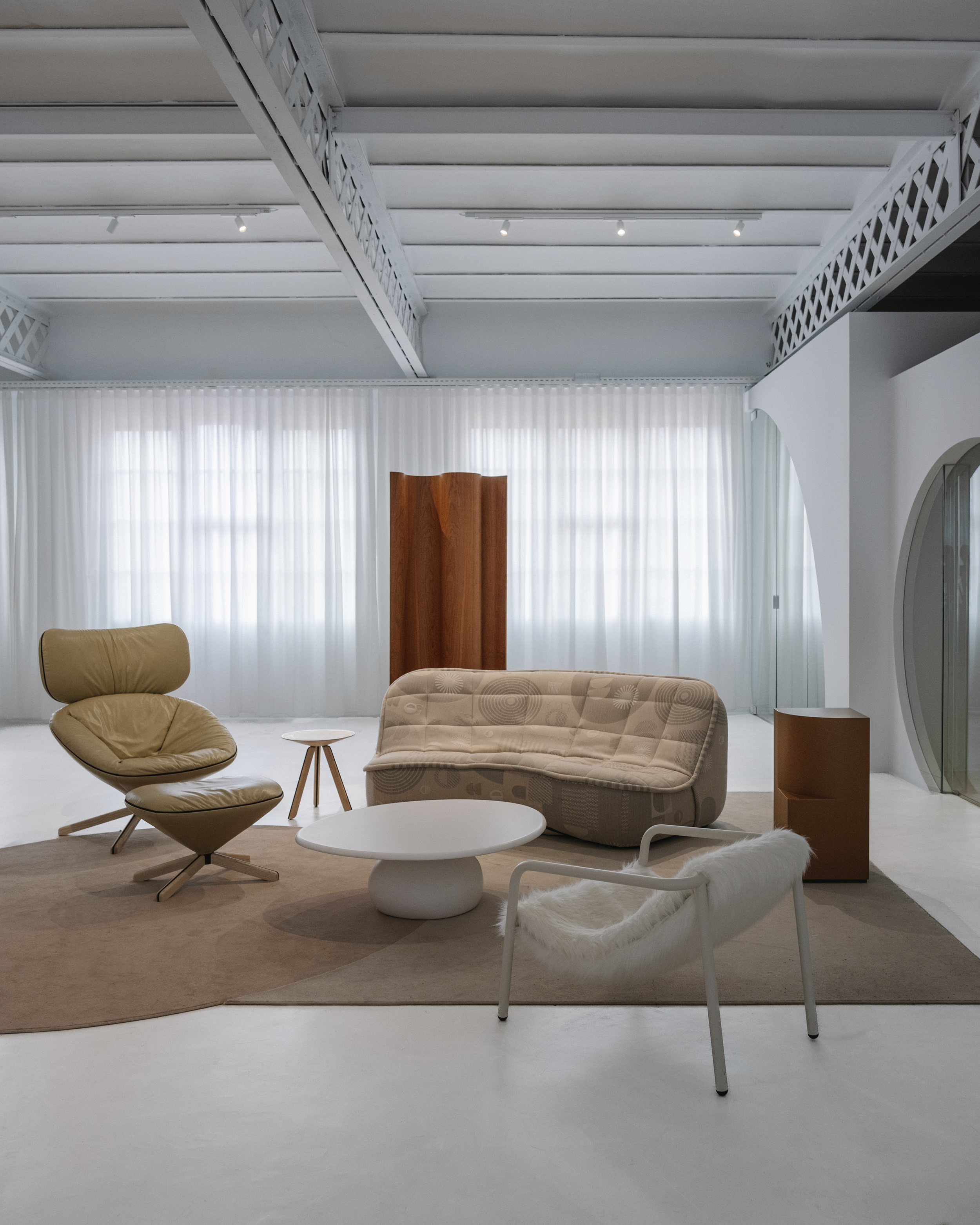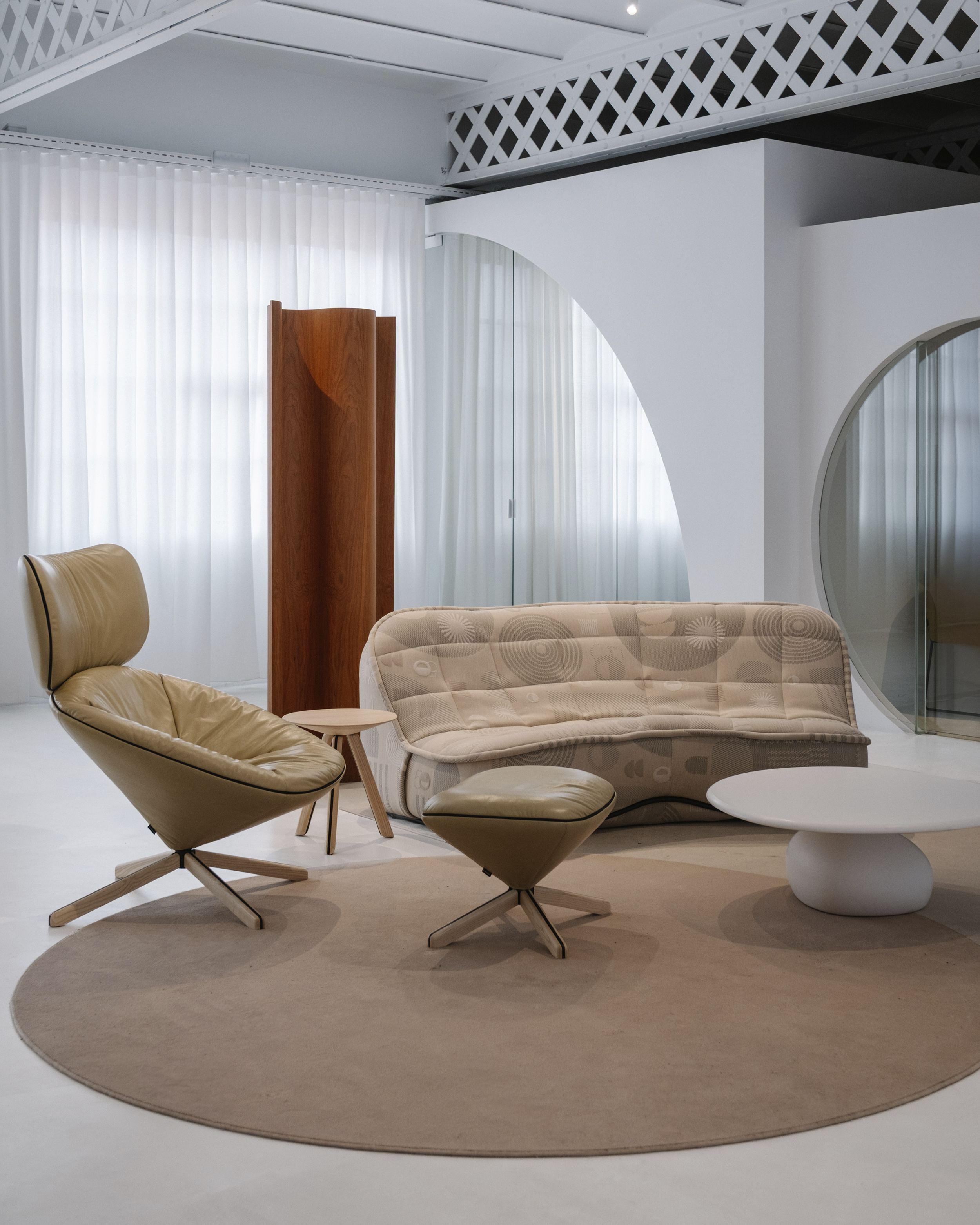 이 공간은 섬으로 구성되어 가정적인 환경이 아닌 미술관의 언어를 연상시킵니다. Isern은 "각 러그에는 색상, 모양, 요소가 선택적으로 큐레이션되어 예술 작품 전시로 변신합니다."라고 말합니다. 이 공간을 위해 독점적으로 제작된 러그는 각 영역을 정의하고 작품의 조각적 존재감을 강화하는 배경 역할을 합니다. 공간을 산업적 중립성으로 감싸는 바닥과 벽과 대조적으로, 네 가지 세팅은 색채적 접근 방식을 통해 작품에 주목하게 합니다. 입구에 위치한 Neutral-Natural Island는 나무 Vestige 테이블과 같은 천연 소재와 Canto 좌석 실내 장식의 질감과 색조를 결합합니다. 이 섬에는 Vasto의 두 가지 작품인 Mesh Lamp와 Folded Sculptures도 있습니다. 베이지와 크림 톤이 지배적인 Día(낮) Island는 원단과 패턴으로 놀고 있습니다. 이 세팅에는 Fiesta Día 직물로 덮인 Vibe 소파, 베이지색 가죽의 Tortuga 안락의자, Vesper 사이드 테이블, Elle Mini 라운지 의자가 포함됩니다. Isern Serra의 팀이 디자인하고 Fusteria Vidal이 제작한 물결 무늬 오크 스크린은 건축적 요소를 더합니다.