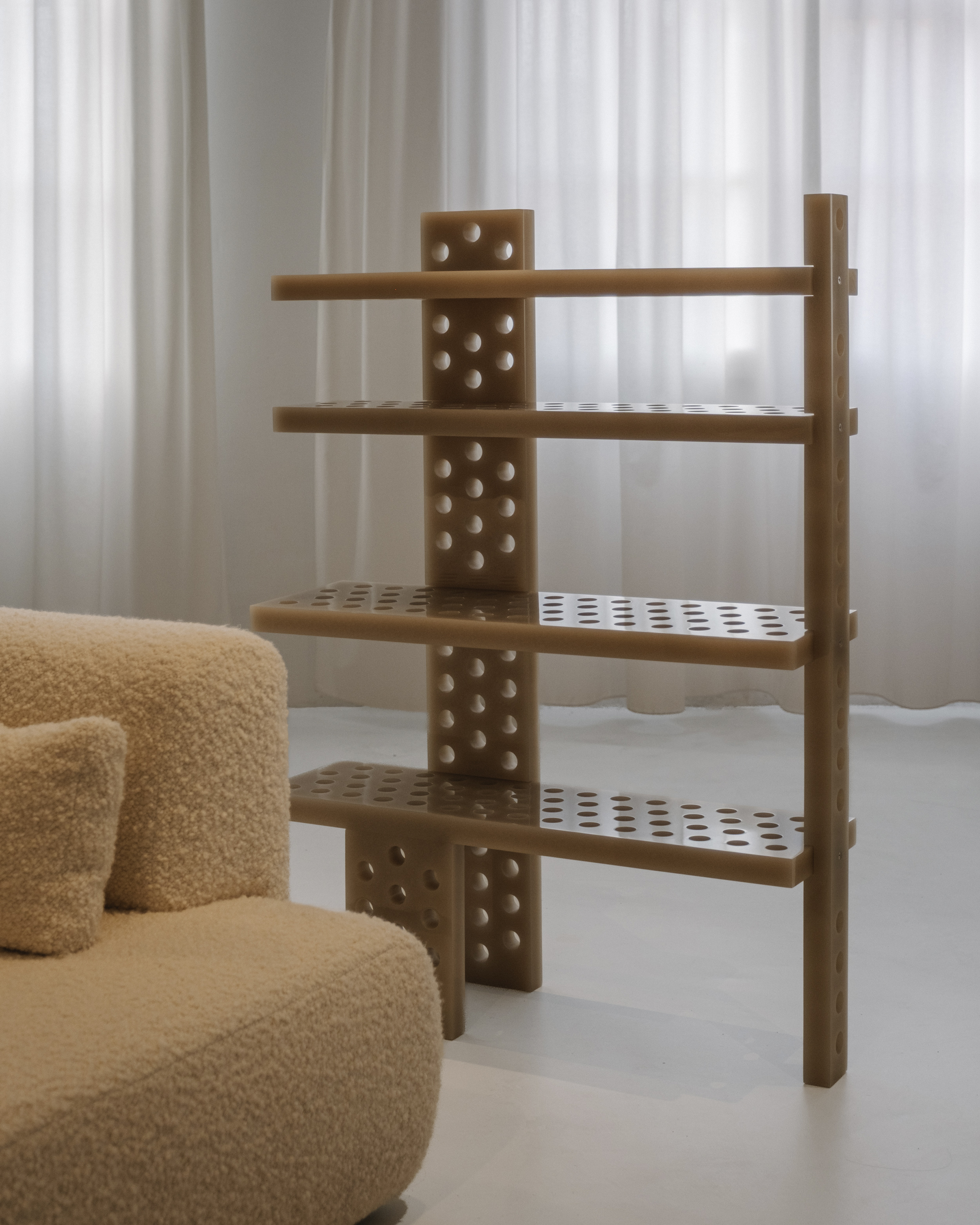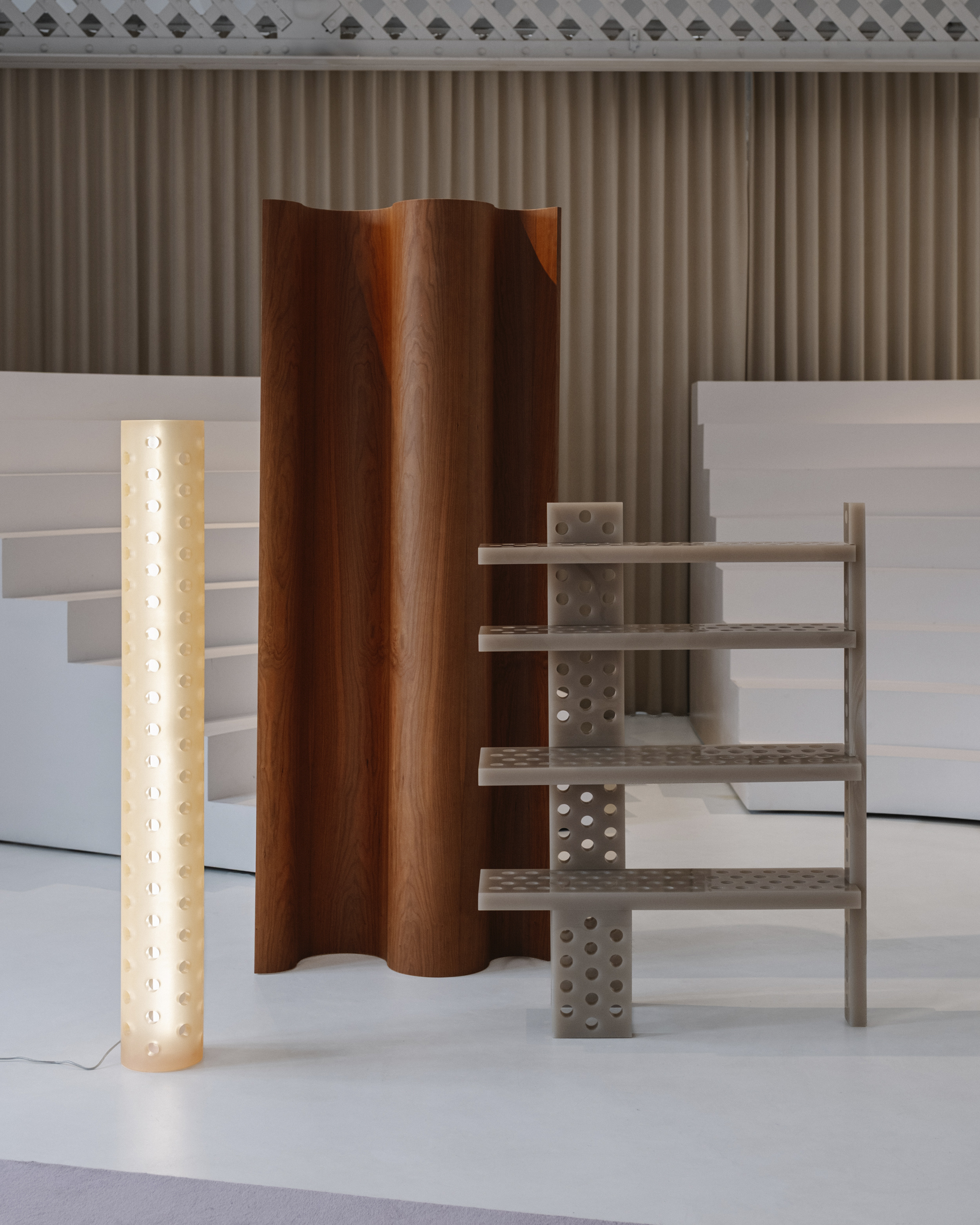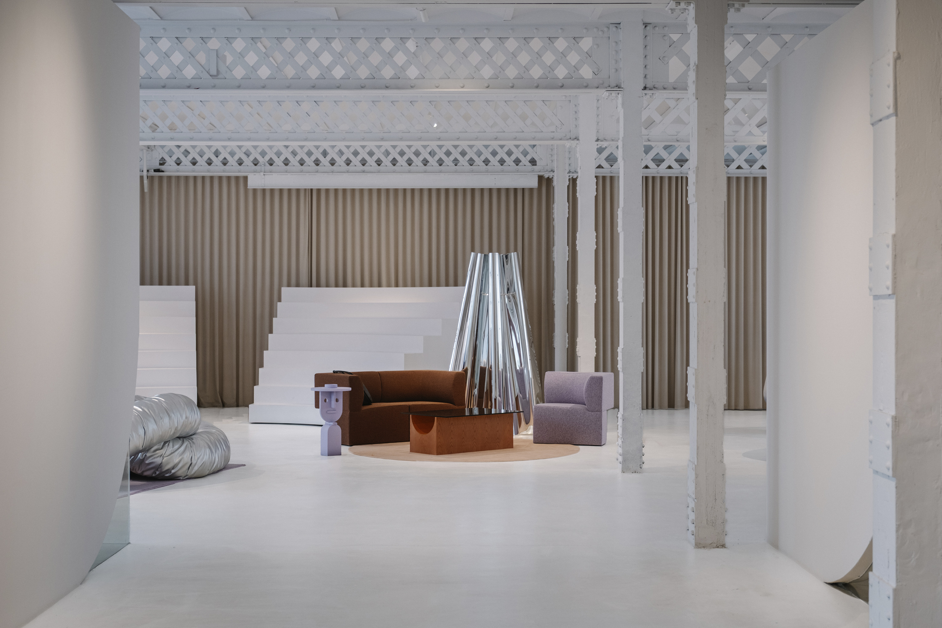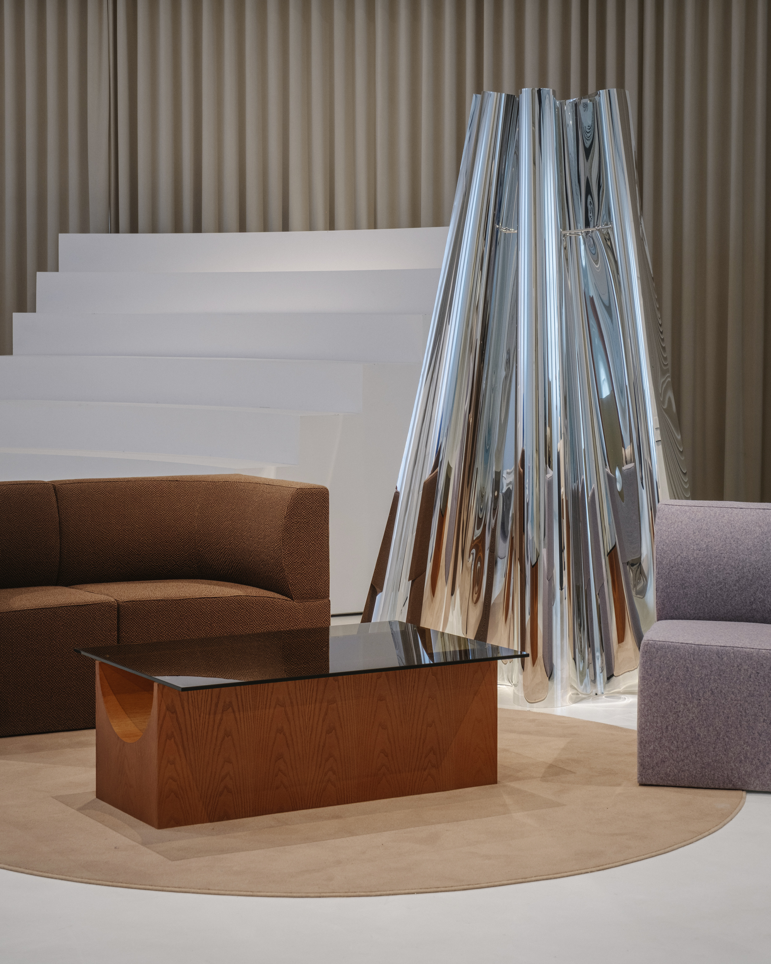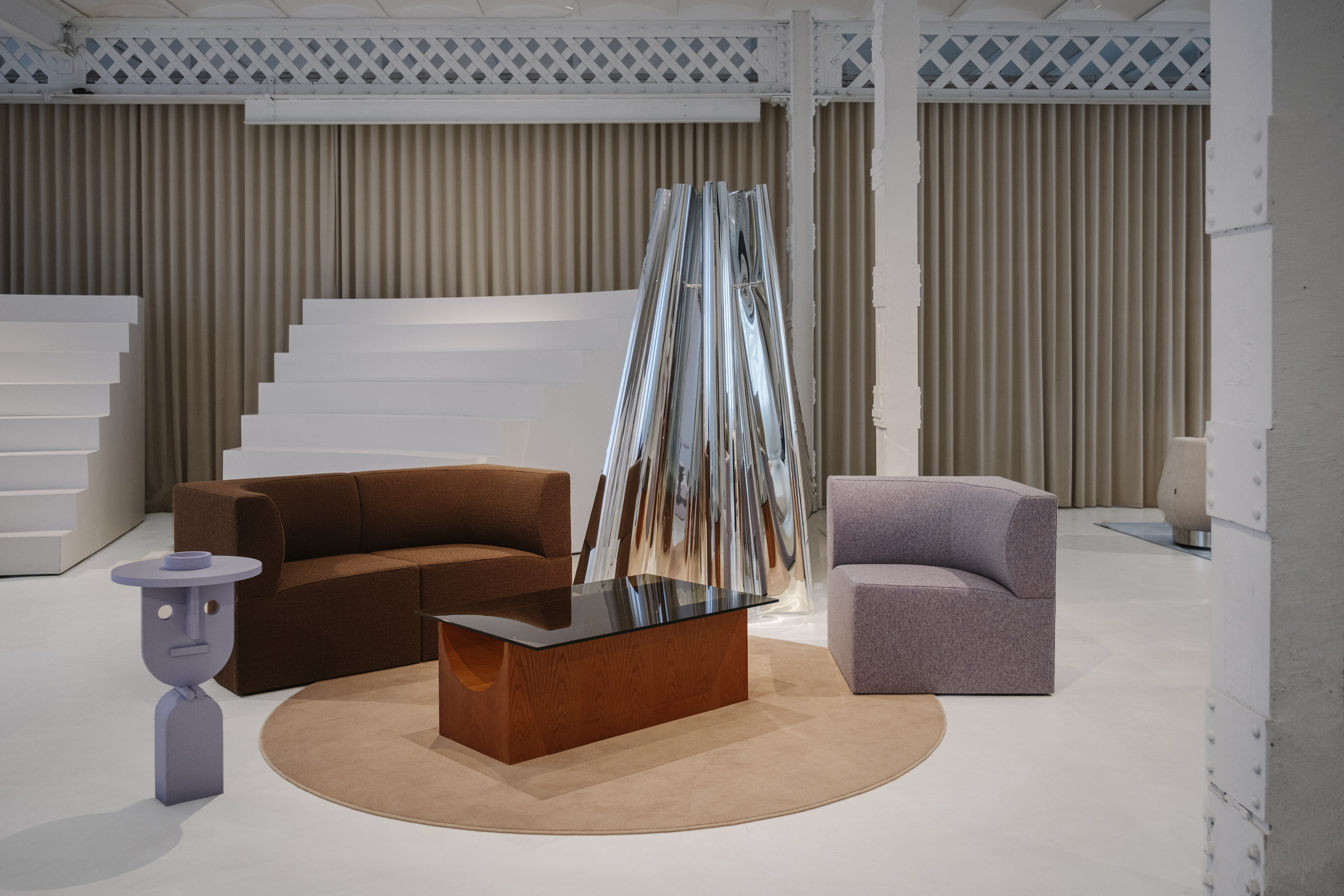 이 공간은 섬으로 구성되어 가정적인 환경이 아닌 미술관의 언어를 연상시킵니다. Isern은 "각 러그에는 색상, 모양, 요소가 선택적으로 큐레이션되어 예술 작품 전시로 변신합니다."라고 말합니다. 이 공간을 위해 독점적으로 제작된 러그는 각 영역을 정의하고 작품의 조각적 존재감을 강화하는 배경 역할을 합니다. 공간을 산업적 중립성으로 감싸는 바닥과 벽과 대조적으로, 네 가지 세팅은 색채적 접근 방식을 통해 작품에 주목하게 합니다. 입구에 위치한 Neutral-Natural Island는 나무 Vestige 테이블과 같은 천연 소재와 Canto 좌석 실내 장식의 질감과 색조를 결합합니다. 이 섬에는 Vasto의 두 가지 작품인 Mesh Lamp와 Folded Sculptures도 있습니다. 베이지와 크림 톤이 지배적인 Día(낮) Island는 원단과 패턴으로 놀고 있습니다. 이 세팅에는 Fiesta Día 직물로 덮인 Vibe 소파, 베이지색 가죽의 Tortuga 안락의자, Vesper 사이드 테이블, Elle Mini 라운지 의자가 포함됩니다. Isern Serra의 팀이 디자인하고 Fusteria Vidal이 제작한 물결 무늬 오크 스크린은 건축적 요소를 더합니다.