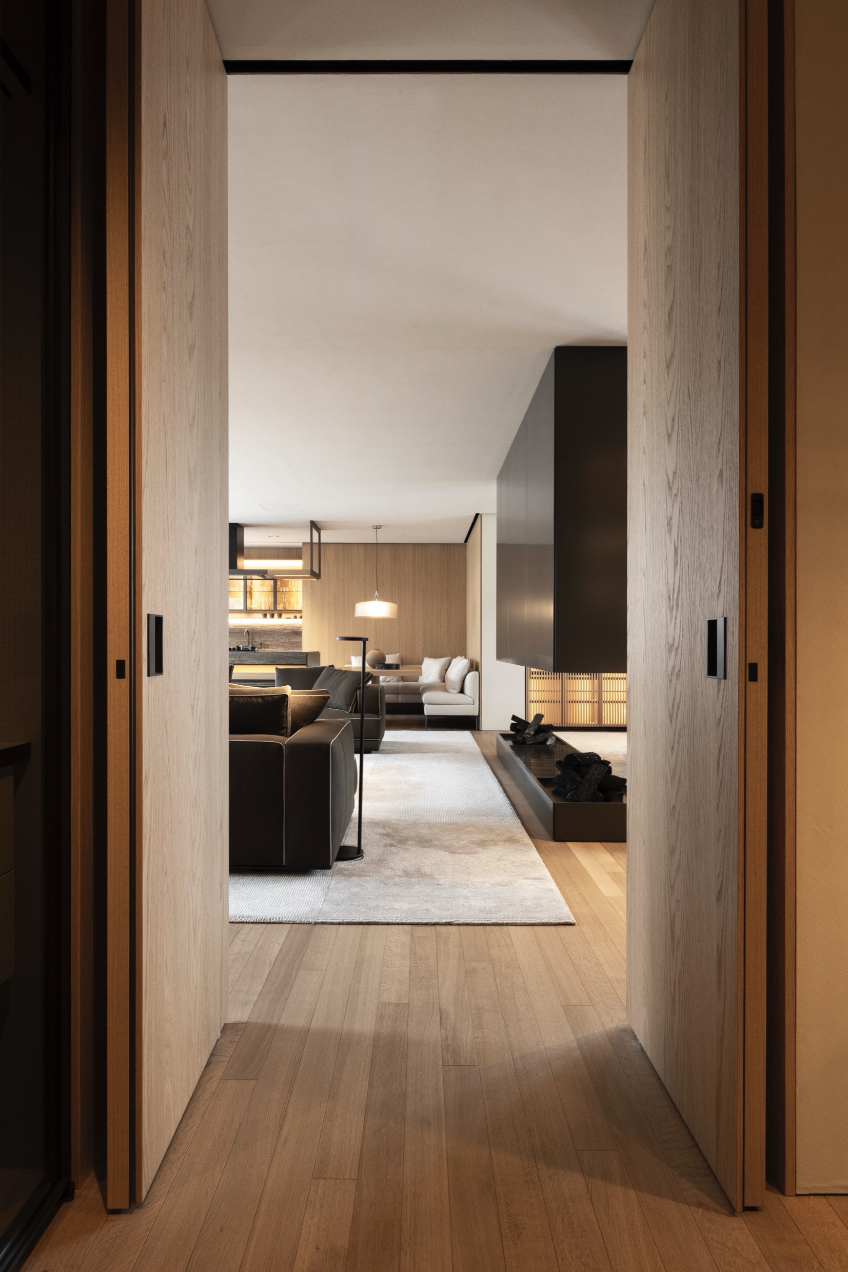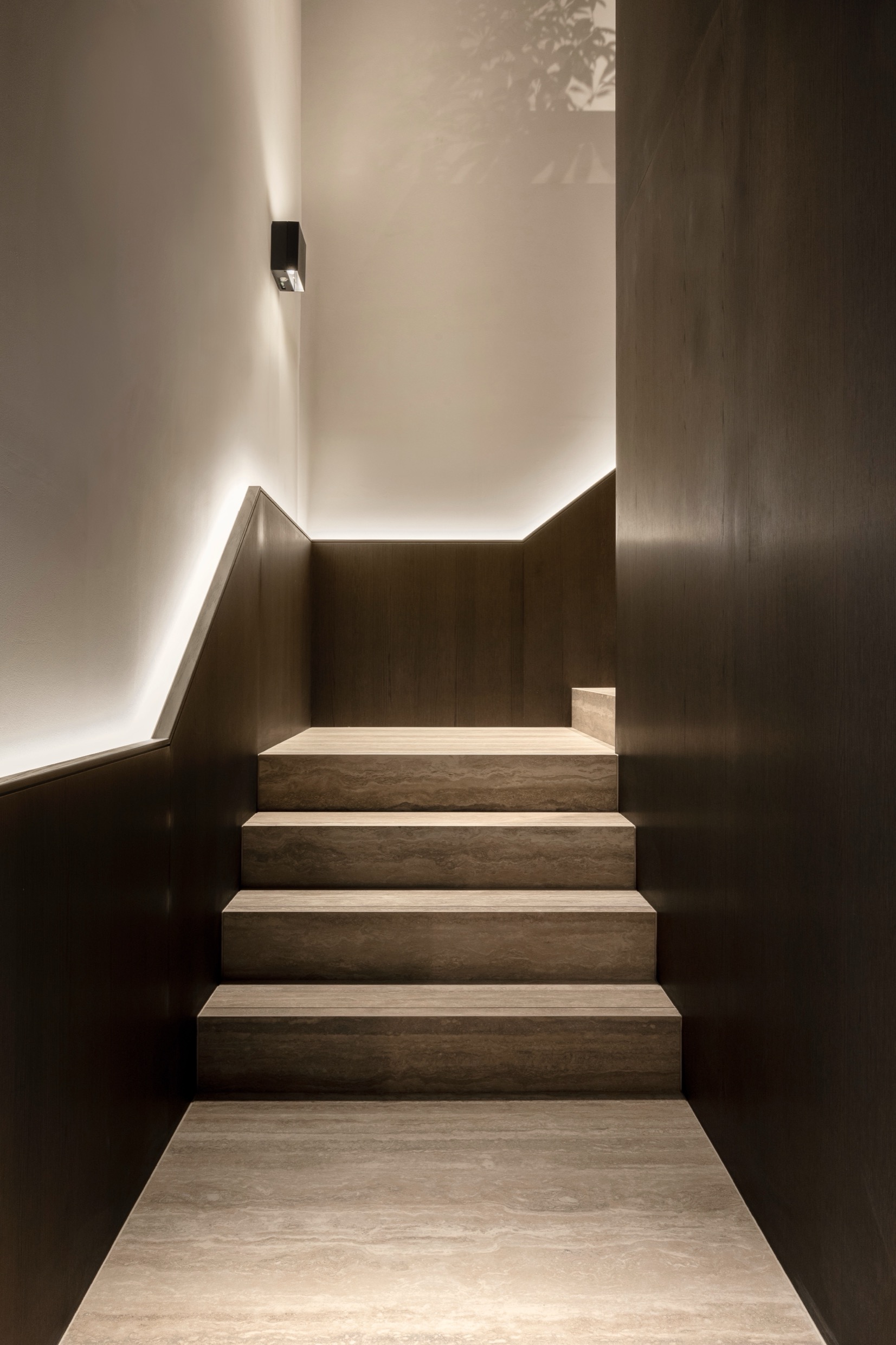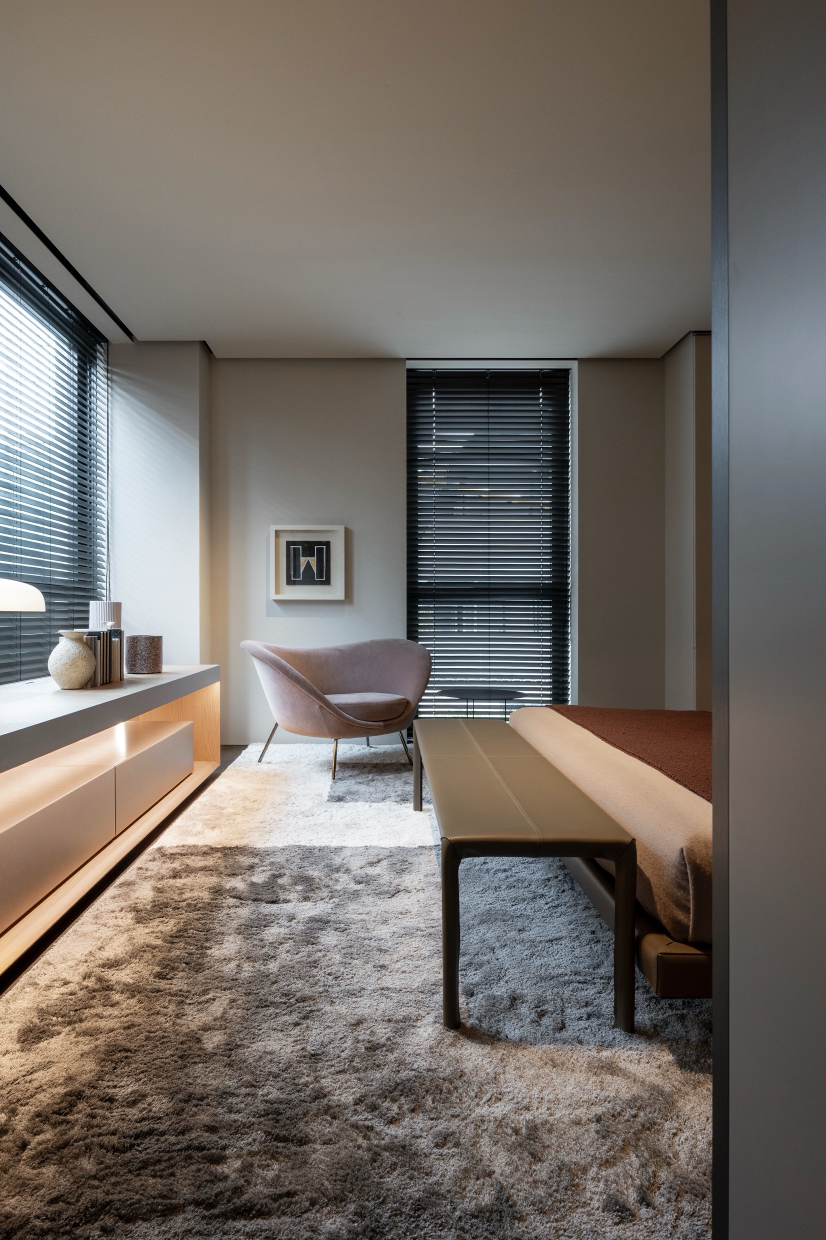 건물 외관은 마치 하나의 모놀리식 블록에서 조각된 듯한 느낌을 주며, 대담한 매스와 여백, 금속 디테일이 조화를 이루어 시각적 깊이와 리듬감을 전달합니다. 내부는 자연 채광을 극대화할 수 있도록 설계되었으며, 각 층은 실제 주거 공간처럼 구성되어 몰테니앤씨가 추구하는 삶의 철학을 직접 체험할 수 있도록 하였습니다. 1층은 고급스러운 응접실 개념으로, 방문객을 맞이하는 공간이자 리빙과 다이닝 공간이 자연스럽게 연결됩니다. 대표적인 가구 컬렉션인 아우구스토(Augusto), 클레오(Cleo), 서프(Surf) 소파와 함께, Gio Ponti의 헤리티지 컬렉션도 함께 전시되어 브랜드의 역사성과 현대성이 공존하는 모습을 보여줍니다. 지하층은 좀 더 대중적인 공간으로, 주방과 라운지가 하나의 열린 공간으로 구성되어 있으며, 셰프의 디너 파티나 칵테일 리셉션 등을 여는 데 적합한 구조입니다. 반면, 상층으로 올라가면 보다 개인적인 공간이 펼쳐지며, 마스터 베드룸과 드레스룸, 프라이빗 라운지가 독립적으로 배치되어 있습니다.