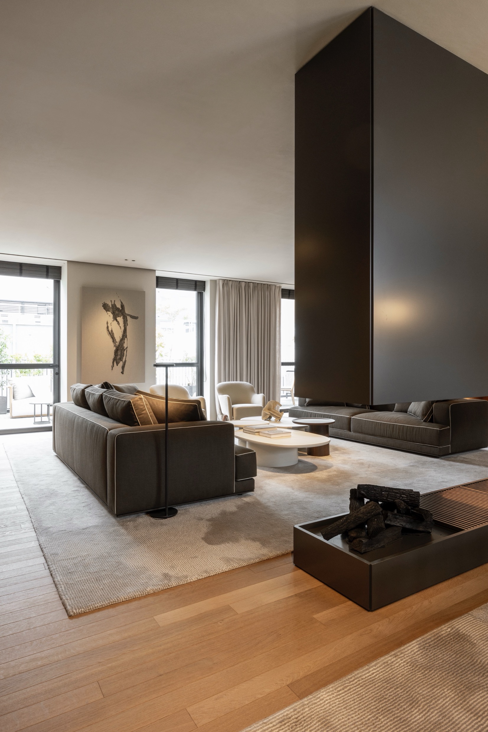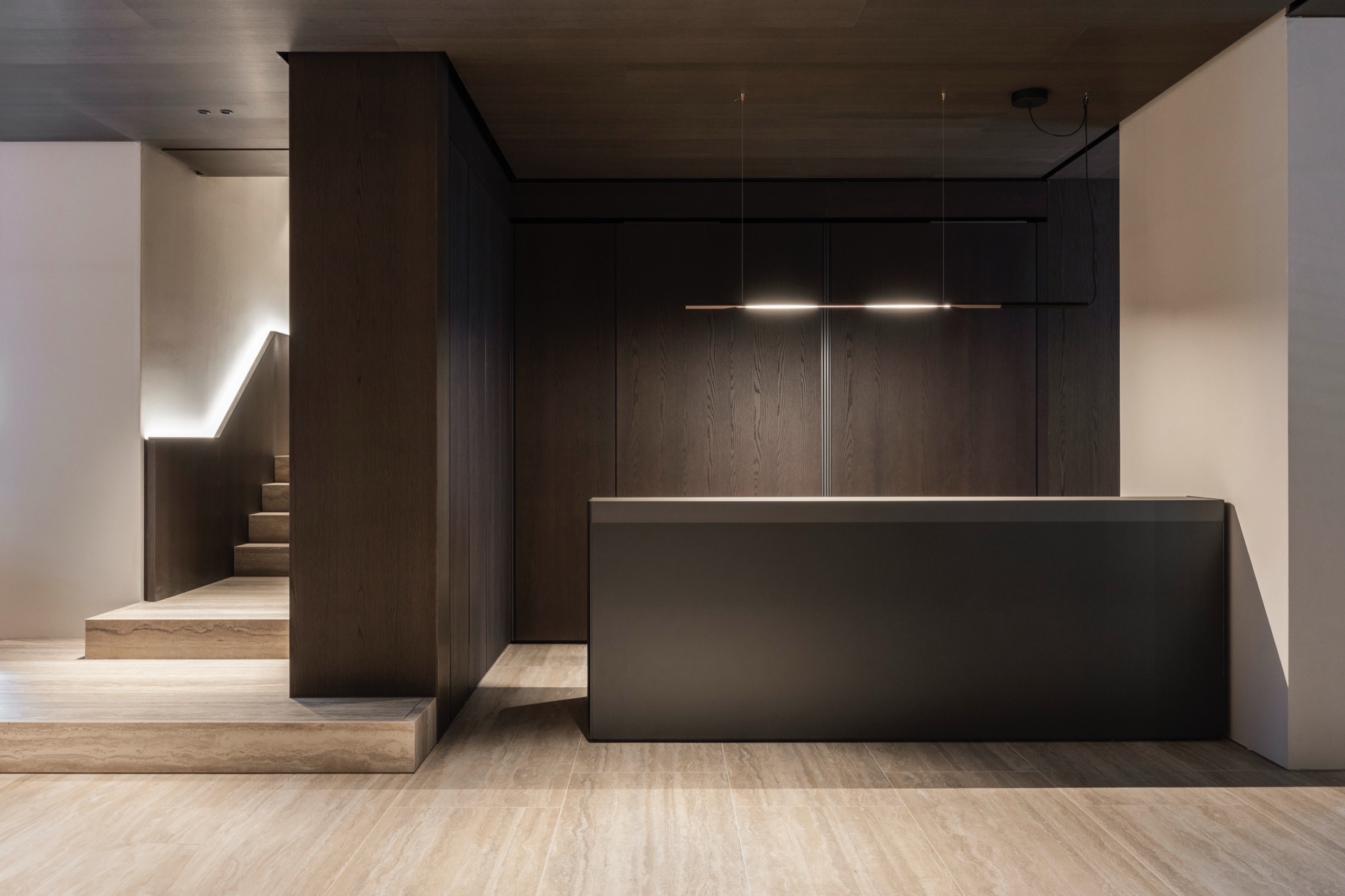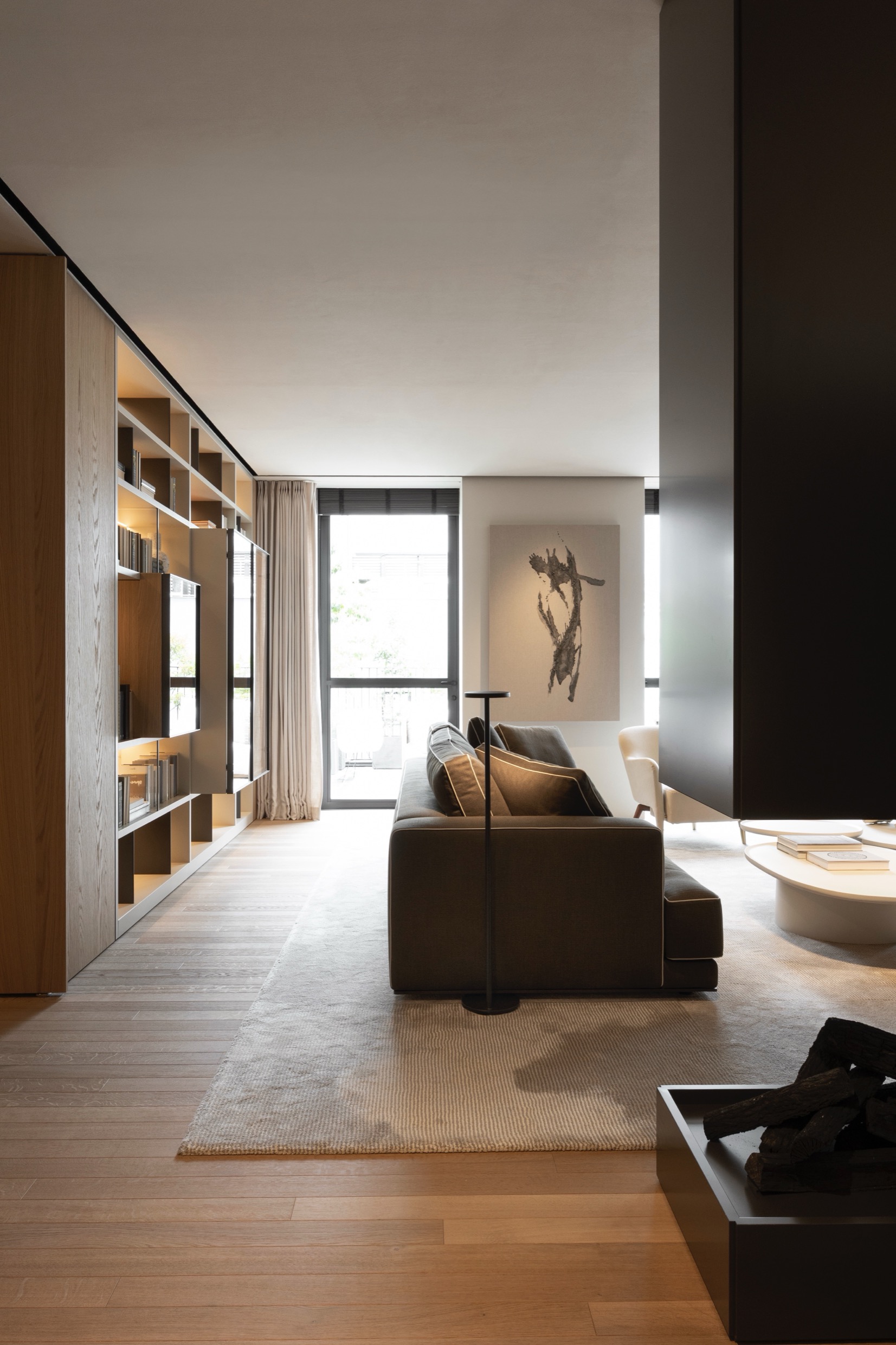 건물 외관은 마치 하나의 모놀리식 블록에서 조각된 듯한 느낌을 주며, 대담한 매스와 여백, 금속 디테일이 조화를 이루어 시각적 깊이와 리듬감을 전달합니다. 내부는 자연 채광을 극대화할 수 있도록 설계되었으며, 각 층은 실제 주거 공간처럼 구성되어 몰테니앤씨가 추구하는 삶의 철학을 직접 체험할 수 있도록 하였습니다. 1층은 고급스러운 응접실 개념으로, 방문객을 맞이하는 공간이자 리빙과 다이닝 공간이 자연스럽게 연결됩니다. 대표적인 가구 컬렉션인 아우구스토(Augusto), 클레오(Cleo), 서프(Surf) 소파와 함께, Gio Ponti의 헤리티지 컬렉션도 함께 전시되어 브랜드의 역사성과 현대성이 공존하는 모습을 보여줍니다. 지하층은 좀 더 대중적인 공간으로, 주방과 라운지가 하나의 열린 공간으로 구성되어 있으며, 셰프의 디너 파티나 칵테일 리셉션 등을 여는 데 적합한 구조입니다. 반면, 상층으로 올라가면 보다 개인적인 공간이 펼쳐지며, 마스터 베드룸과 드레스룸, 프라이빗 라운지가 독립적으로 배치되어 있습니다.