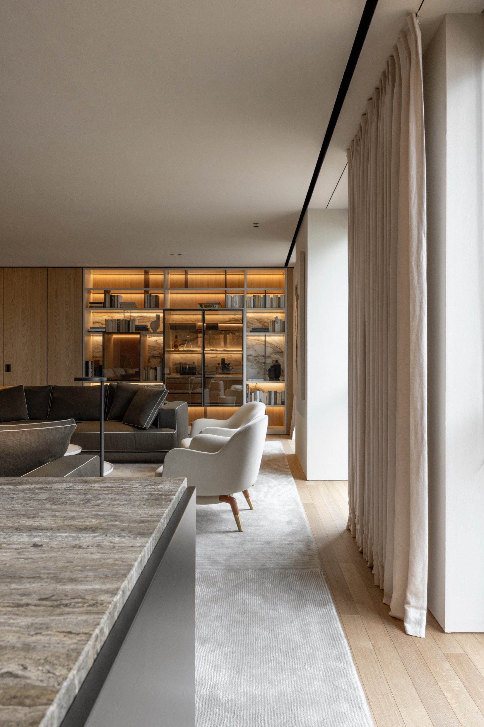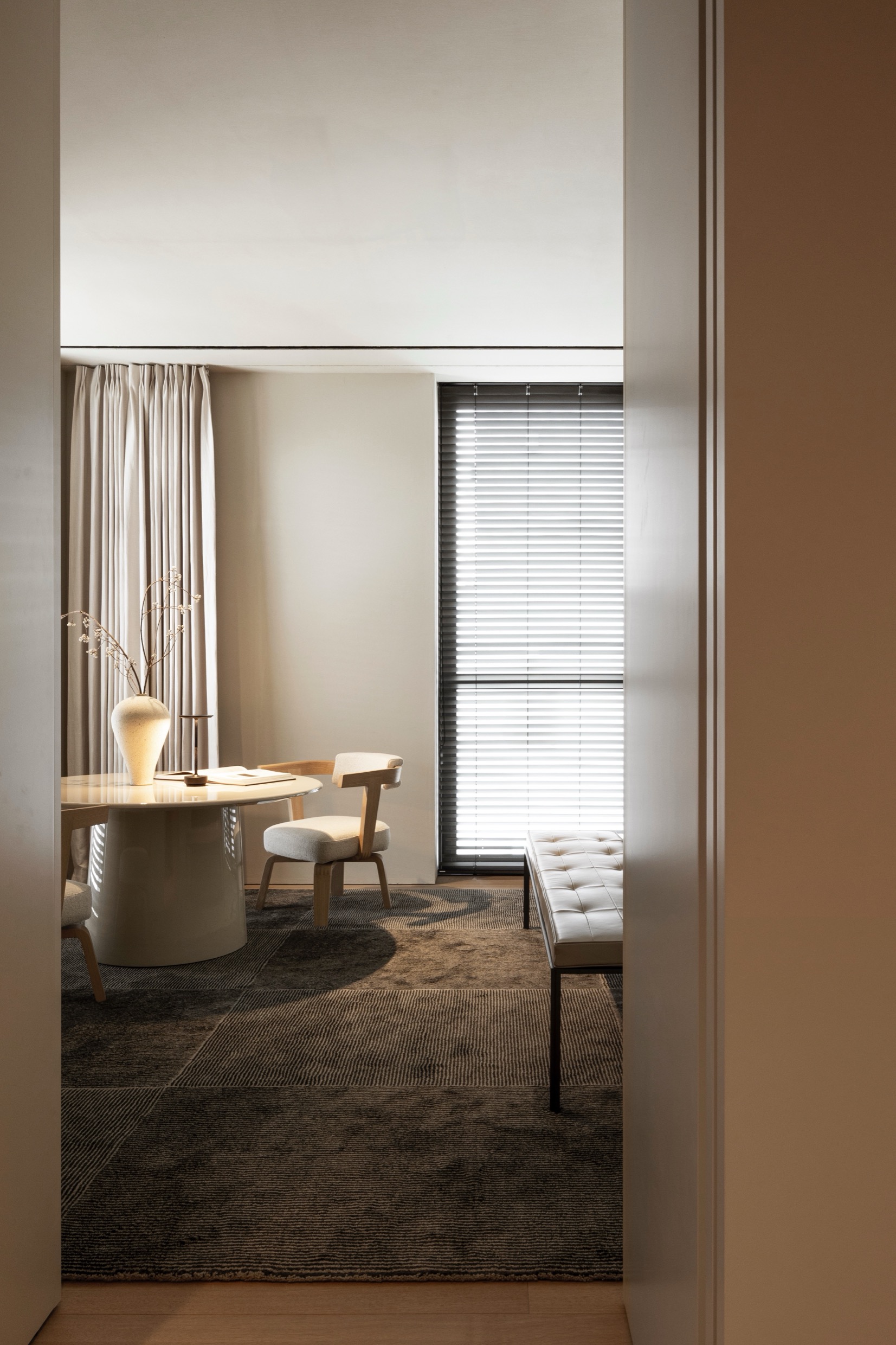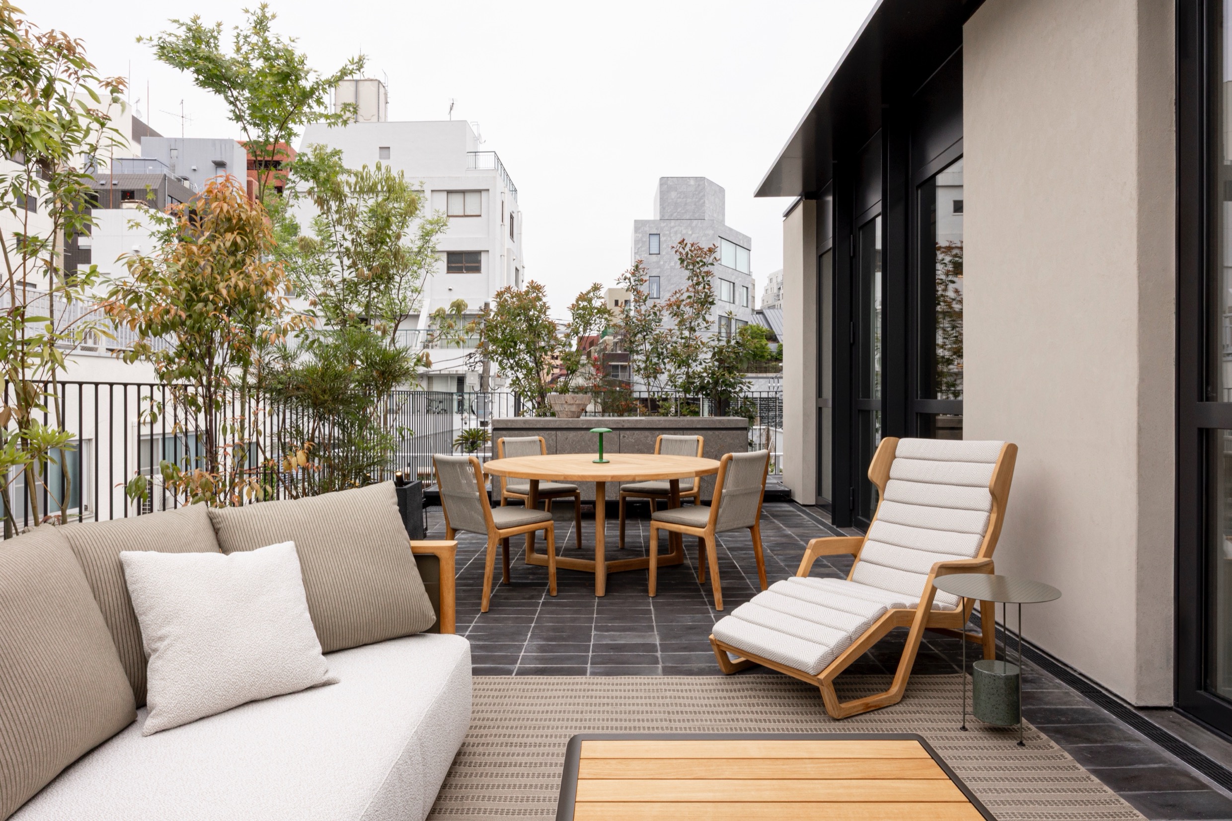 최상층에는 몰테니앤씨가 자랑하는 **‘몰테니 아파트(Molteni Apartment)’**가 자리잡고 있습니다. 약 160㎡ 규모로 구성된 이 프라이빗 공간은 VIP 고객 및 파트너를 위한 환영 공간으로, 반 두이센 디렉터의 건축 철학이 가장 순수하게 구현된 곳입니다. 이곳은 그의 시그니처 디자인인 VVD 키친과 함께, 고전과 현대를 연결하는 철학이 반영된 D.859.1 테이블, D.151.4 암체어, 그리고 최신작인 루이자(Louisa) 커피 테이블, 아우구스토 소파 등이 조화롭게 배치되어 있습니다. 테라스에는 몰테니앤씨의 아웃도어 컬렉션이 전시되어, 도심 속에서도 자연과 교감할 수 있는 여유로운 분위기를 연출합니다.