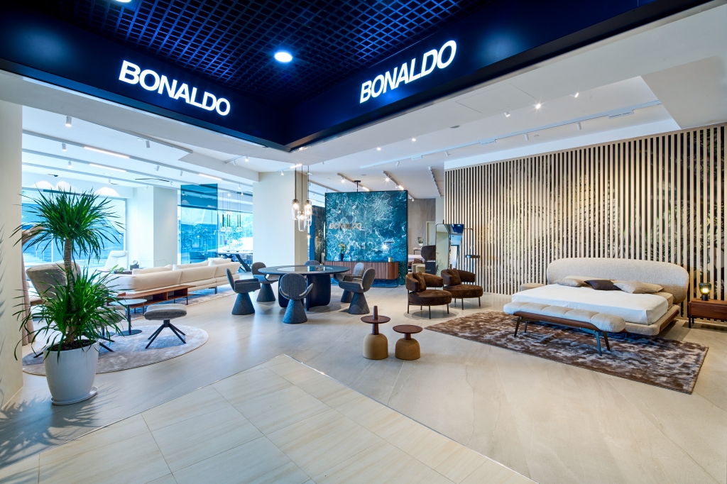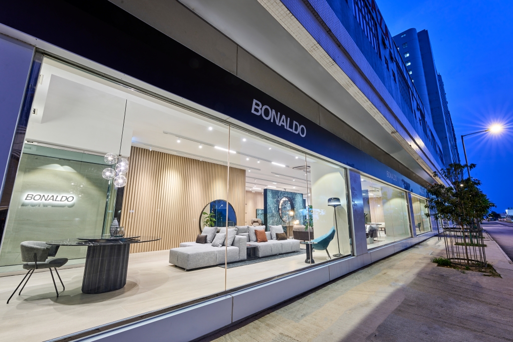 대형 창문을 통해 거실과 다이닝 환경이 번갈아 가며 드러나며, 쇼룸 내부에서는 일관되고 균형 잡힌 언어를 통해 개별 제품 간, 제품과 배치된 공간 간의 연결을 만들어내는 보날도의 코디 가구 프로그램인 B/Style의 기치 아래 야간 공간에 대한 제안을 단계별로 살펴볼 수 있습니다.