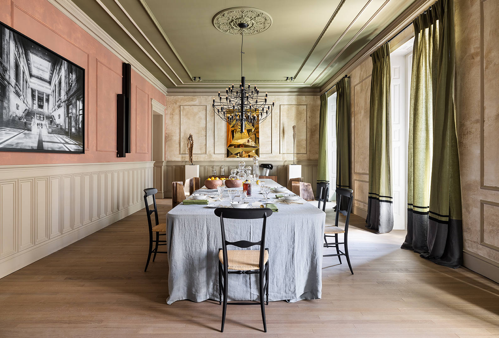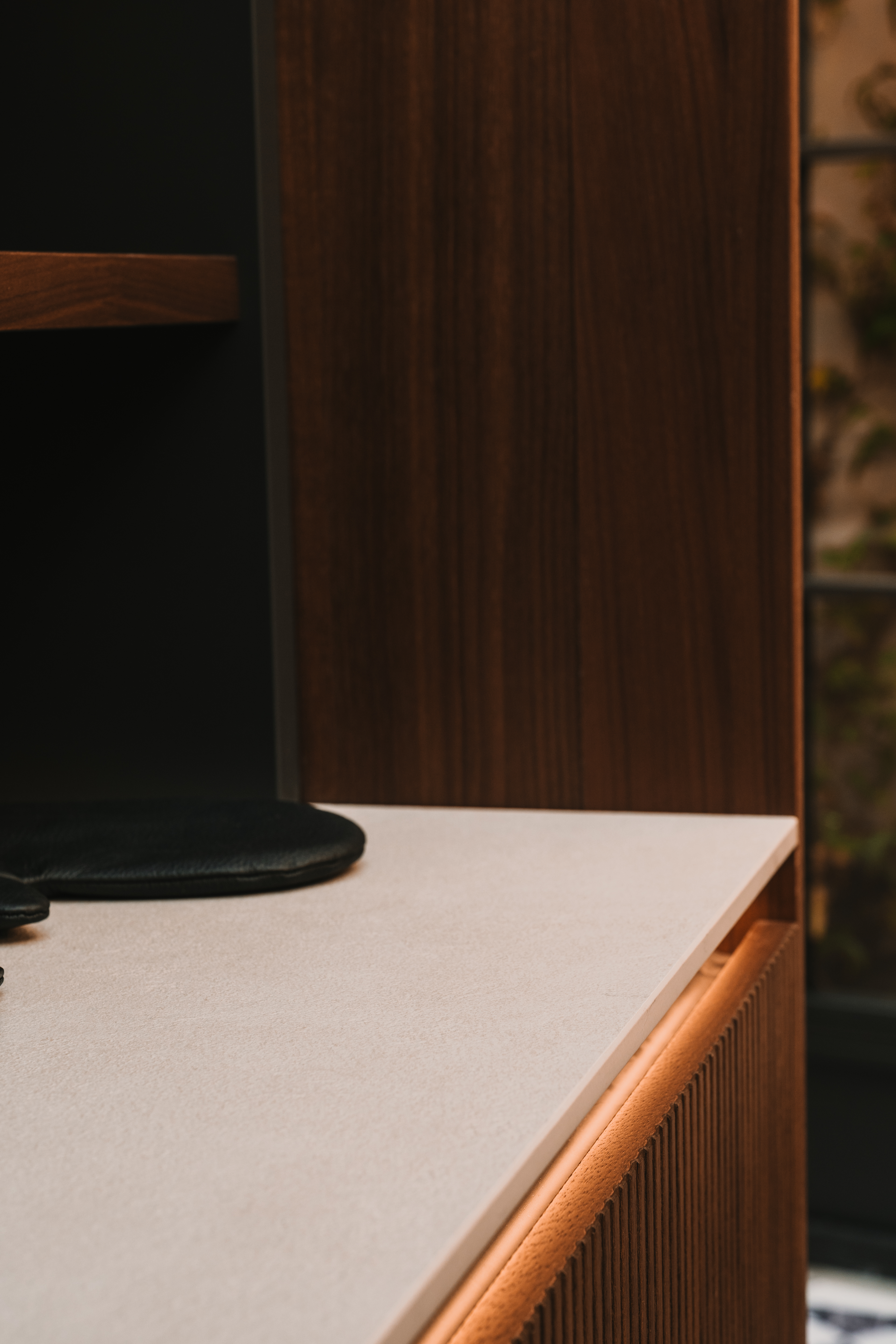 이 공간은 이탈리아 장인의 전통과 현대적 감각이 공존하는 상징적인 장소입니다. 중심에는 SapienStone의 ‘Arabescato 4D’ 세라믹 상판으로 제작된 테이블이 배치되어 있으며, 곡선형 엣지 마감(costa riplo arrotondato)이 적용되어 품격을 더하고 있습니다. 공간의 한쪽은 미래지향적인 미감, 다른 한쪽은 이탈리아 가정의 따뜻한 전통을 표현하고 있어 방문자 여러분께 감성적인 여운을 남깁니다.