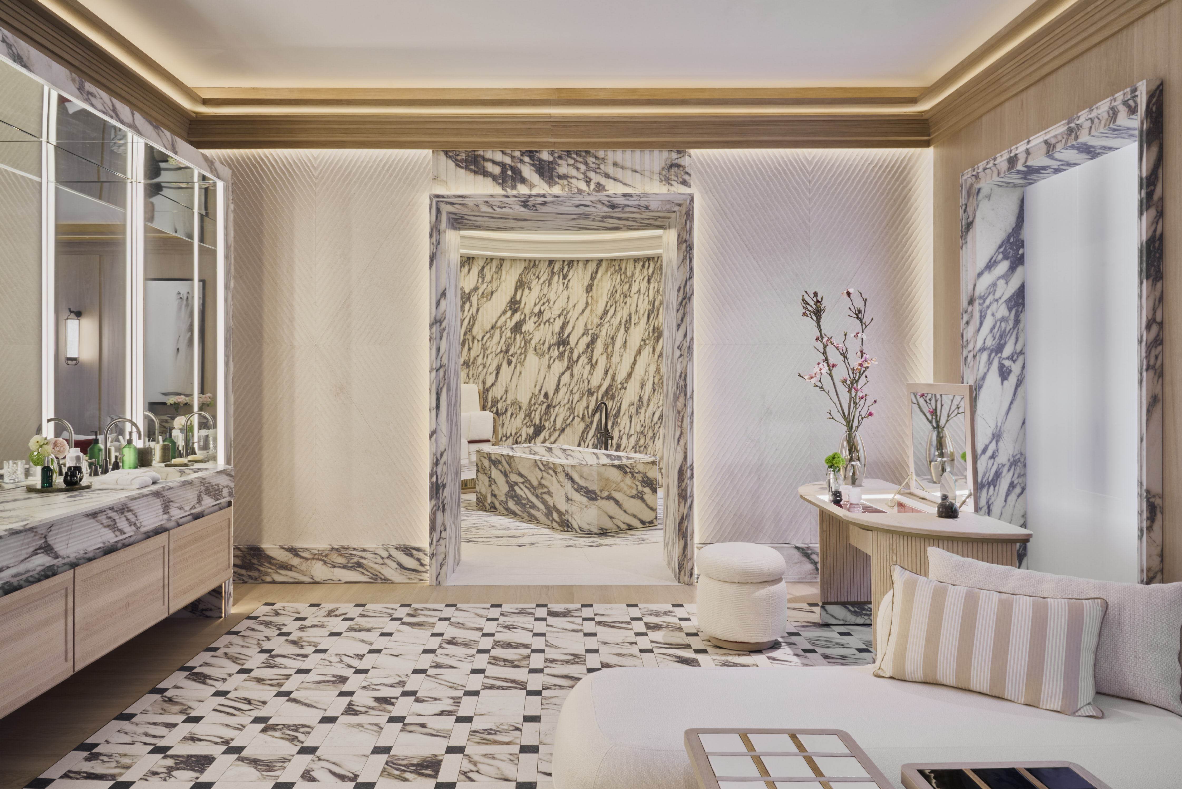 ‘Dress Code’는 프랑스 파리의 영원한 우아함에서 영감을 받아 디자인된 럭셔리 욕실 컬렉션입니다. 고전적인 프랑스 카보숑(Cabochon) 패턴을 세라믹 소재로 재해석하고, 입체적 주름 텍스처를 통해 마치 고급 맞춤복의 원단처럼 섬세한 표현을 구현하였습니다. 이 공간에는 세면대, 욕조, 벽면, 바닥까지 SapienStone의 다양한 소재가 적용되어 공간 전체에 통일성과 예술성을 부여하고 있습니다.
