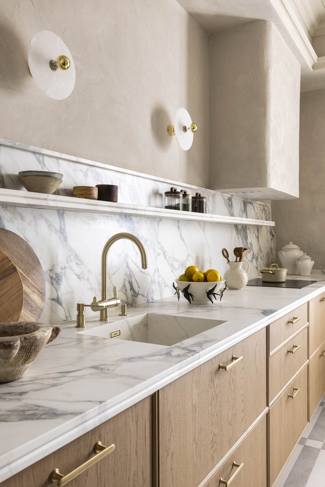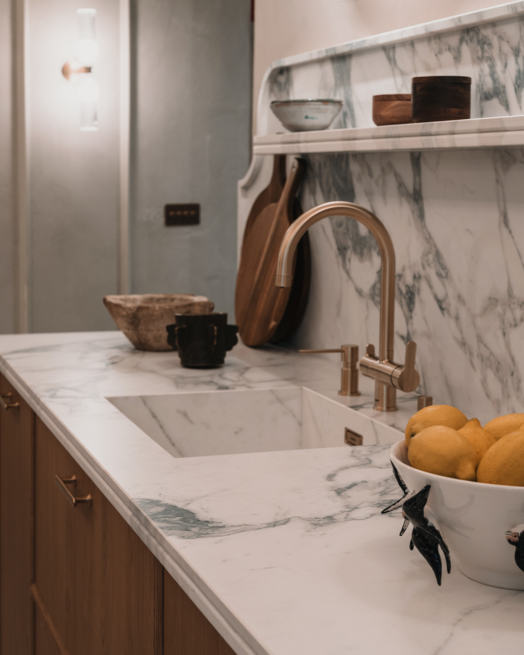 주방을 단순한 기능의 공간이 아닌 감성과 교감의 중심으로 재해석한 이 공간에서는, SapienStone의 ‘Arabescato 4D’가 조리대, 벽면 선반, 아일랜드 바 영역 전반에 걸쳐 사용되었습니다. 부드러운 텍스타일과 분위기 조명, 나무 소재와의 조화는 사용자에게 깊은 휴식과 따뜻한 분위기를 제공하며, 집 안에서 가장 감성적인 공간으로 기능합니다.