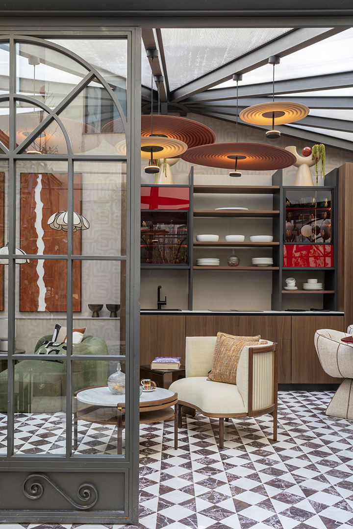 이 공간은 신고전주의 양식과 최첨단 기술의 균형이 절묘하게 어우러진 정원 컨셉의 라운지 공간입니다. 정원 속 유리 온실 구조에는 SapienStone의 ‘Balance Light Grey’ 세라믹 조리대가 설치되었으며, 바닥은 Rosso Lepanto와 Premium White 조합으로 격자 패턴을 이루고 있습니다. 외부 계단 옆에는 ‘Balance Marsala Red’ 컬러가 고급스러운 정원 경계석 역할을 하며 조화로운 외관을 완성하였습니다.