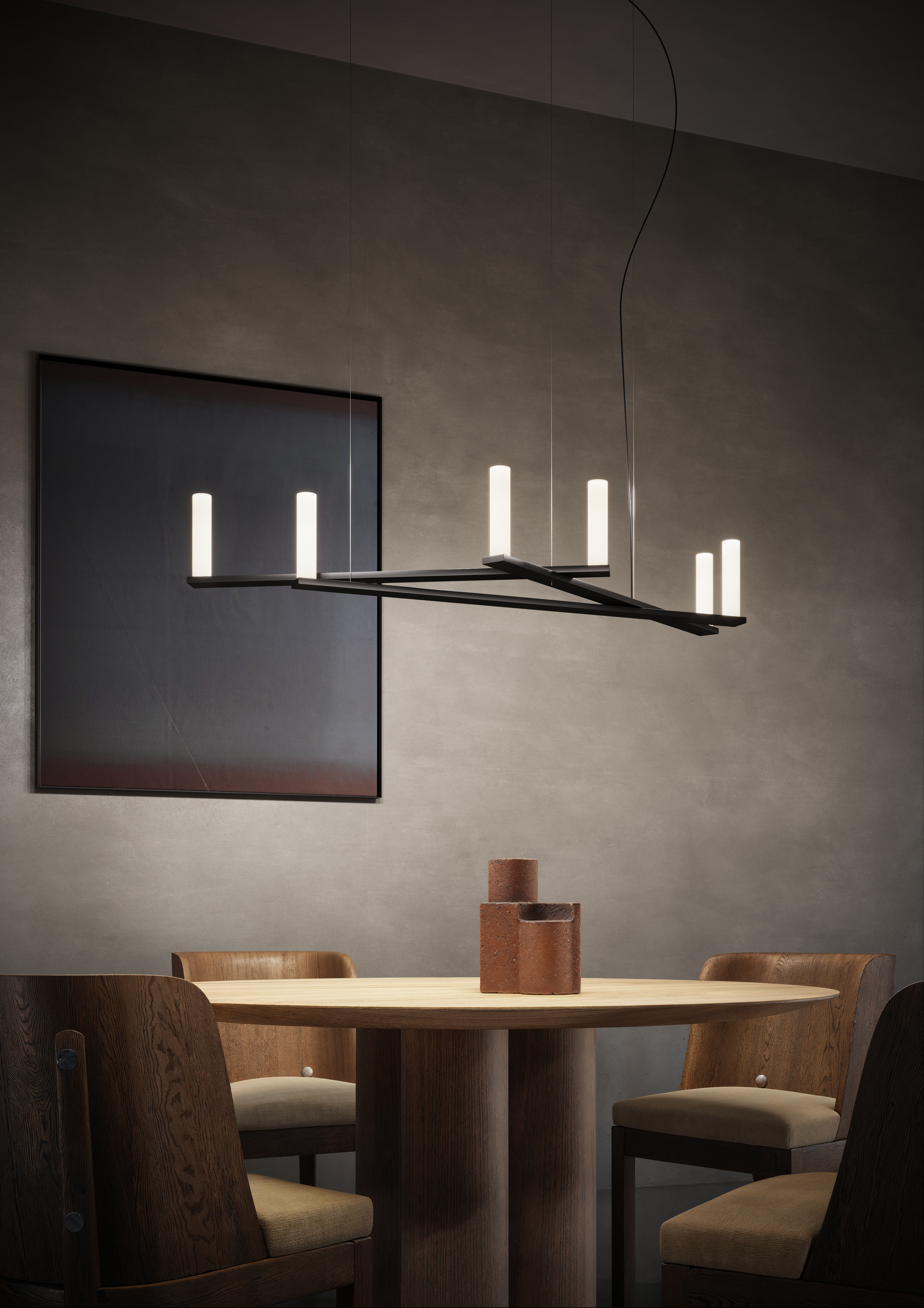 루체플랜은 이번 전시에서 기존의 장식 조명을 넘어 건축적 조명의 영역까지 확장된 컬렉션을 제안하였습니다. 브랜드의 대표 기술 중 하나인 슬림 트랙 시스템은 유연한 조합이 가능하며, 디자이너의 감각을 반영한 다양한 조명 기구와의 결합을 통해 실내 공간 설계에 보다 창의적이고 직관적인 접근을 가능하게 합니다. 특히 Meneghello Paolelli의 ‘Doi spot’, Zambelli의 ‘Alibel’, 그리고 Mandalaki Studio의 ‘Hono’ 수직형 펜던트 버전은 이 트랙 시스템과의 완벽한 조화를 이루며, 실용성과 조형미를 동시에 만족시키는 조명 솔루션으로 주목받았습니다.