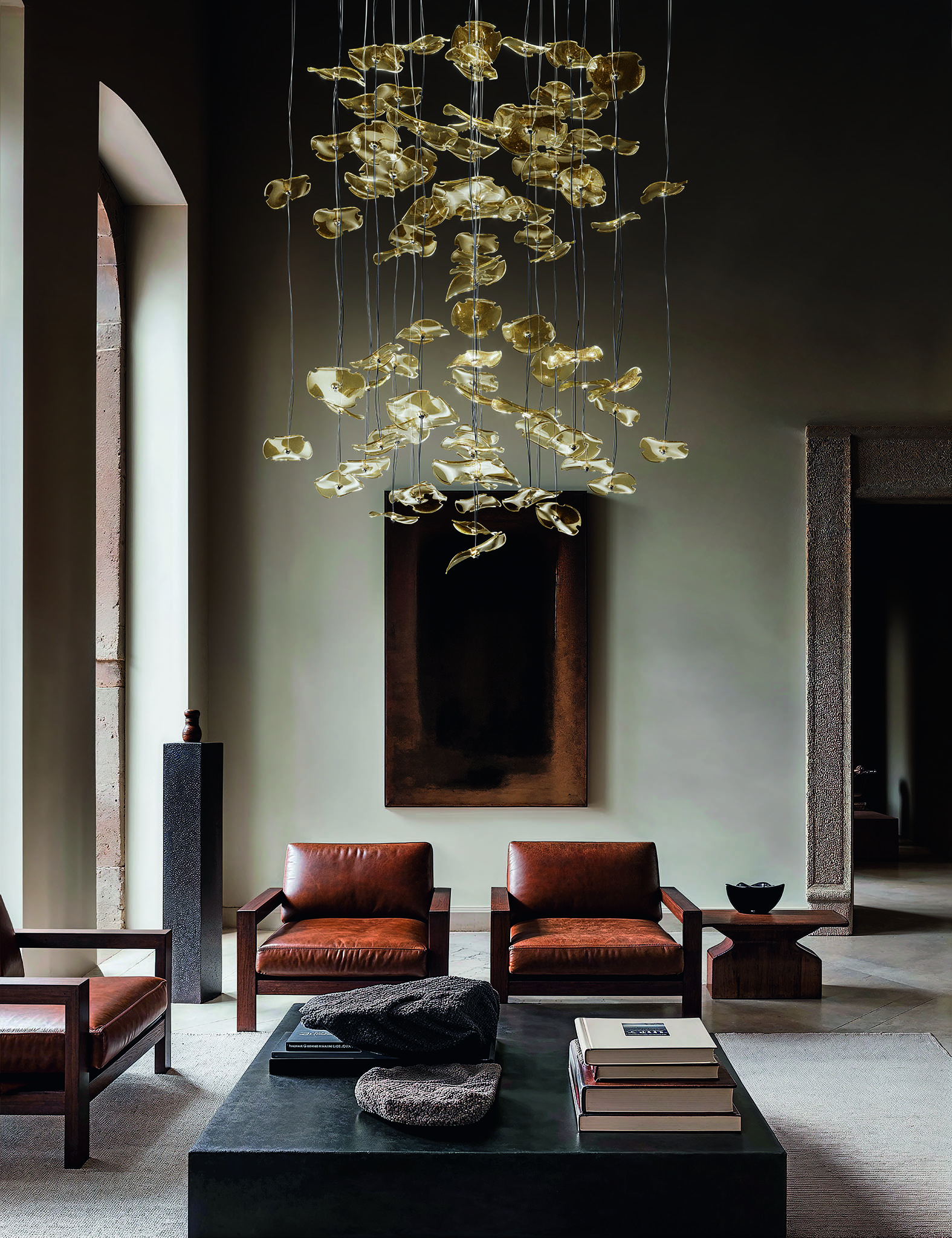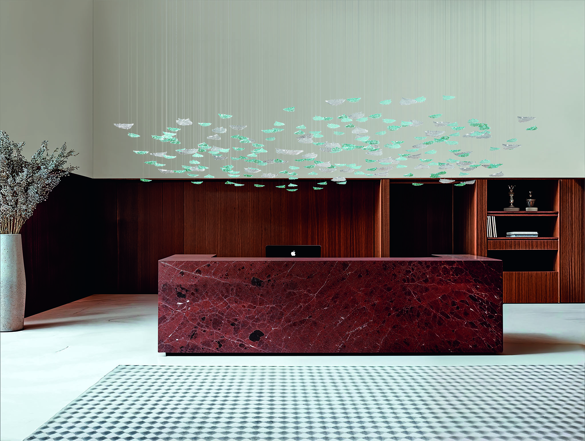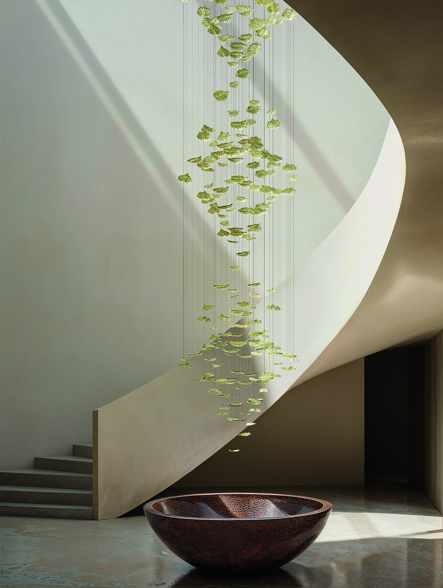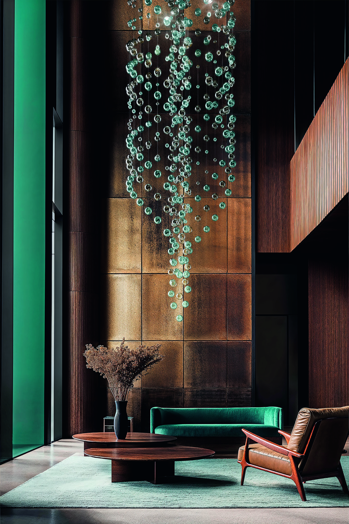 이번 컬렉션은 맞춤형 인스톨레이션에 대한 헌정으로, 건축적 공간을 섬세하게 채우는 유리의 조형 언어를 주제로 하고 있습니다. 중심에는 ‘모듈러 디자인’이라는 개념이 있습니다. 작은 유리 조각 하나하나—구체, 잎사귀, 마름모—가 리듬감 있는 배열 속에서 공간 전체를 아우르는 스케일로 확장됩니다. 이러한 반복과 조합은 시각적으로 경이로운 구성을 이끌며, 프로젝트마다 완전히 새로운 생명력을 부여합니다.