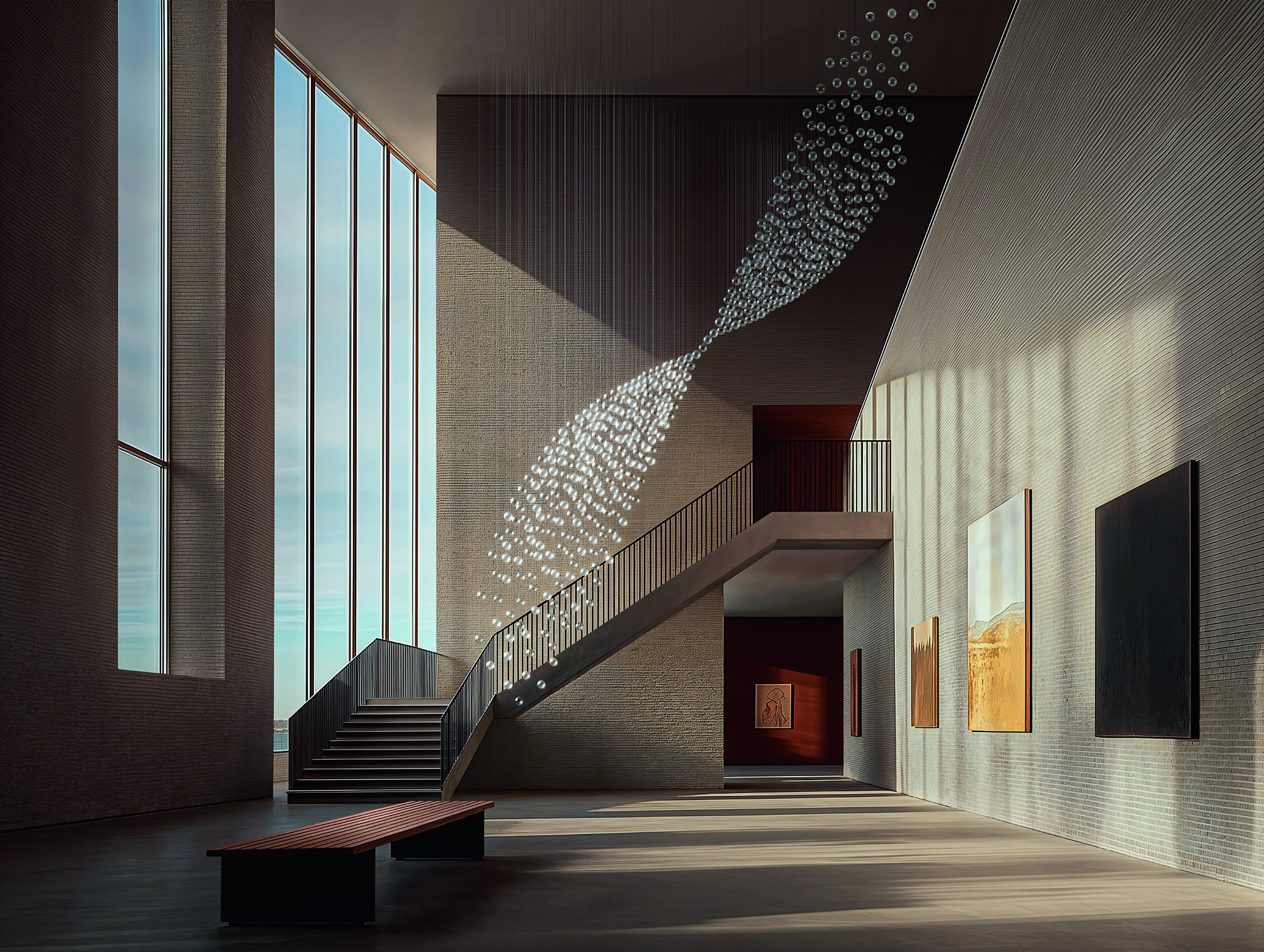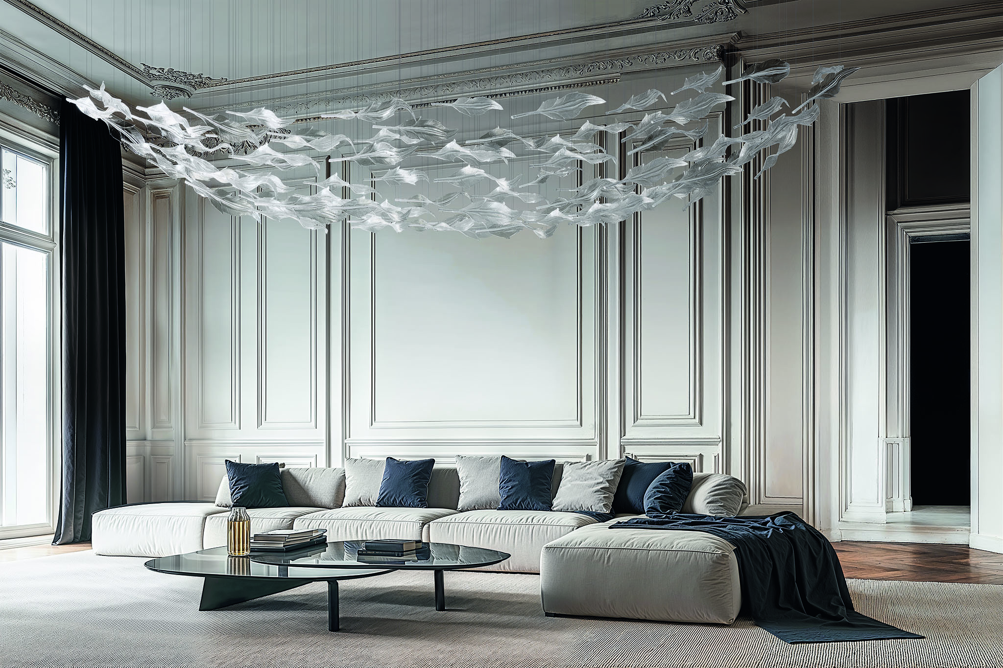특히 주목할 만한 점은 거의 보이지 않는 ‘서스펜디드 케이블 시스템’입니다. 이 가느다란 구조는 유리 요소들이 공중에 떠 있는 듯한 극도로 가벼운 구조물을 가능하게 하며, 결과적으로 각 인스톨레이션을 마치 유리로 만든 구름처럼 공간에 띄웁니다. 자연광 또는 인공광 아래에서 반짝이는 유리는 주변 건축물의 아름다움을 증폭시키는 조형적 장치로 작용합니다.